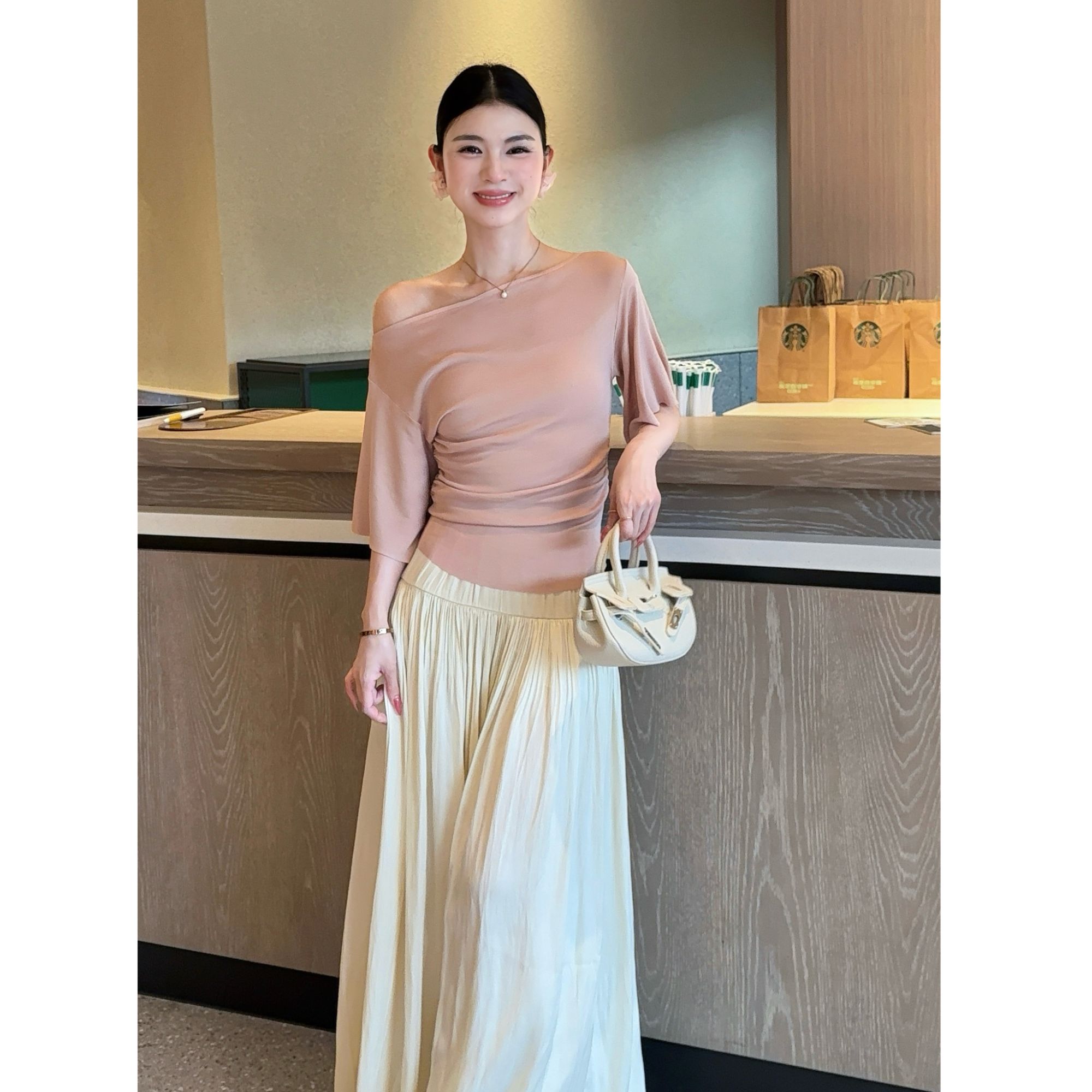 있음 도착 한국 스타일 비스듬한 어깨 니트 스웨터 여성 2026 여름 몸매 가꾸기 슬림해 보이는 반팔 맨위 Chic