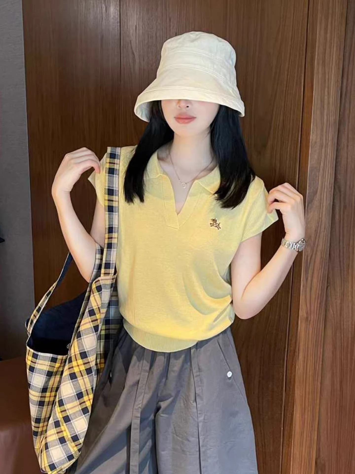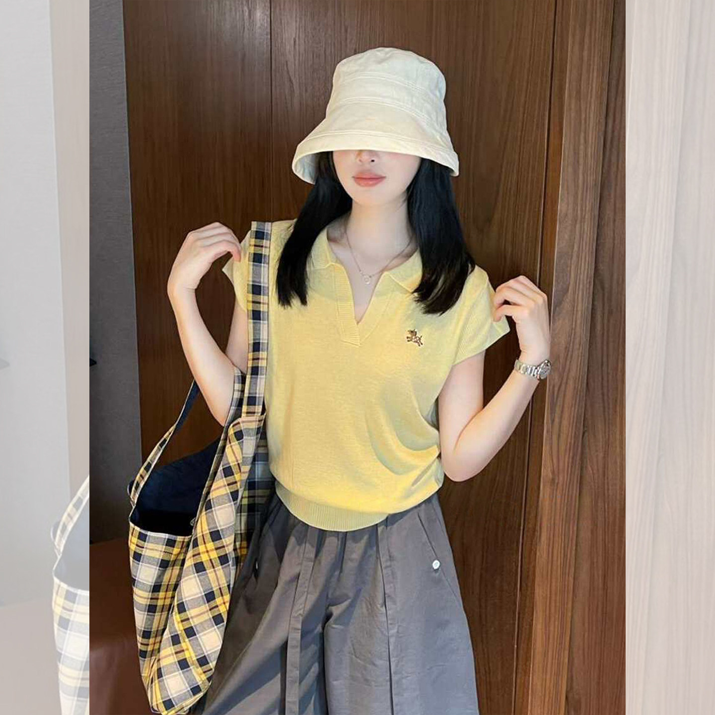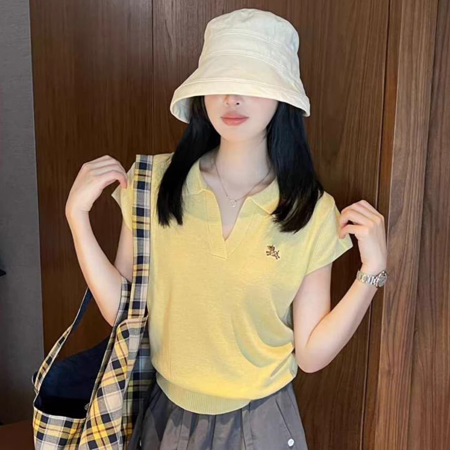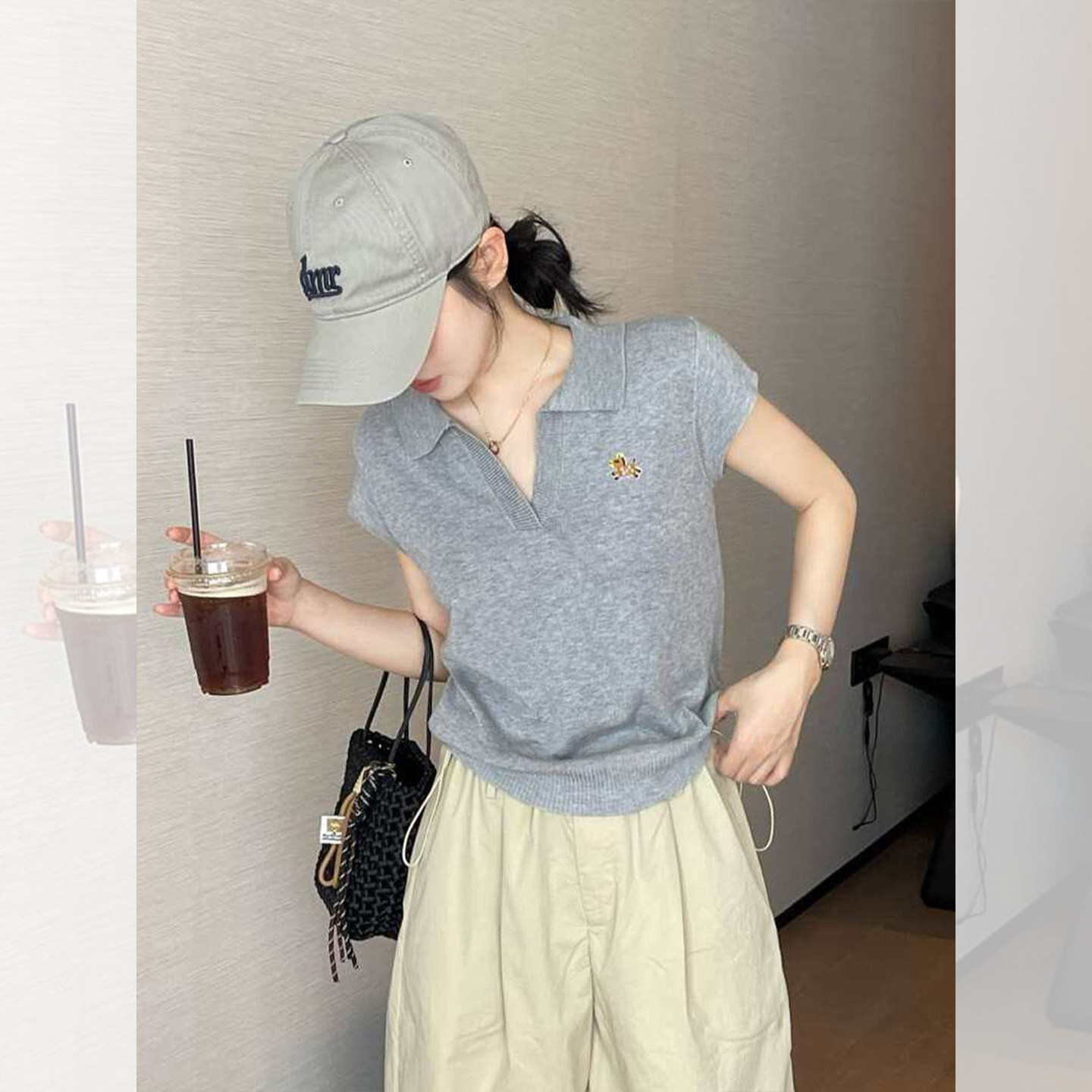 2026 봄 여름 한 부서 POLO 칼라 양모 반팔 니트 스웨터 여성 u 칼라 얇은 스타일 슬림해 보이는 다용도 티셔츠 맨위