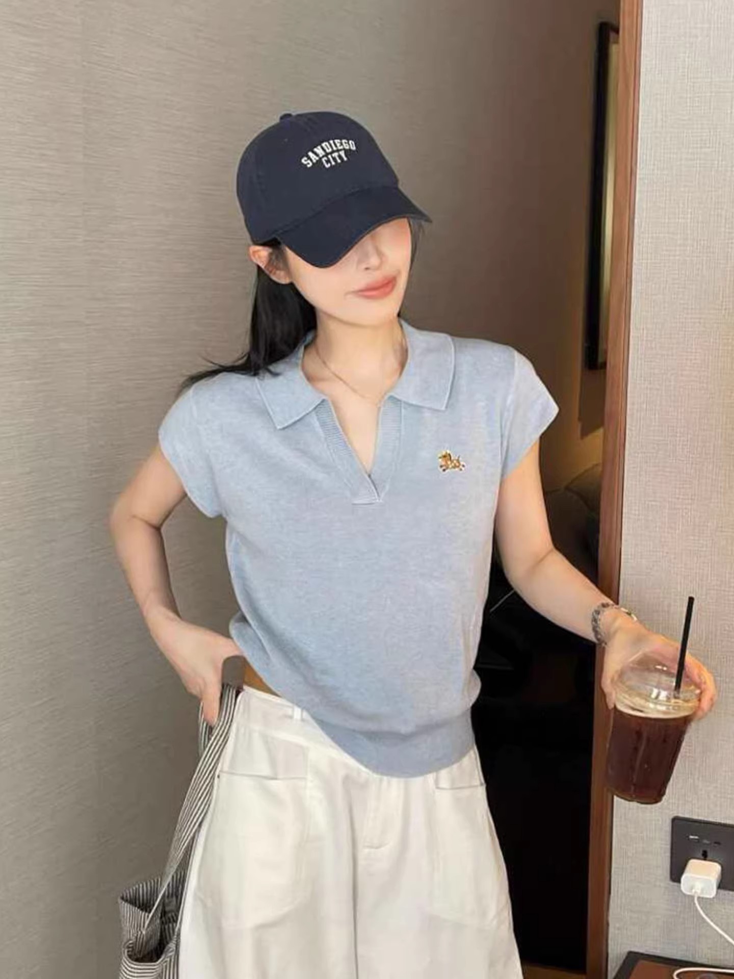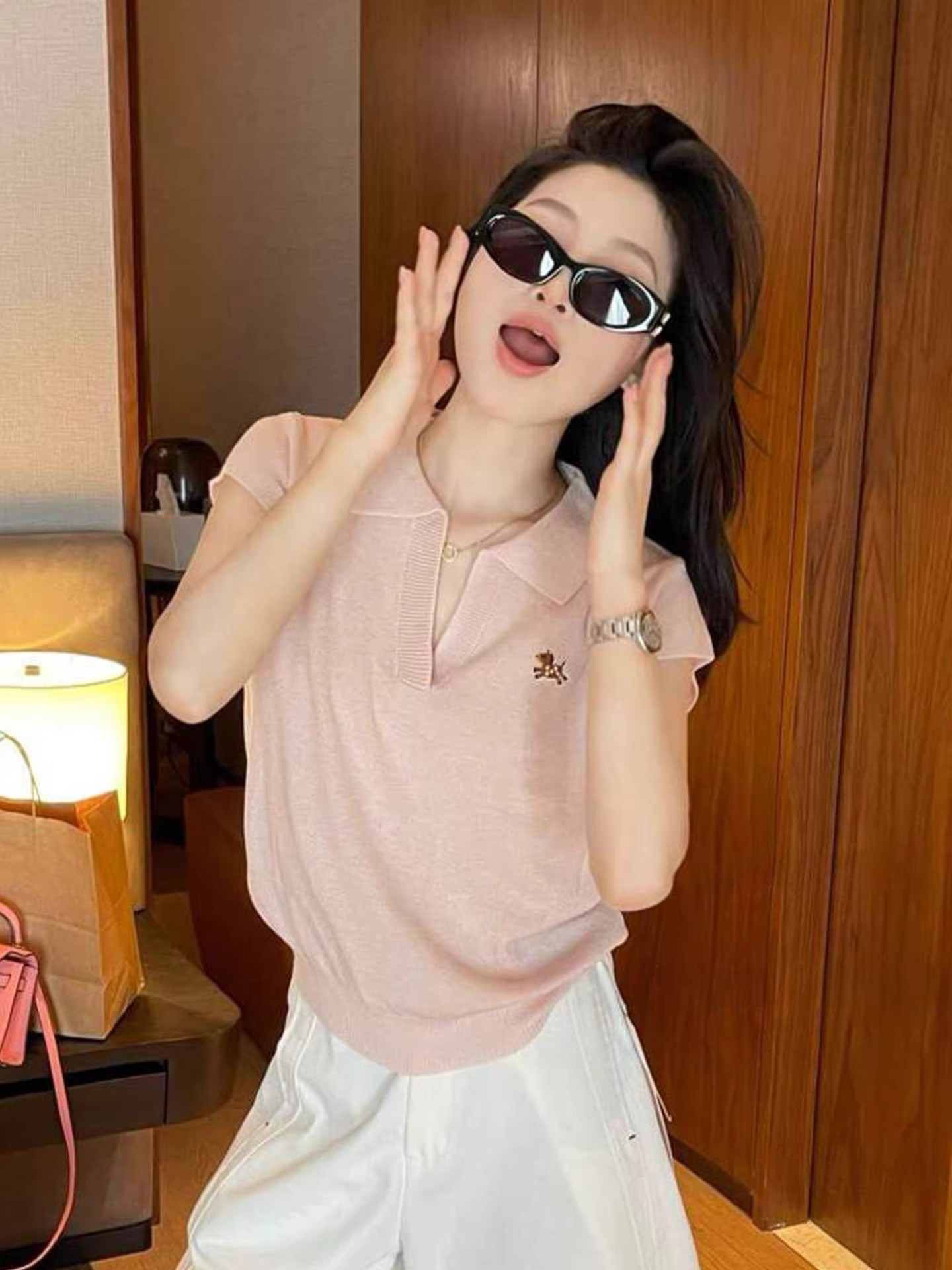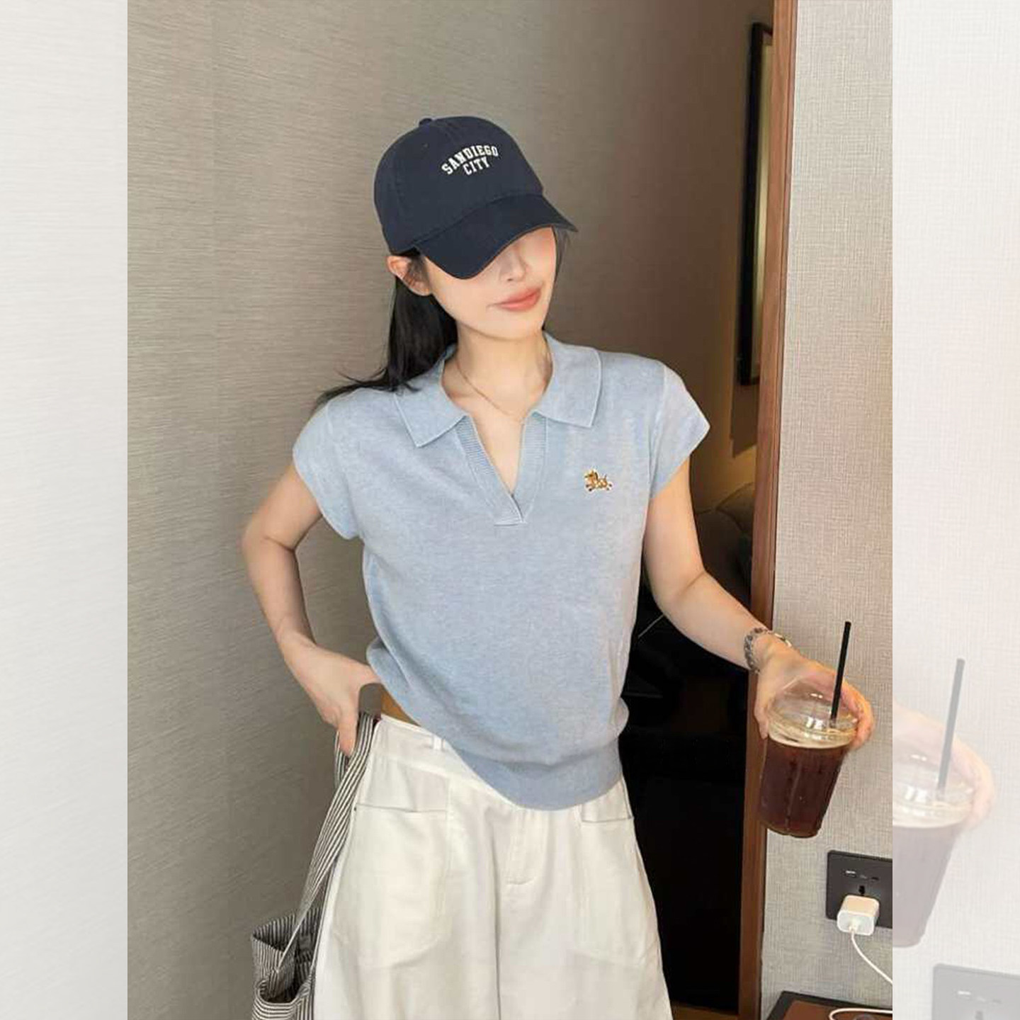 2026 봄 여름 한 부서 POLO 칼라 양모 반팔 니트 스웨터 여성 u 칼라 얇은 스타일 슬림해 보이는 다용도 티셔츠 맨위
