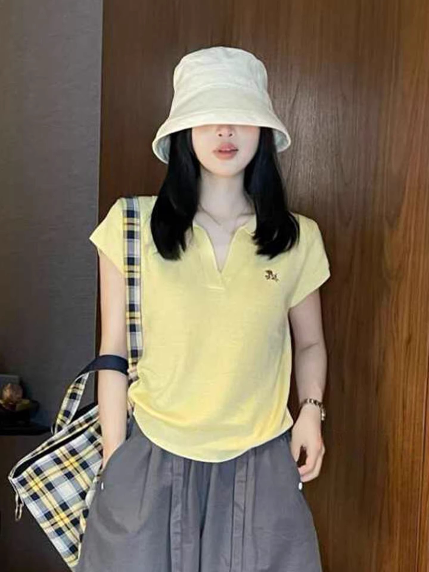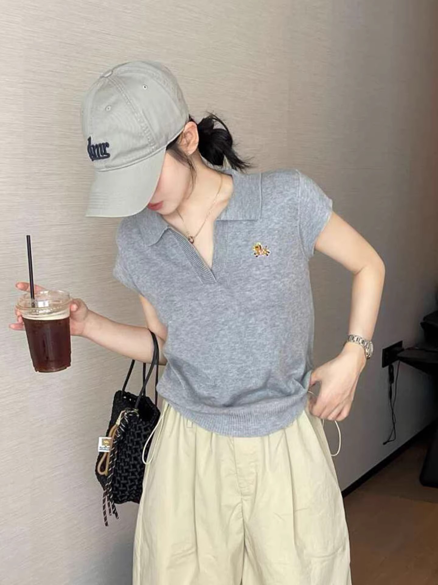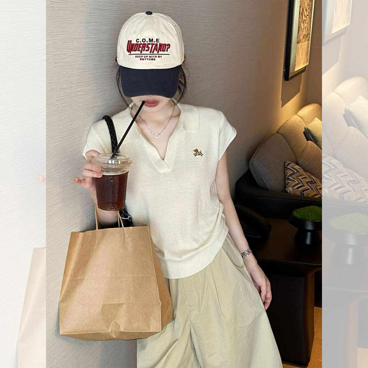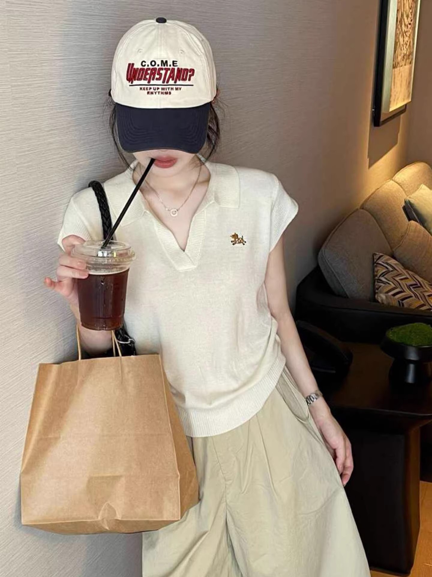 2026 봄 여름 한 부서 POLO 칼라 양모 반팔 니트 스웨터 여성 u 칼라 얇은 스타일 슬림해 보이는 다용도 티셔츠 맨위