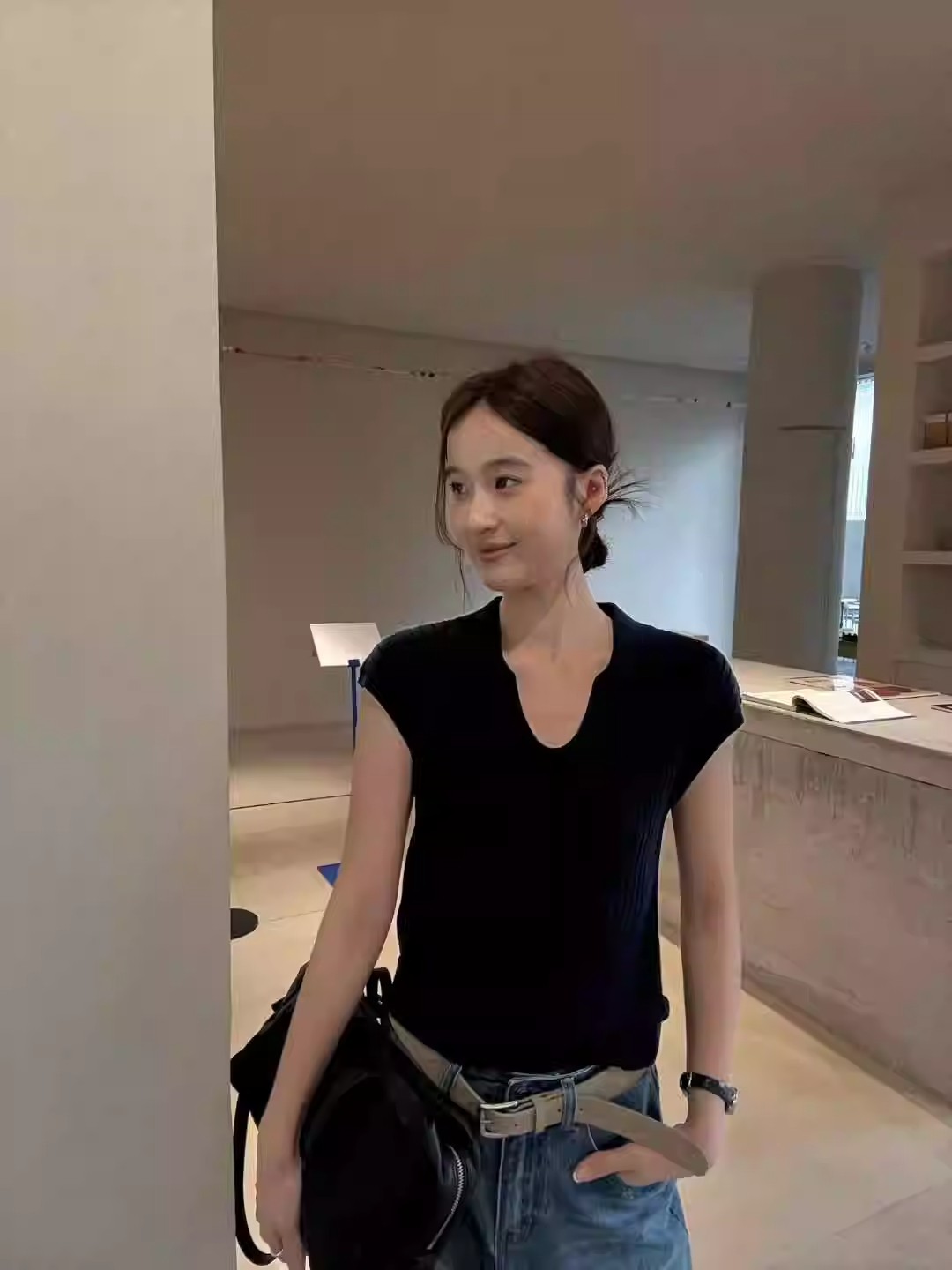 한 부서 아름다운 핑크색 V넥 얼음 실크 니트 반팔 티셔츠 여성 여름 고유 한 슈퍼 잘 생긴 몸매 가꾸기 쇼트 스타일 작은 맨위