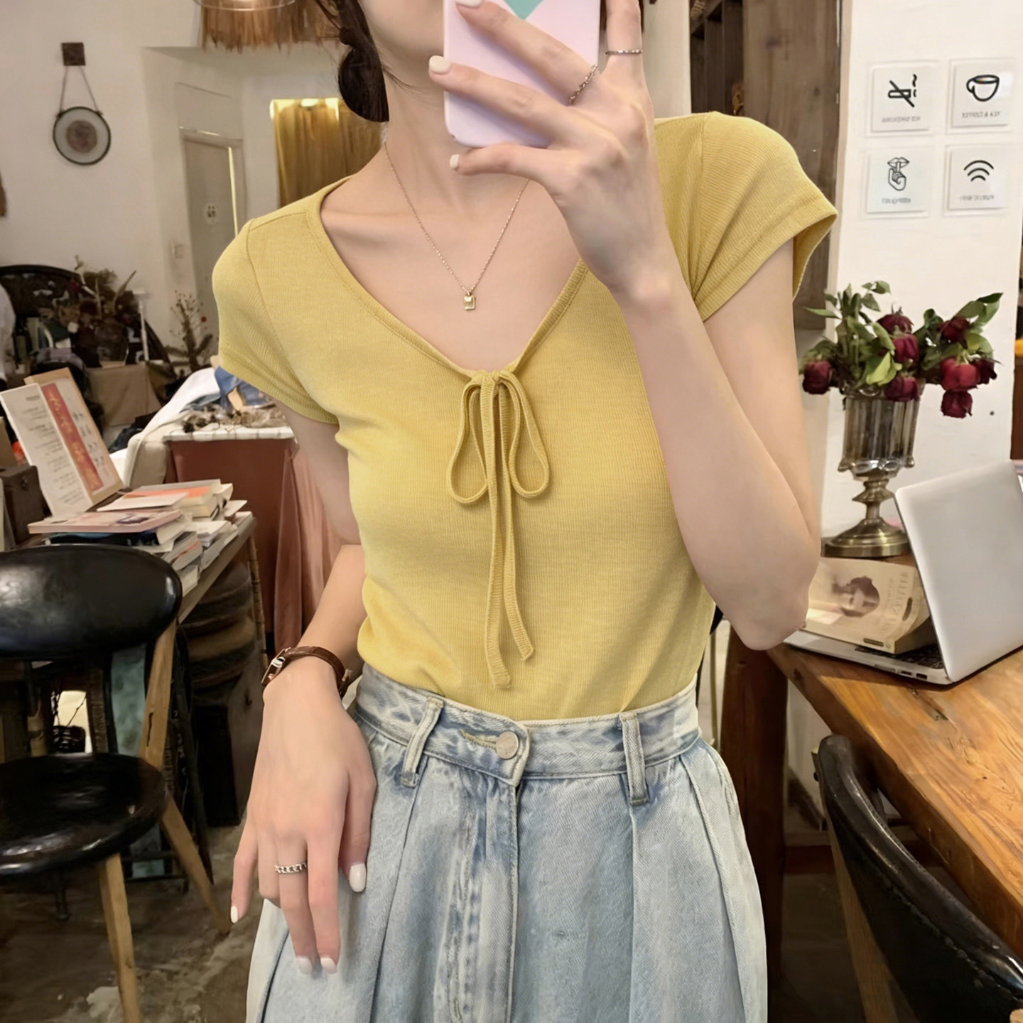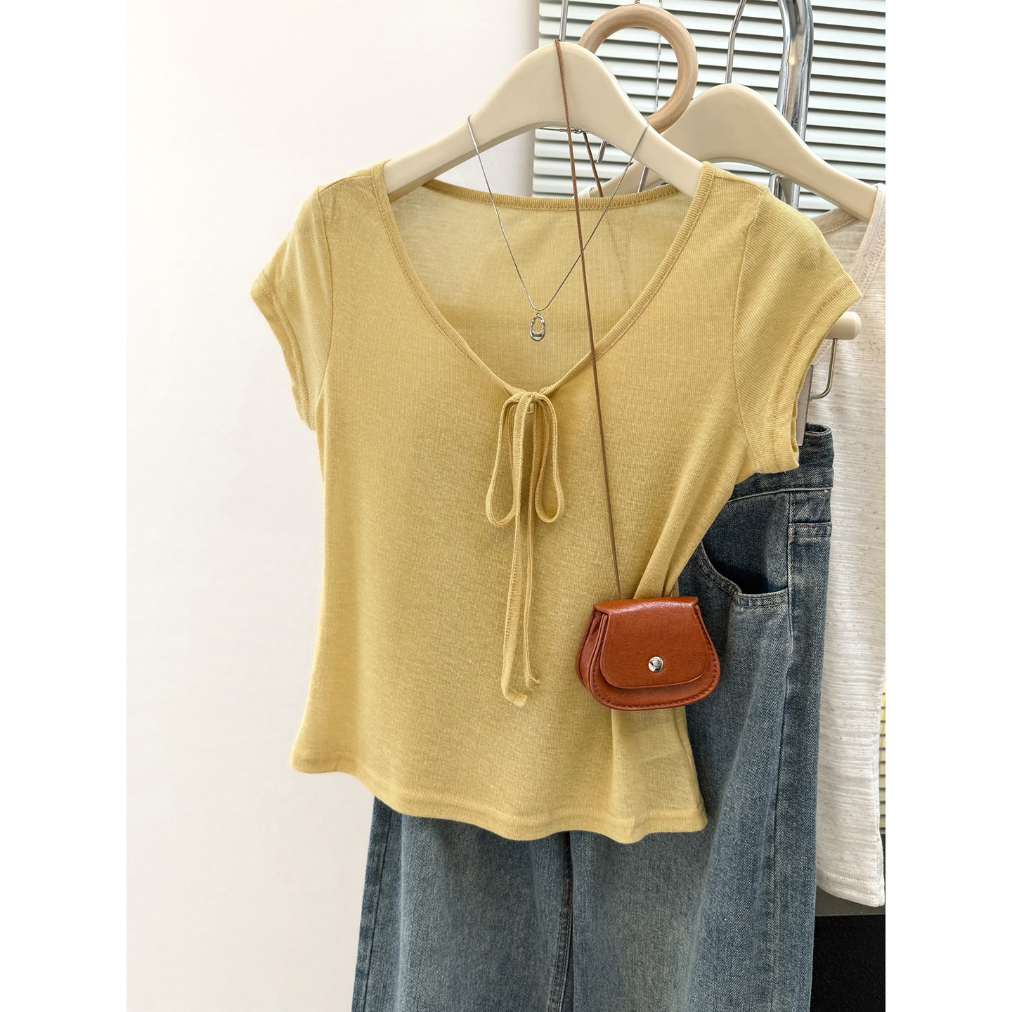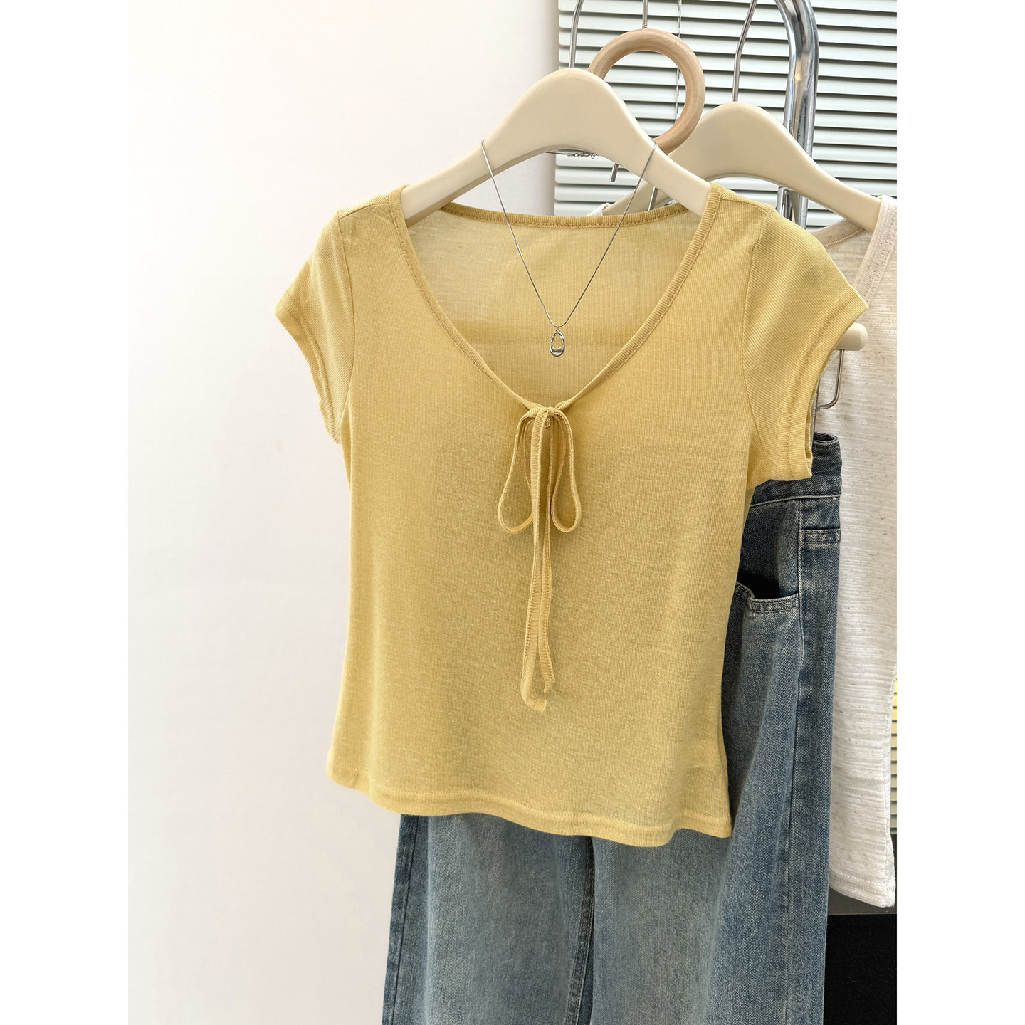 순면 리브 작은 키 쇼트 스타일 반팔 티셔츠 여성 여름 몸매 가꾸기 한국 스타일 레이스 나비 매듭 u 칼라 맨위 트렌디