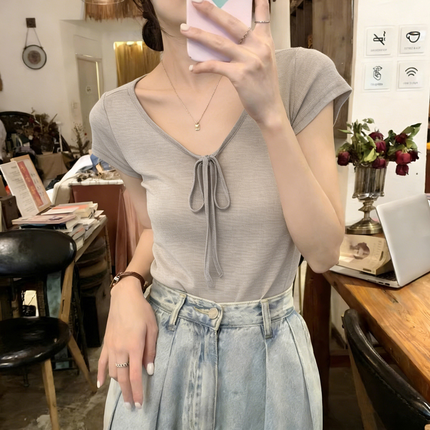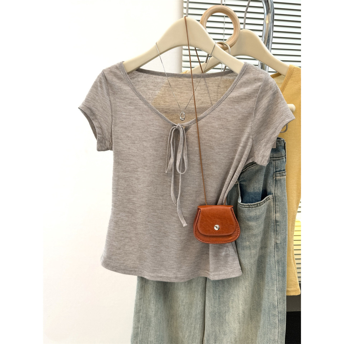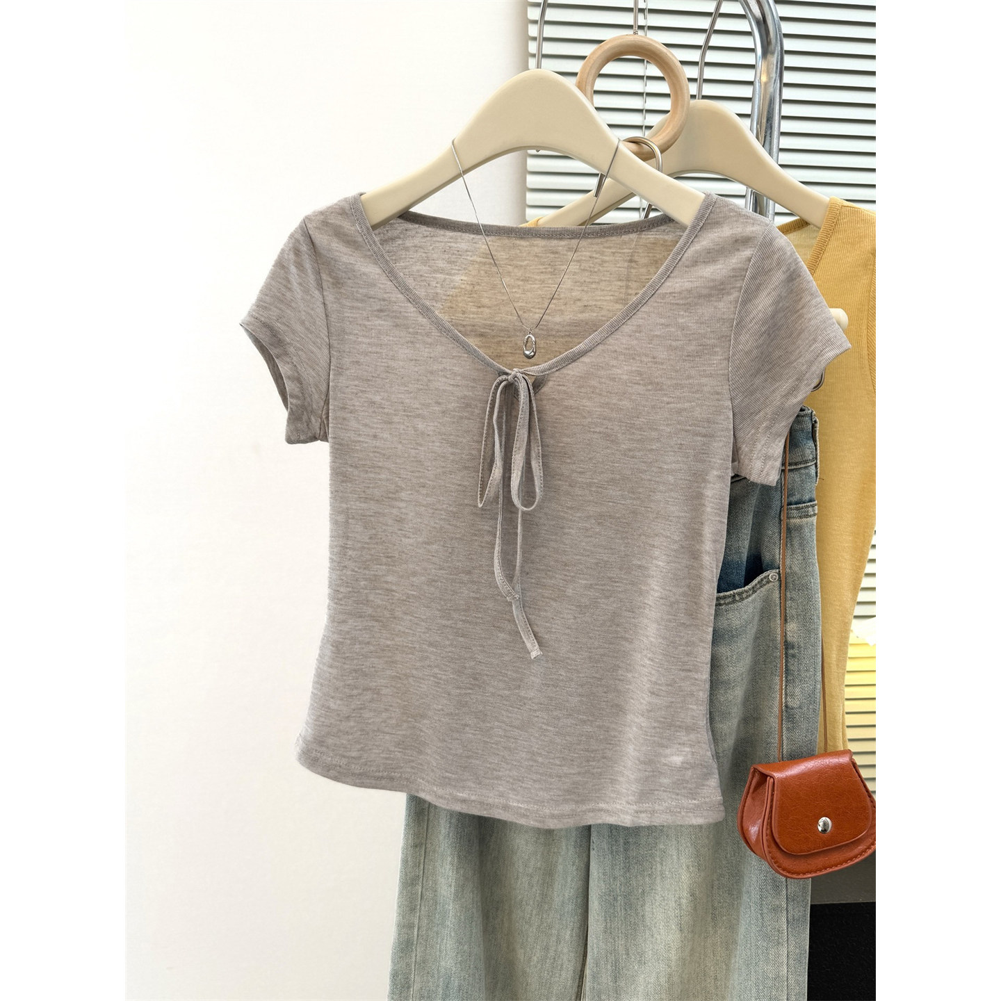 순면 리브 작은 키 쇼트 스타일 반팔 티셔츠 여성 여름 몸매 가꾸기 한국 스타일 레이스 나비 매듭 u 칼라 맨위 트렌디