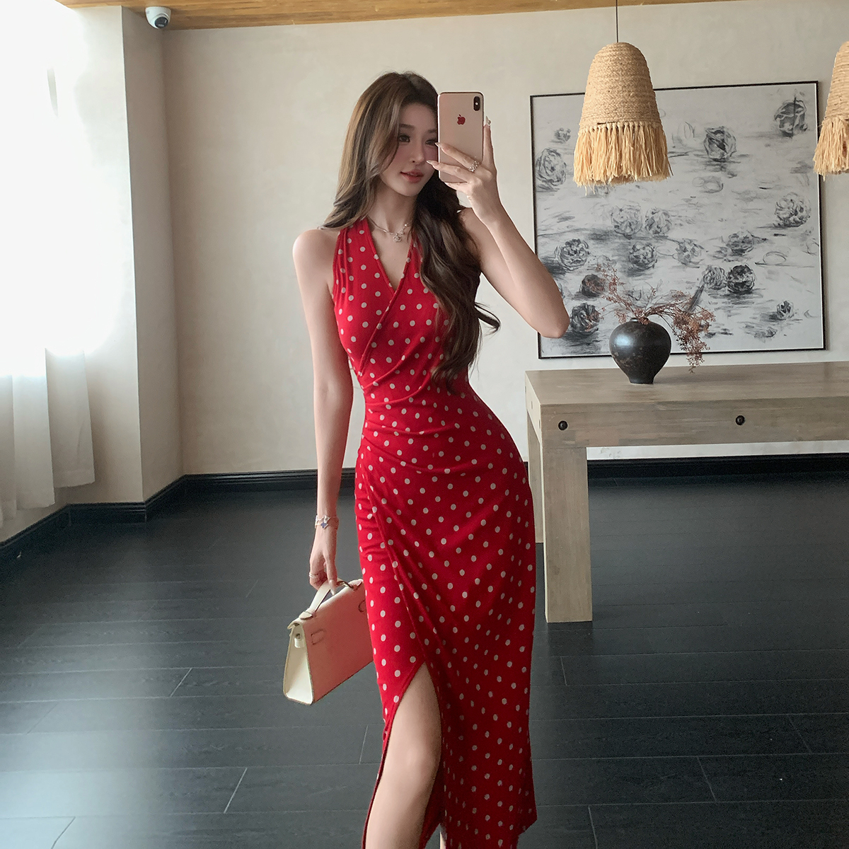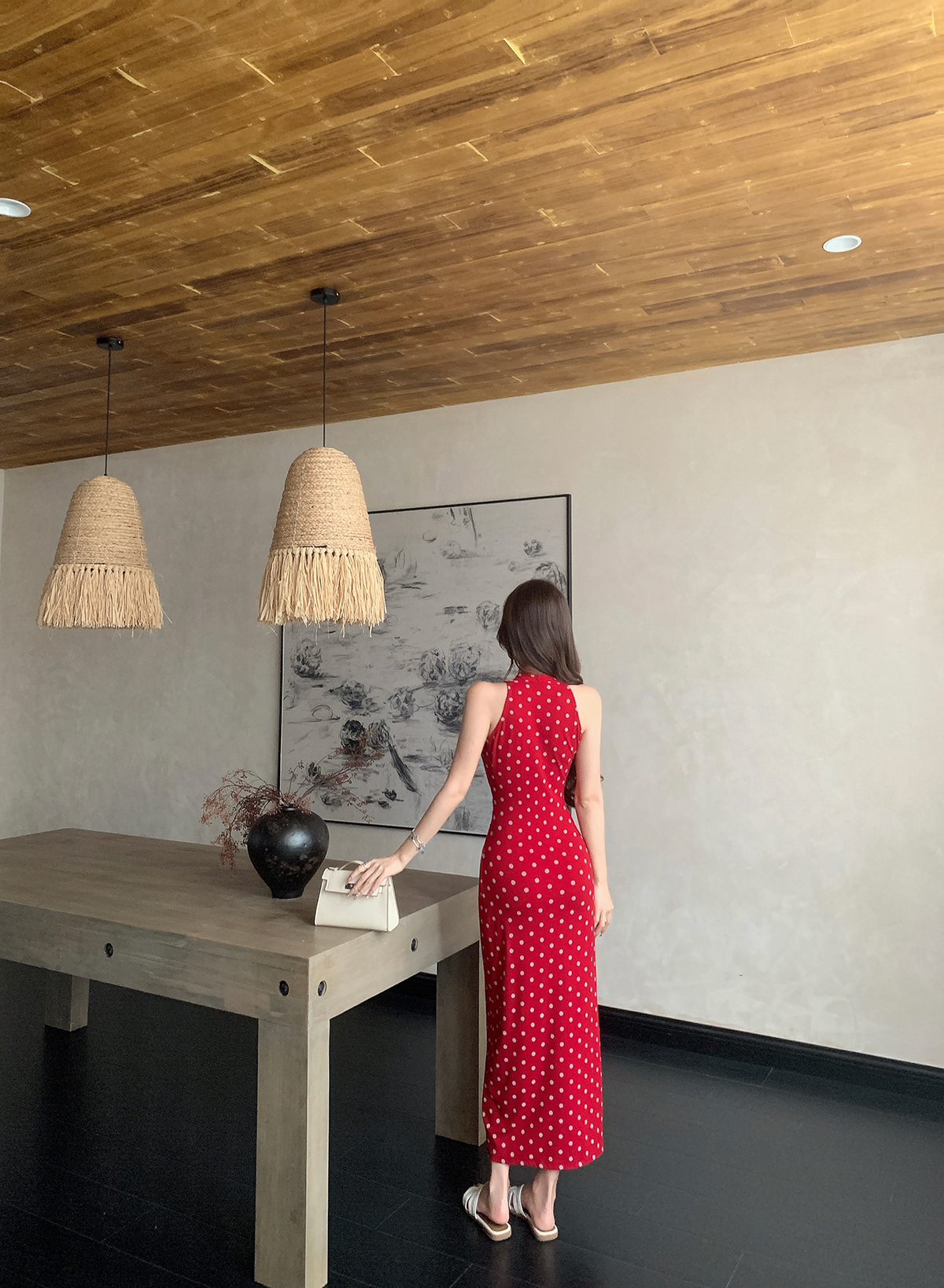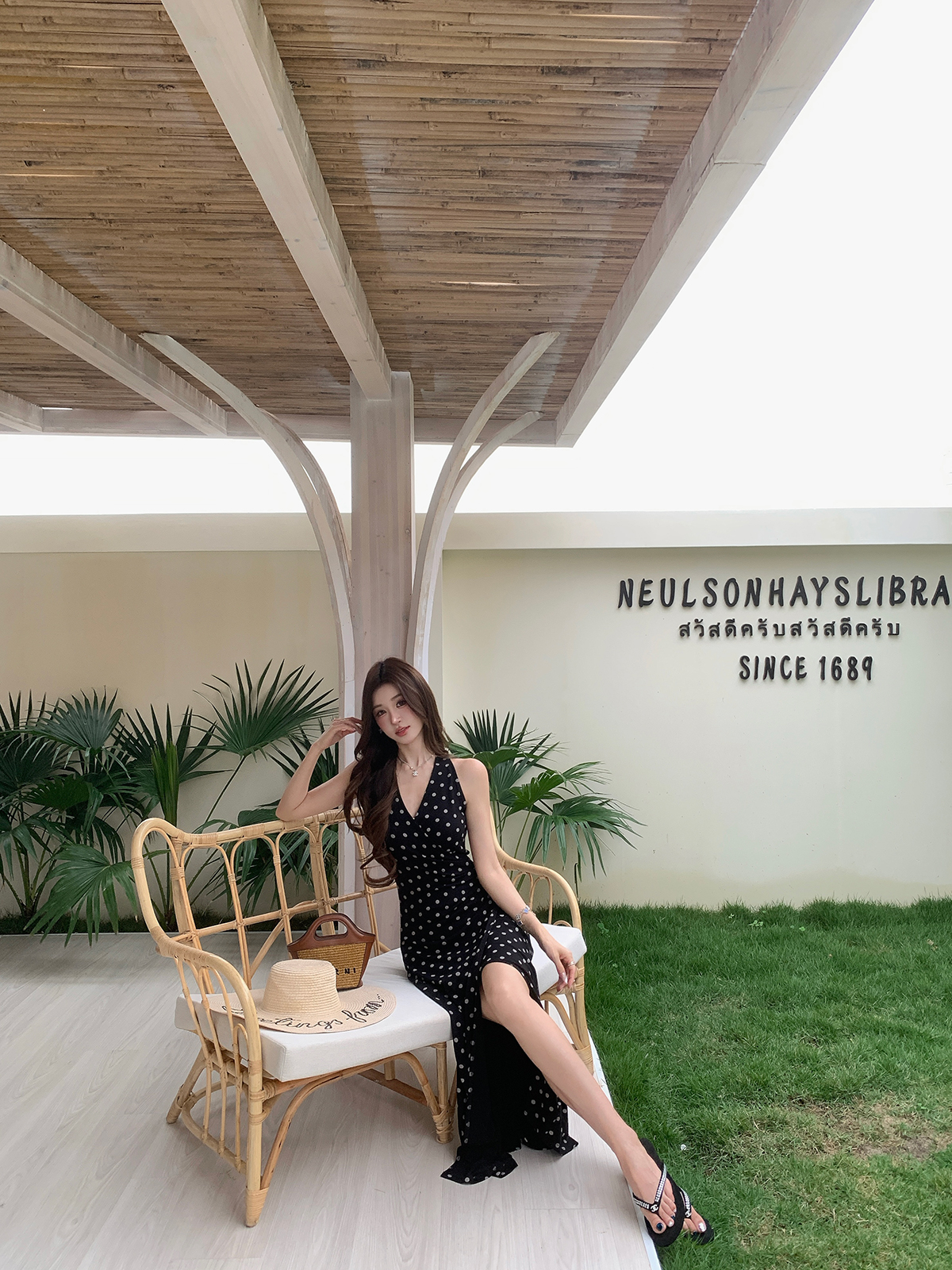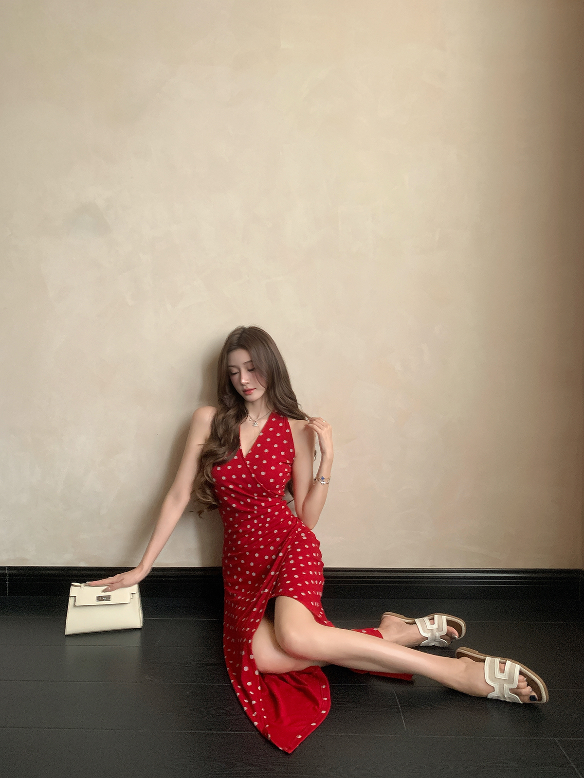 여름 새로운 주간 따뜻한 주황색 도트 무늬 치마 순수한 욕망 프랑스식 중간 길이 슬립 드레스 해변가 휴가 치마