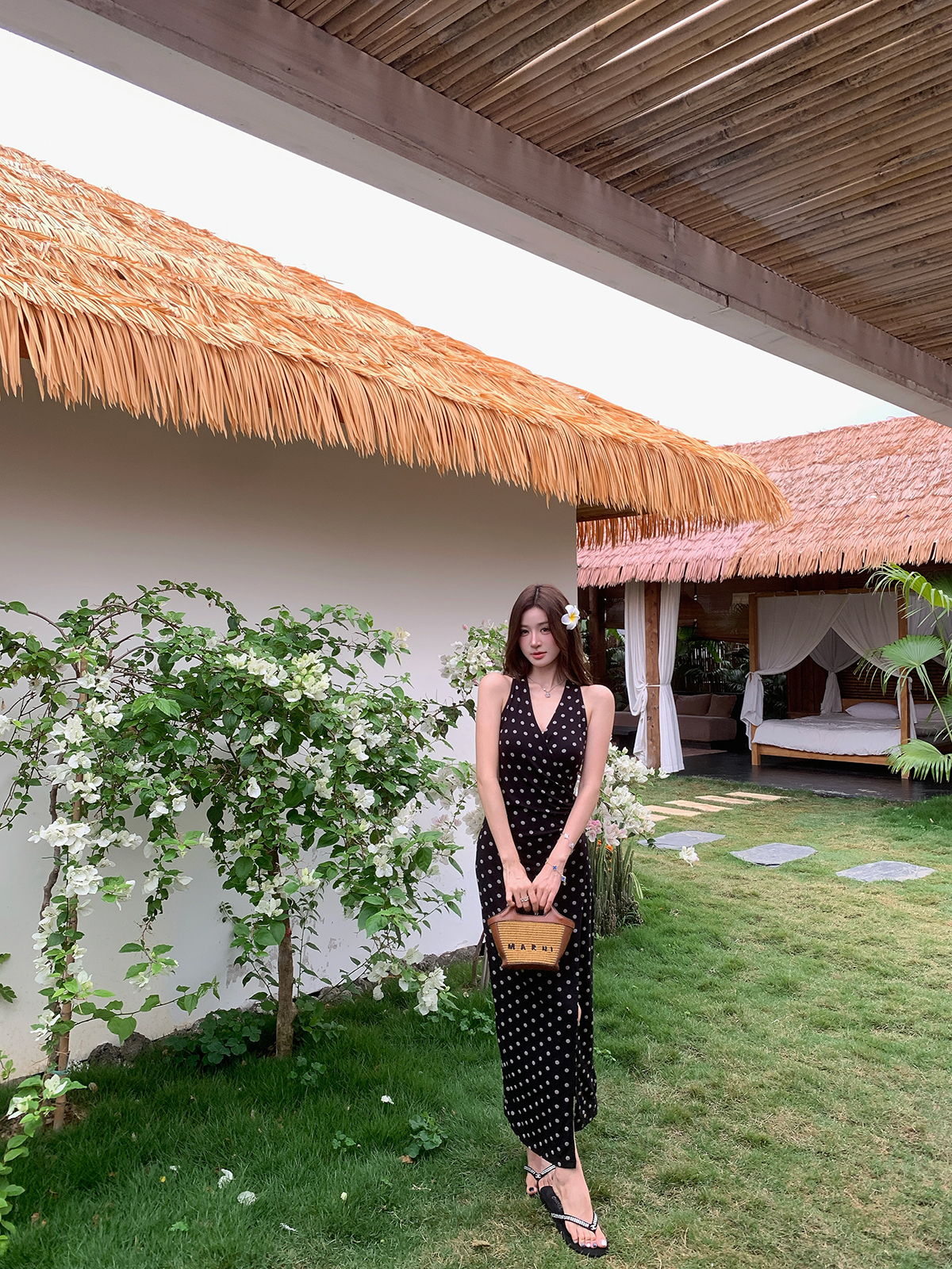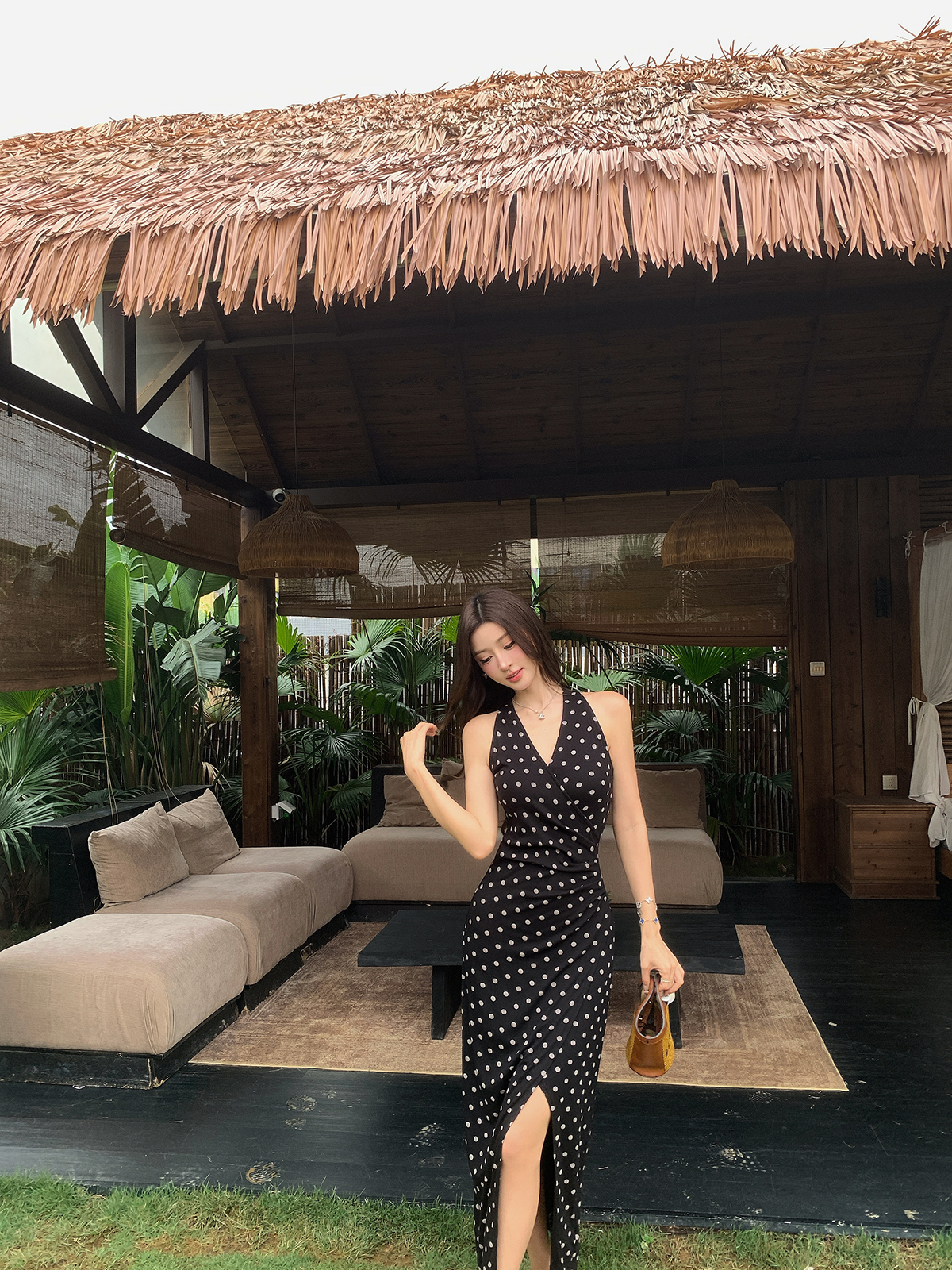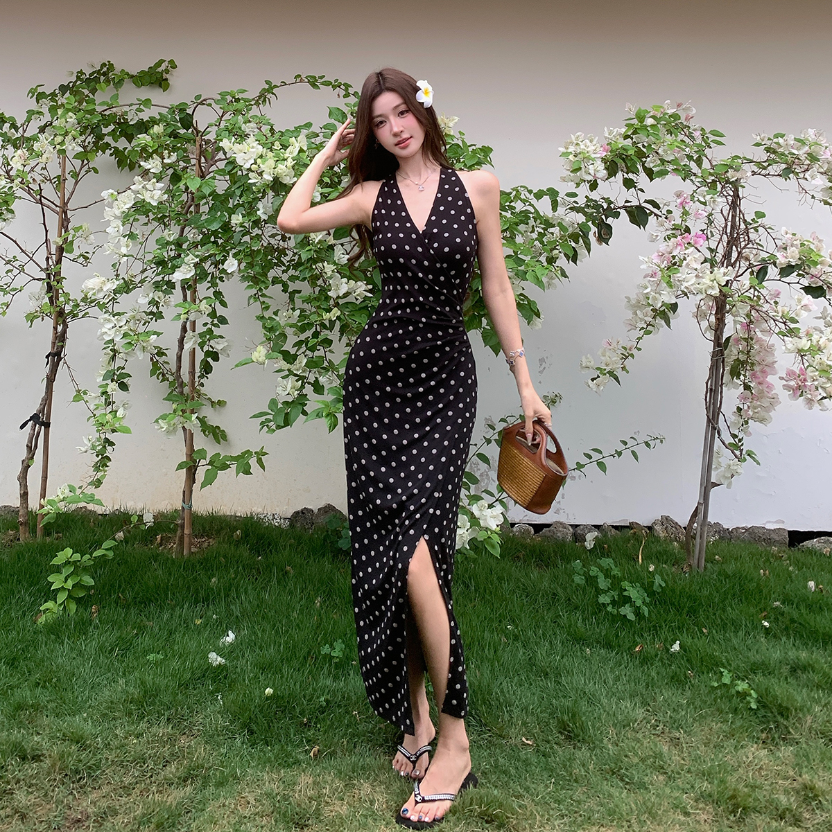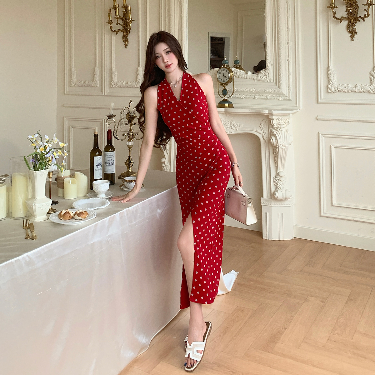 여름 새로운 주간 따뜻한 주황색 도트 무늬 치마 순수한 욕망 프랑스식 중간 길이 슬립 드레스 해변가 휴가 치마