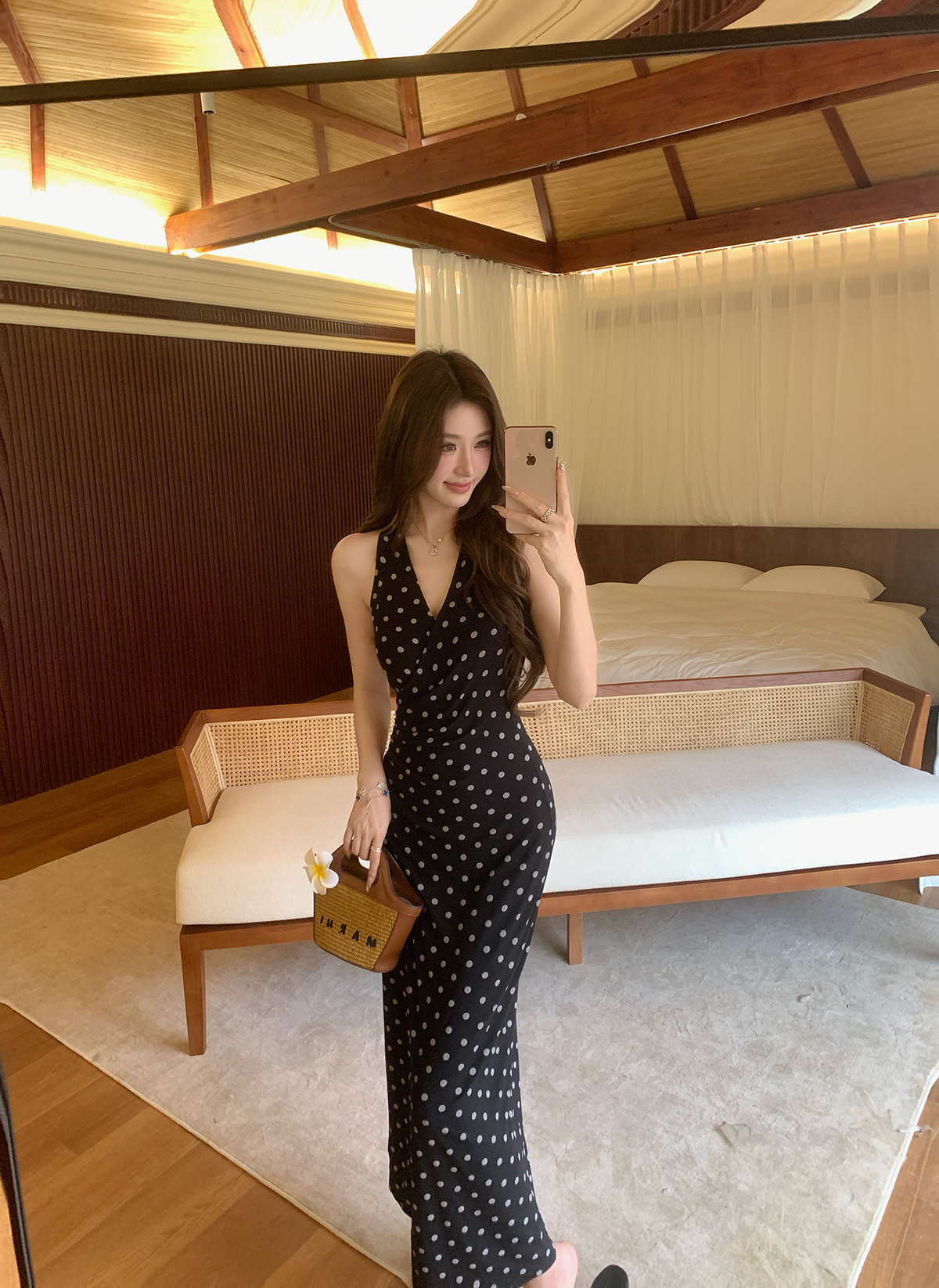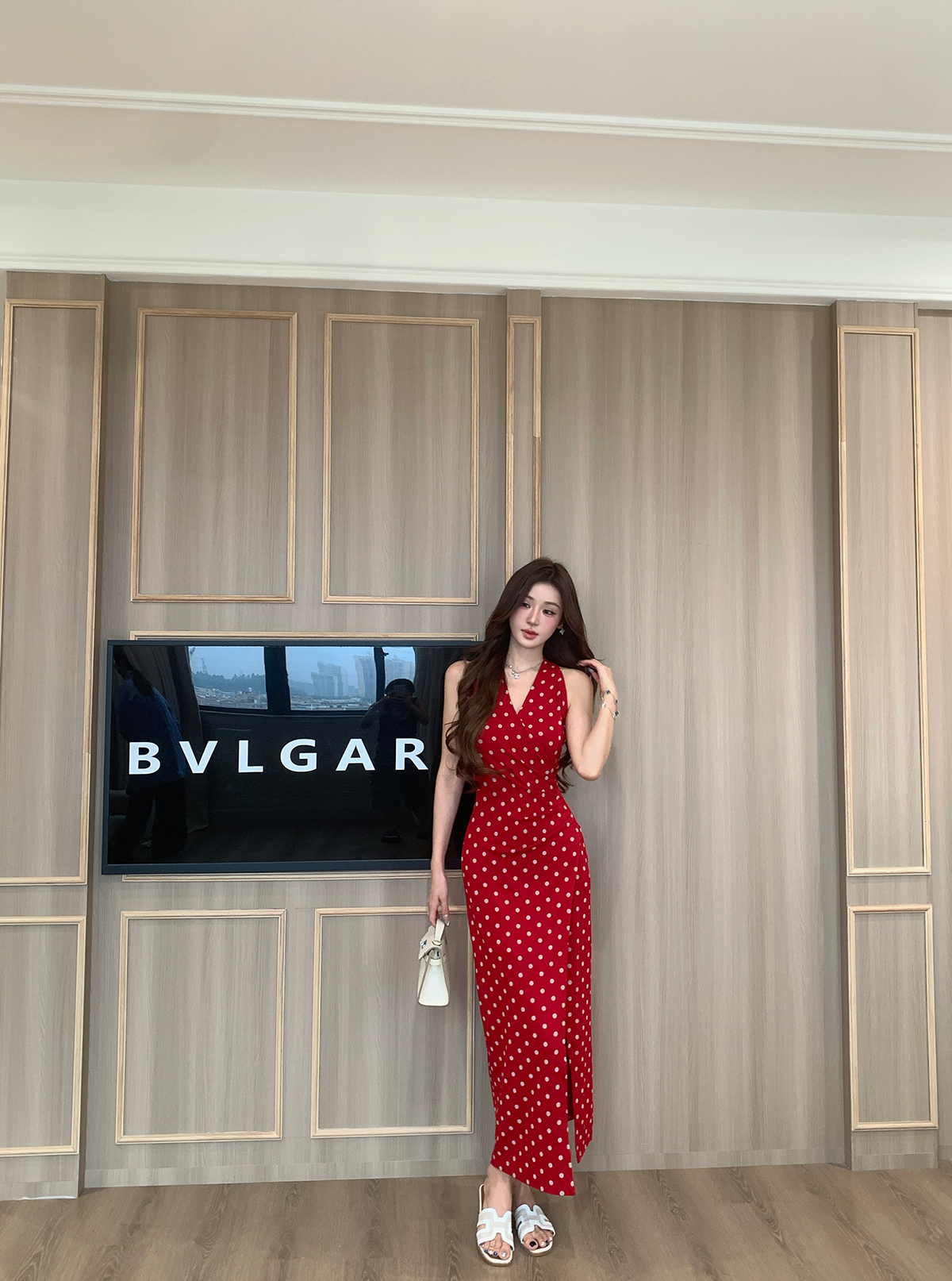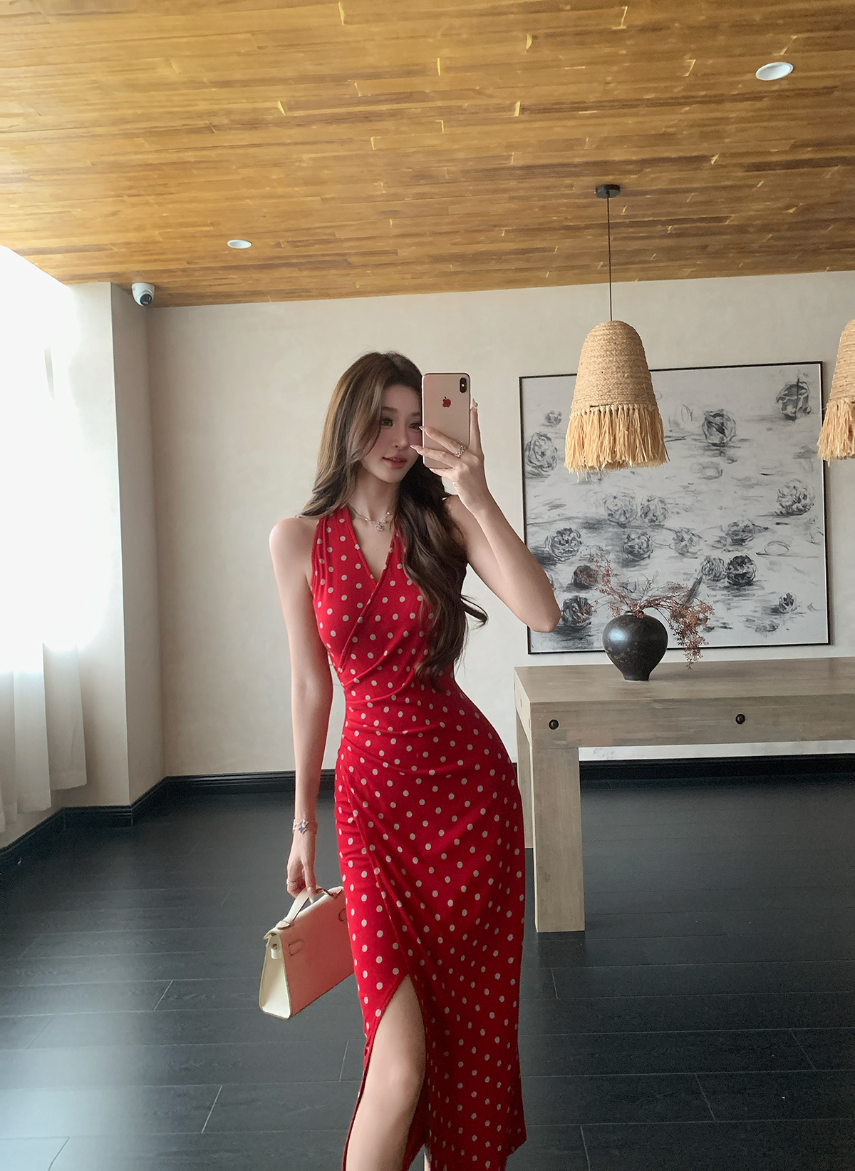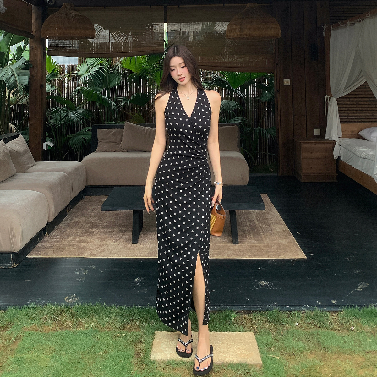 여름 새로운 주간 따뜻한 주황색 도트 무늬 치마 순수한 욕망 프랑스식 중간 길이 슬립 드레스 해변가 휴가 치마