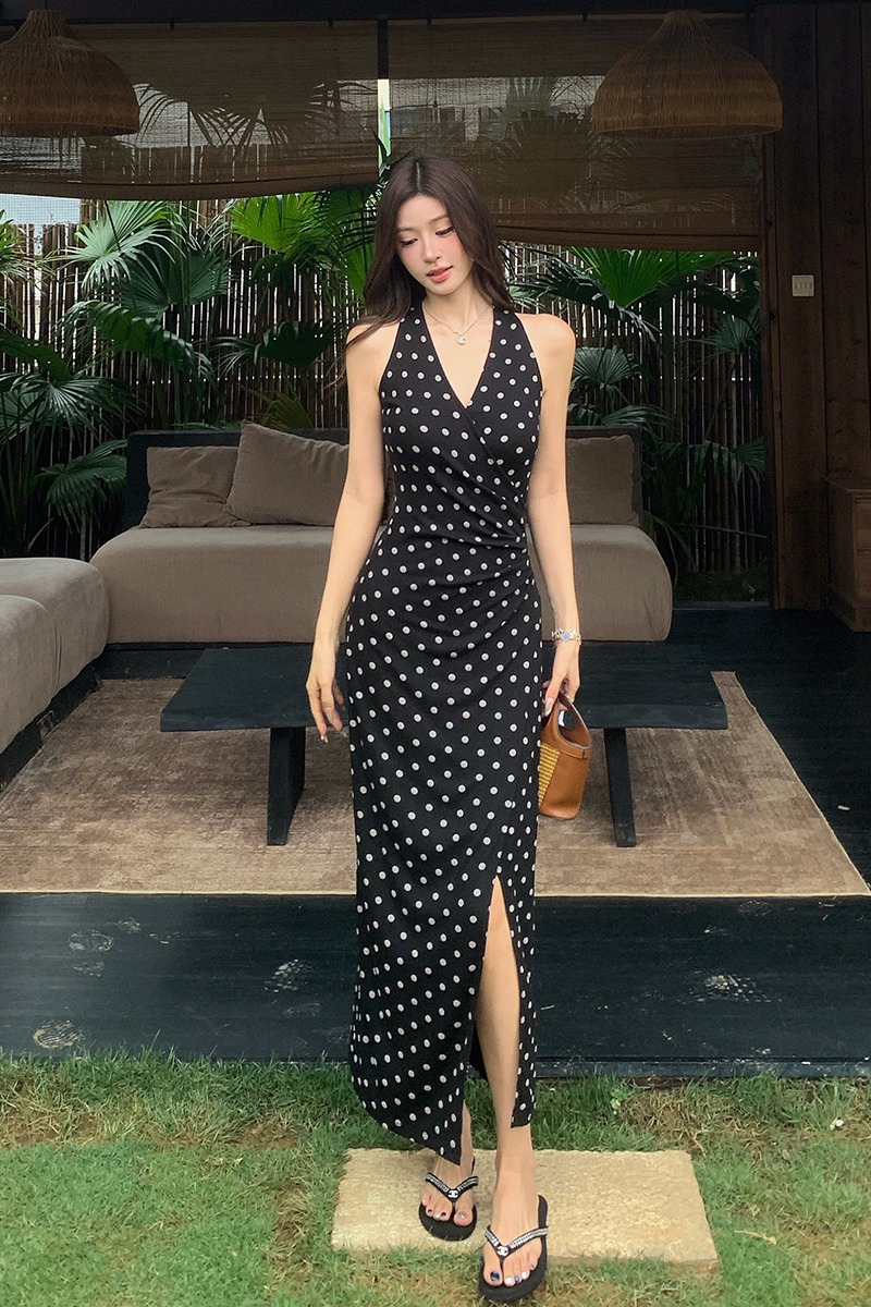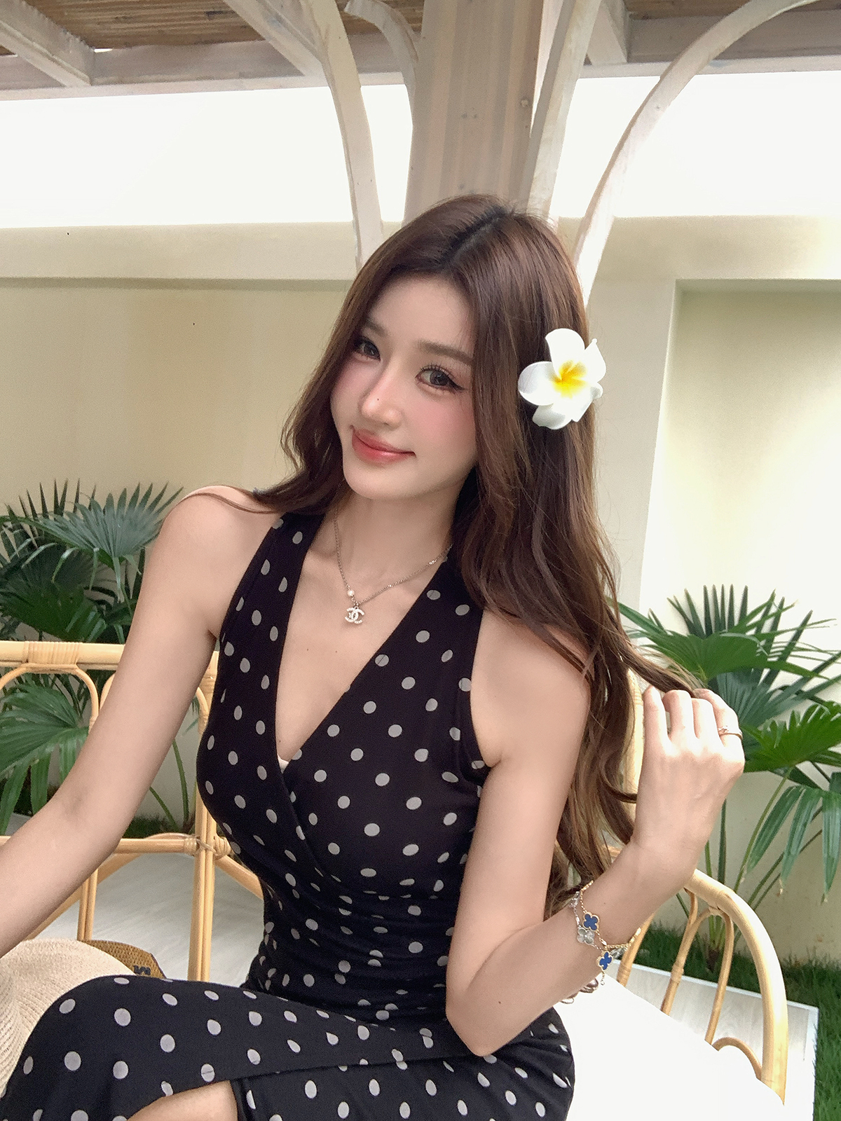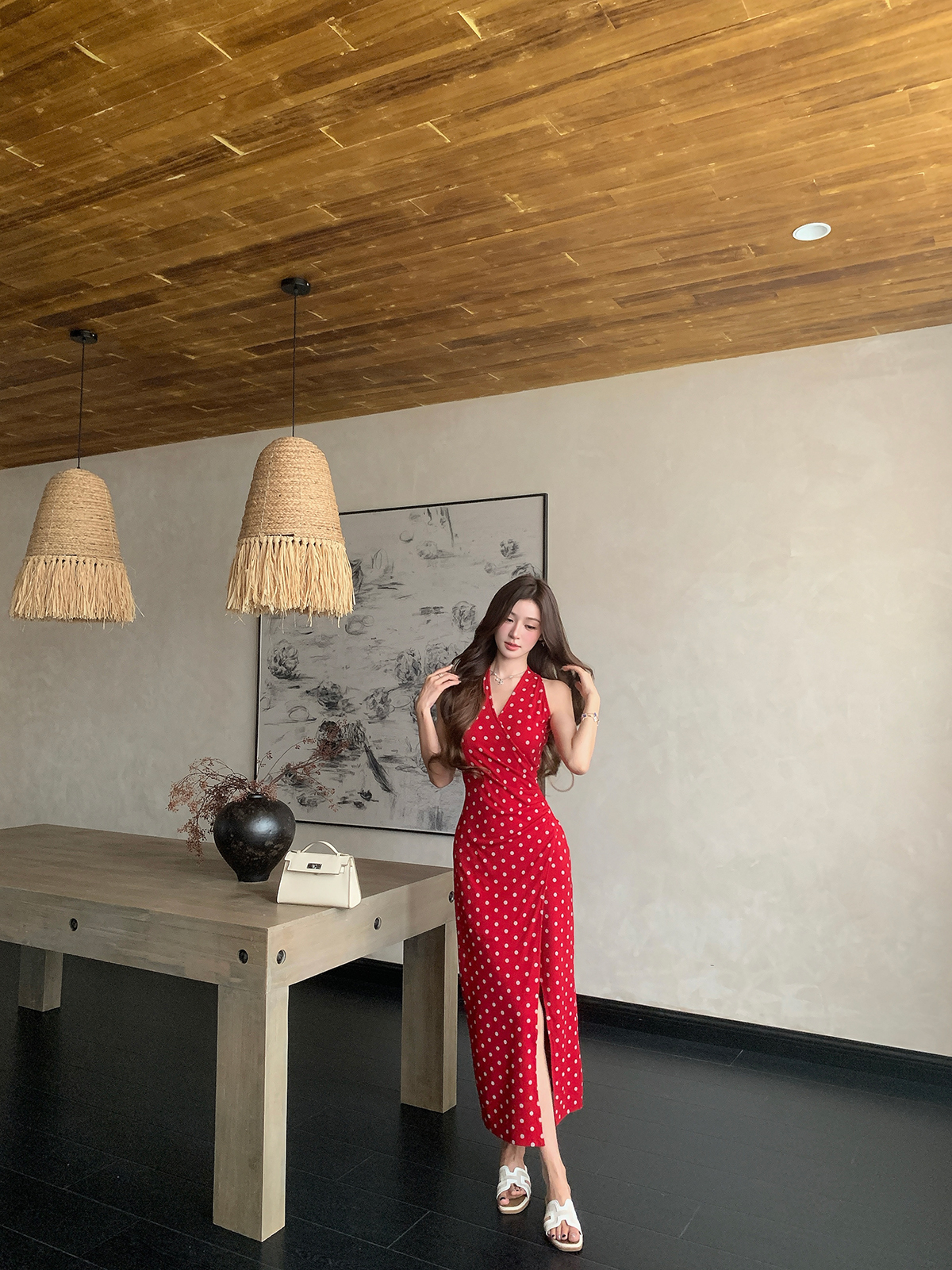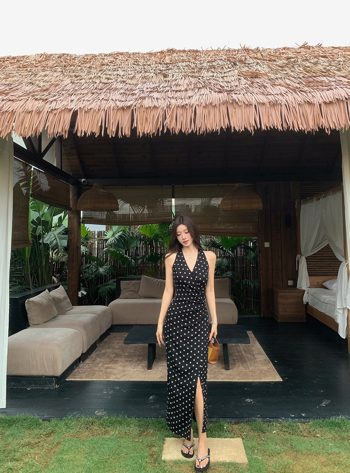 여름 새로운 주간 따뜻한 주황색 도트 무늬 치마 순수한 욕망 프랑스식 중간 길이 슬립 드레스 해변가 휴가 치마