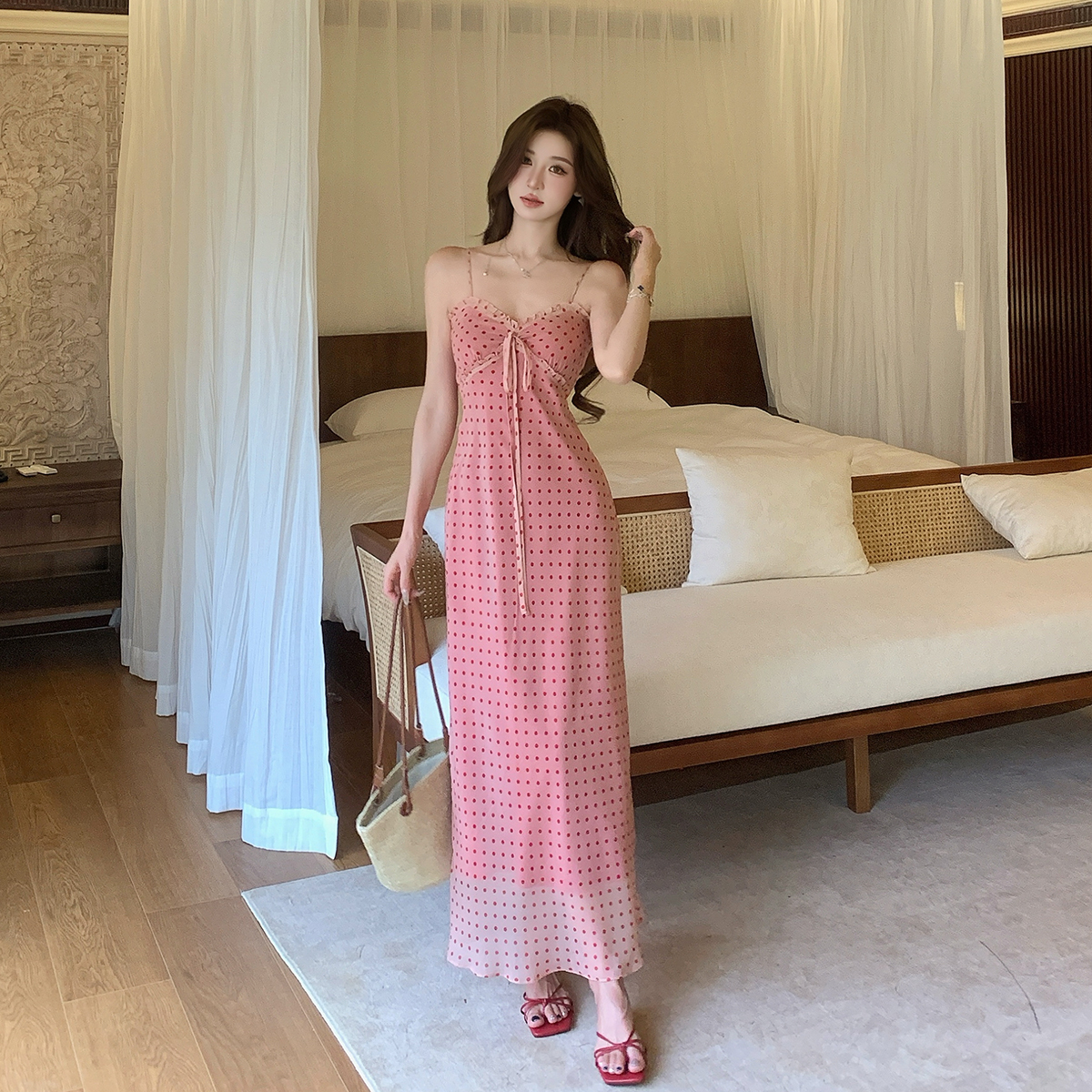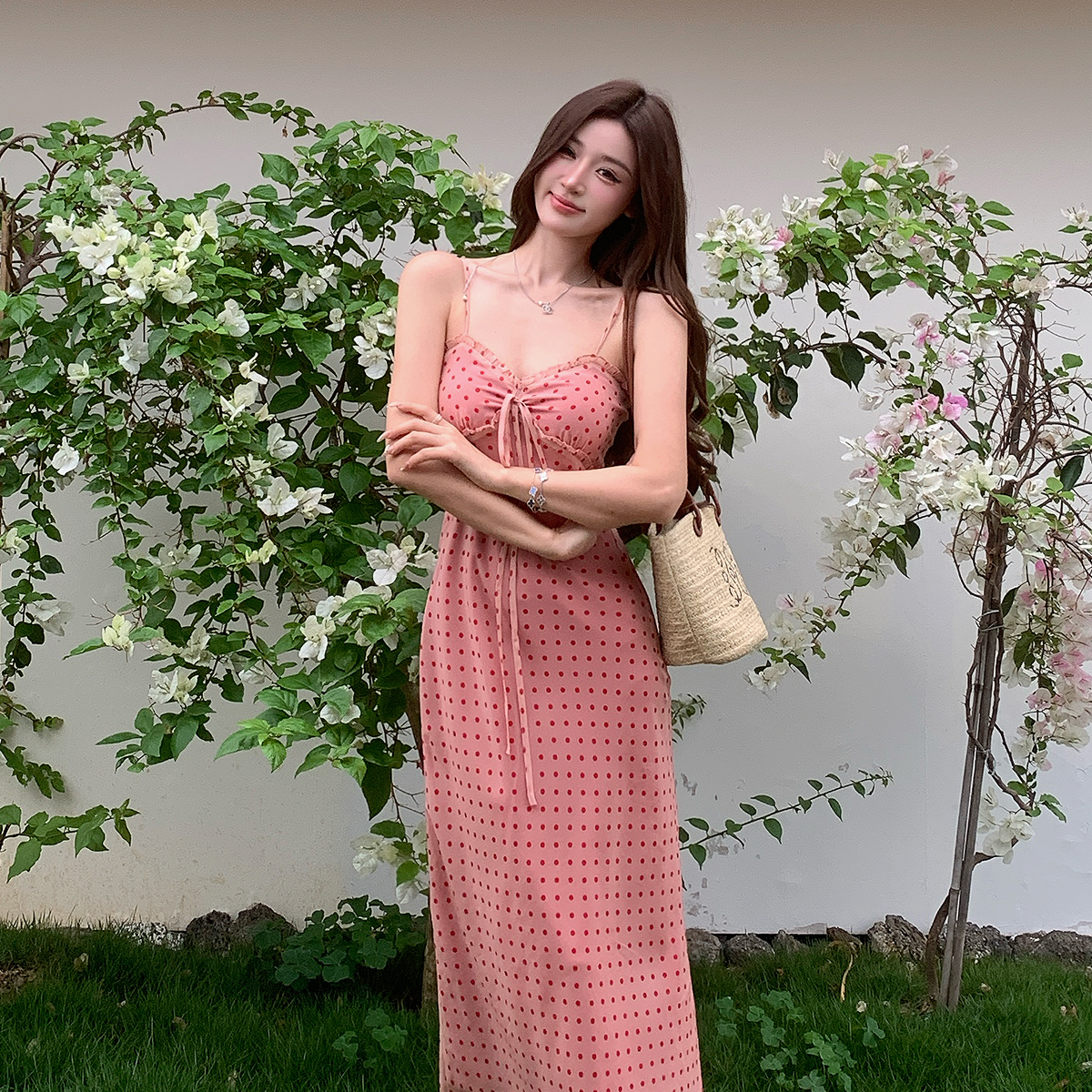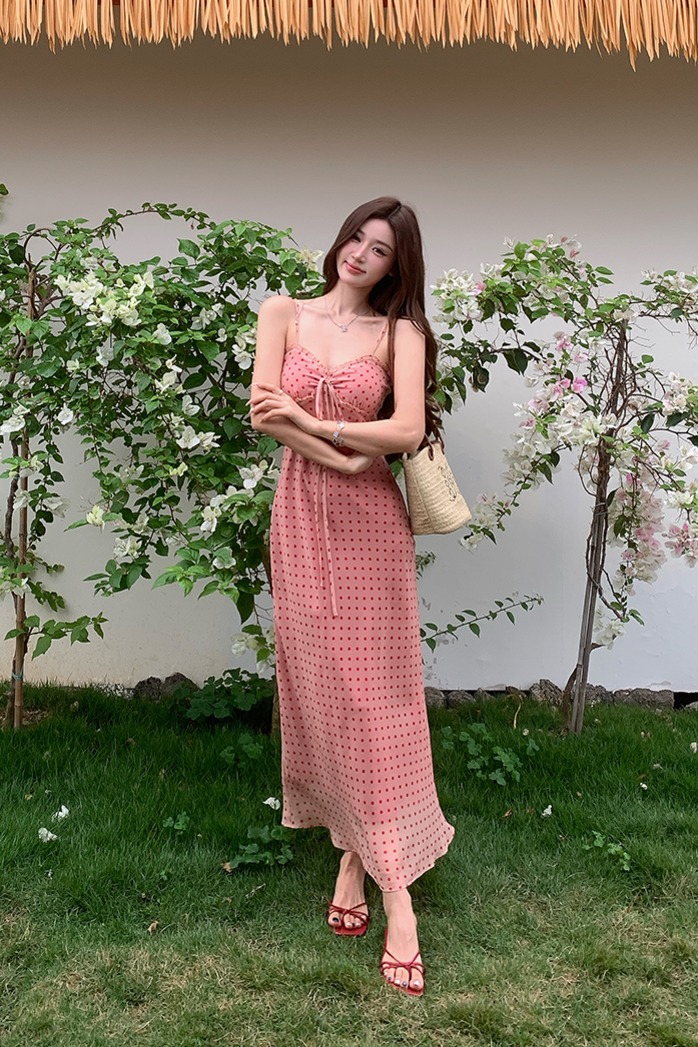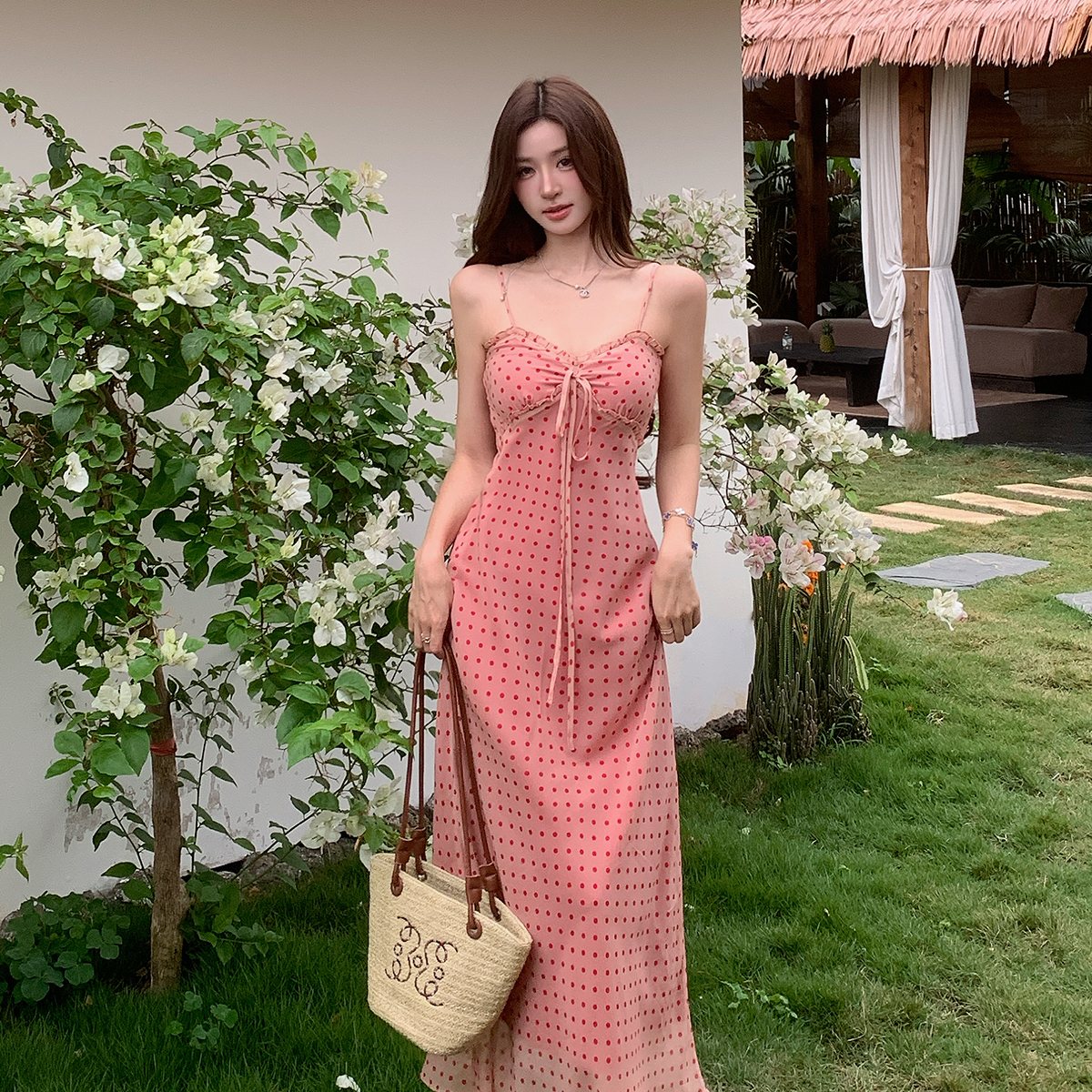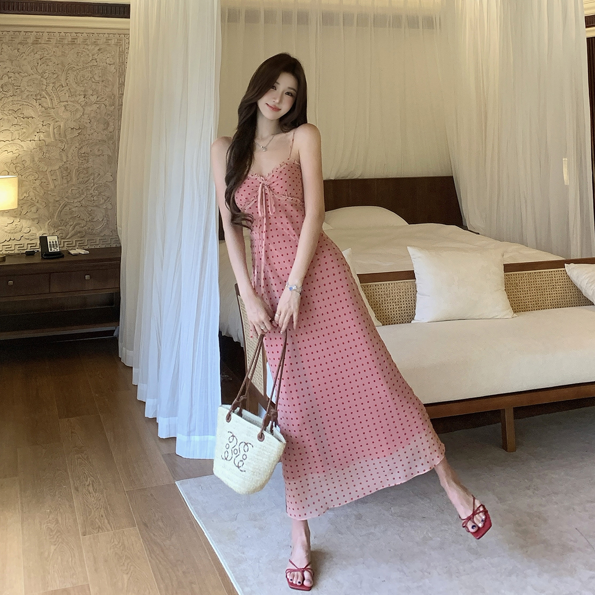 여름 새로운 다용도 프랑스식 V넥 허리 수축 롱 스커트 몸매 가꾸기 도트 무늬 드레스 트임 슬림해 보이는 품격 롱 스커트 여성