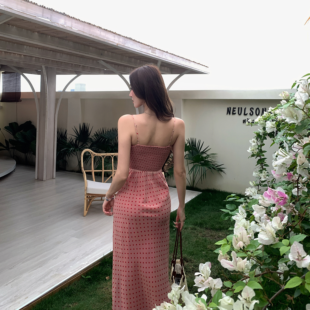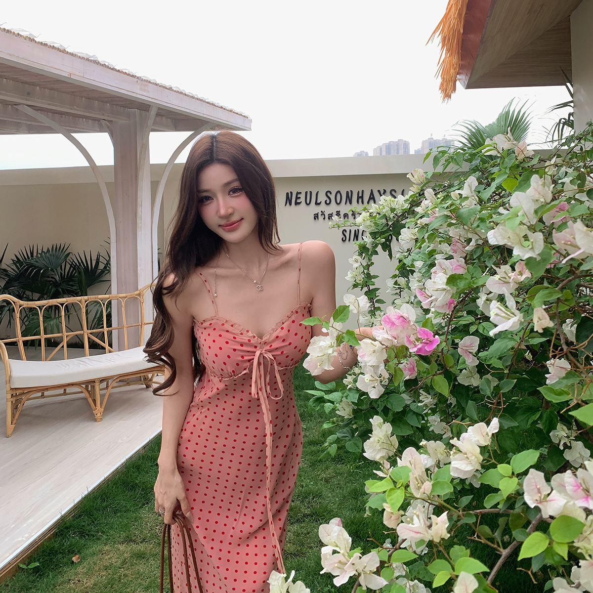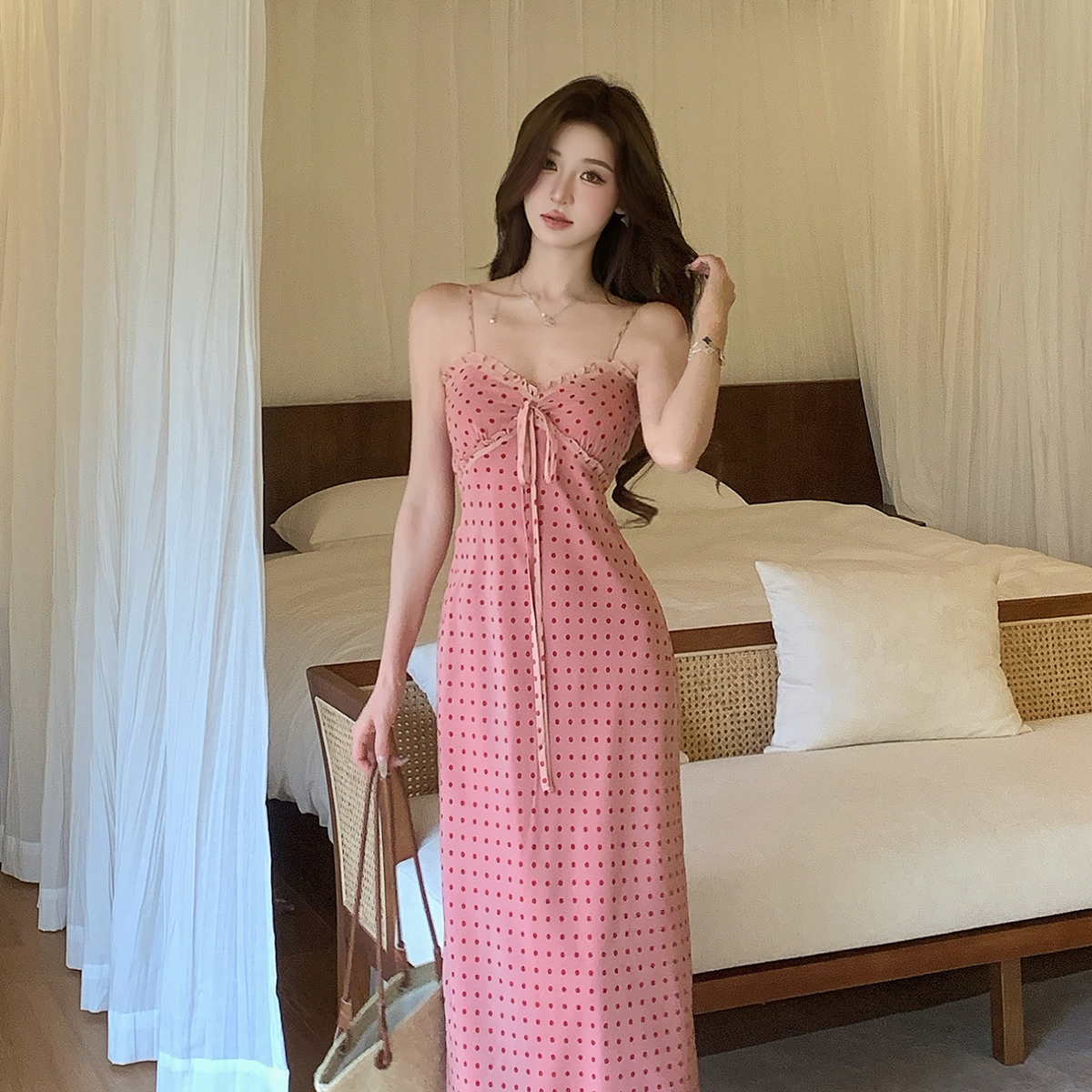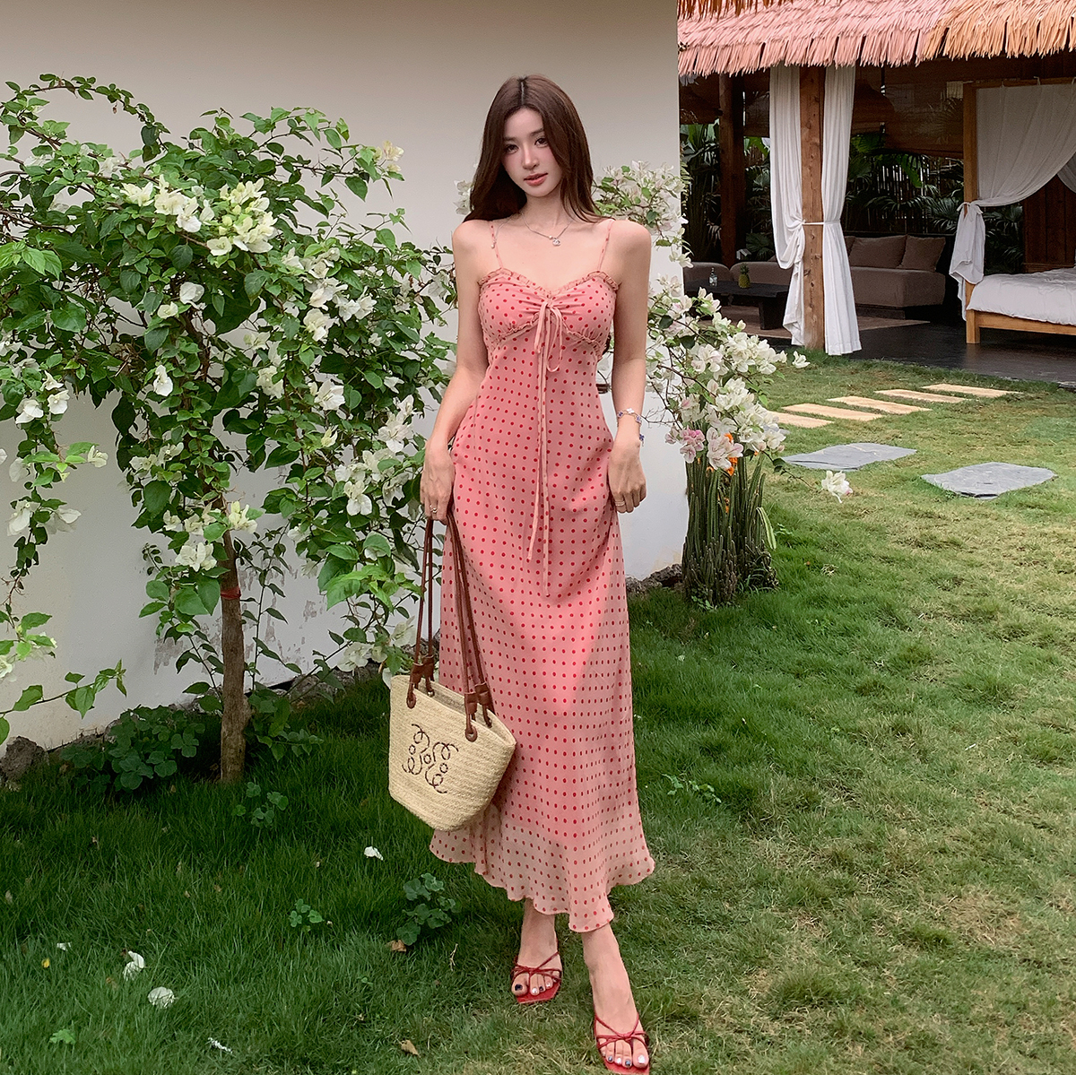 여름 새로운 다용도 프랑스식 V넥 허리 수축 롱 스커트 몸매 가꾸기 도트 무늬 드레스 트임 슬림해 보이는 품격 롱 스커트 여성