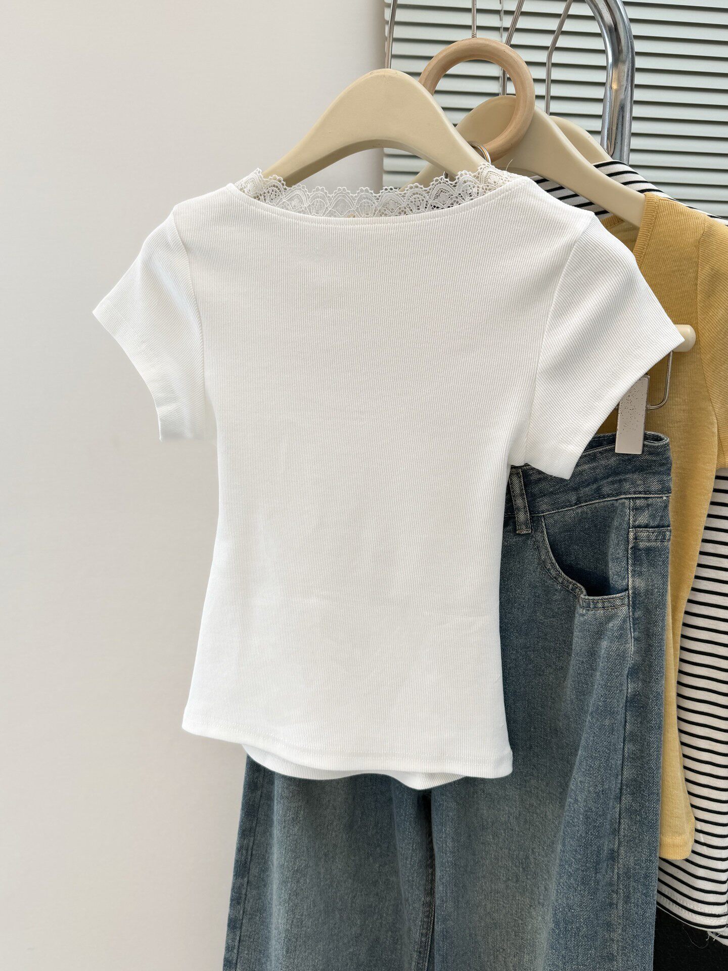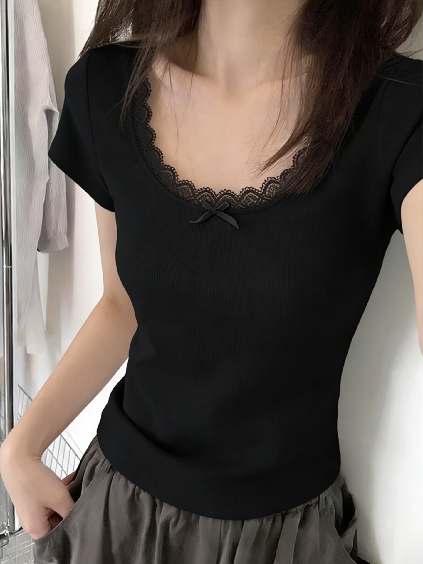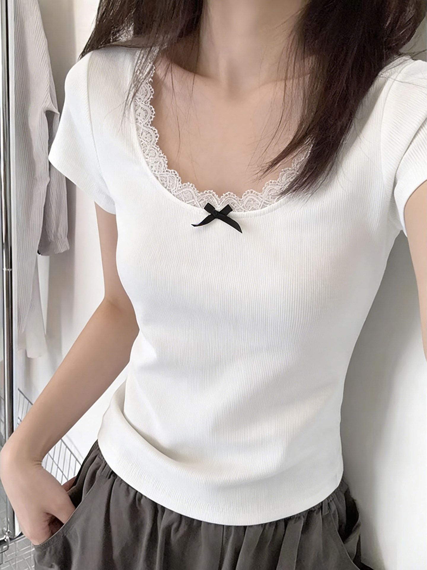 순면 리브 한 부서 달콤한 매운맛 반팔 티셔츠 여름 한국 스타일 몸매 가꾸기 인사이드 가져 가라. 외출용 기본 셔츠 u 칼라 긍정적 인 어깨 의류