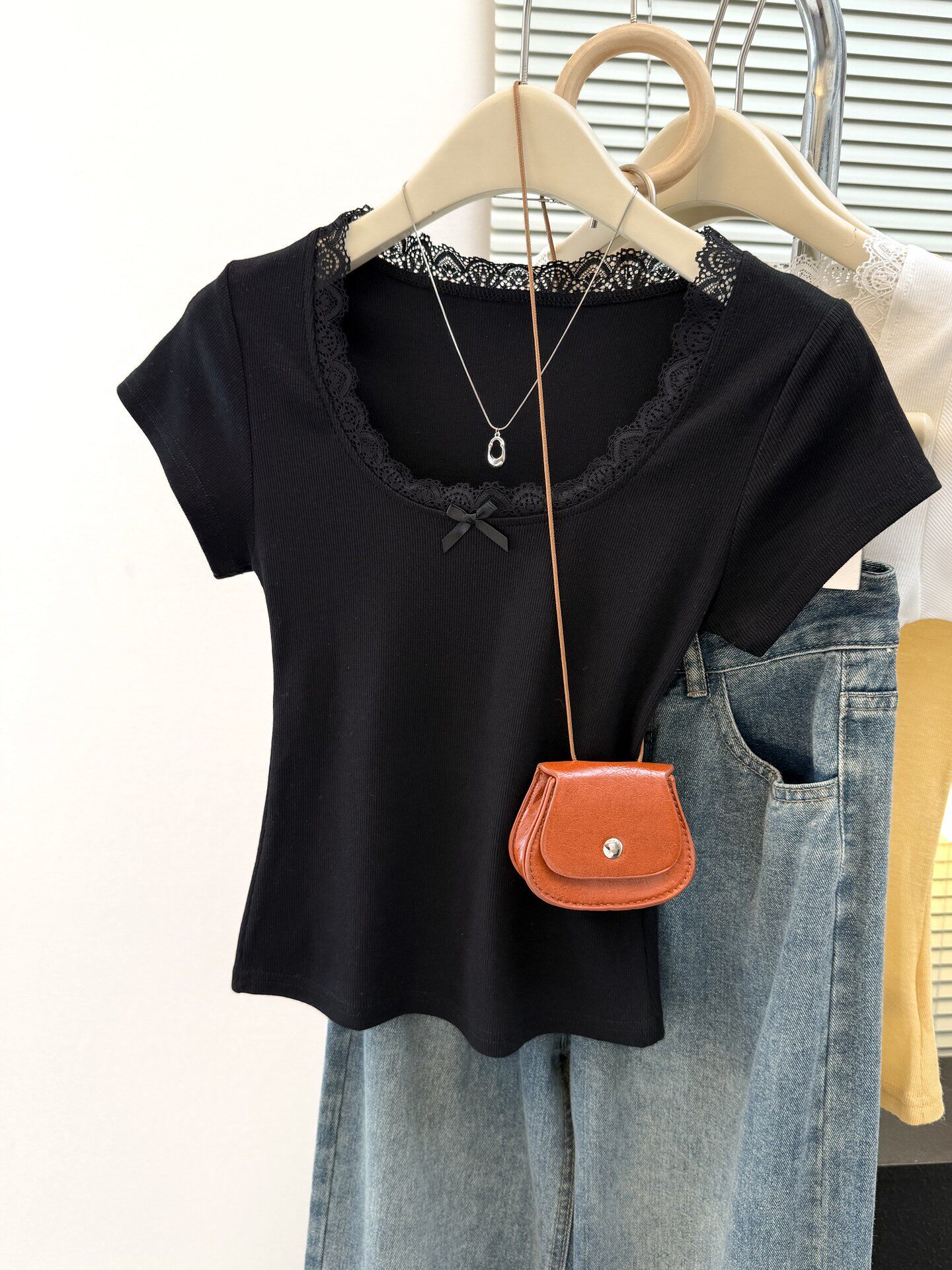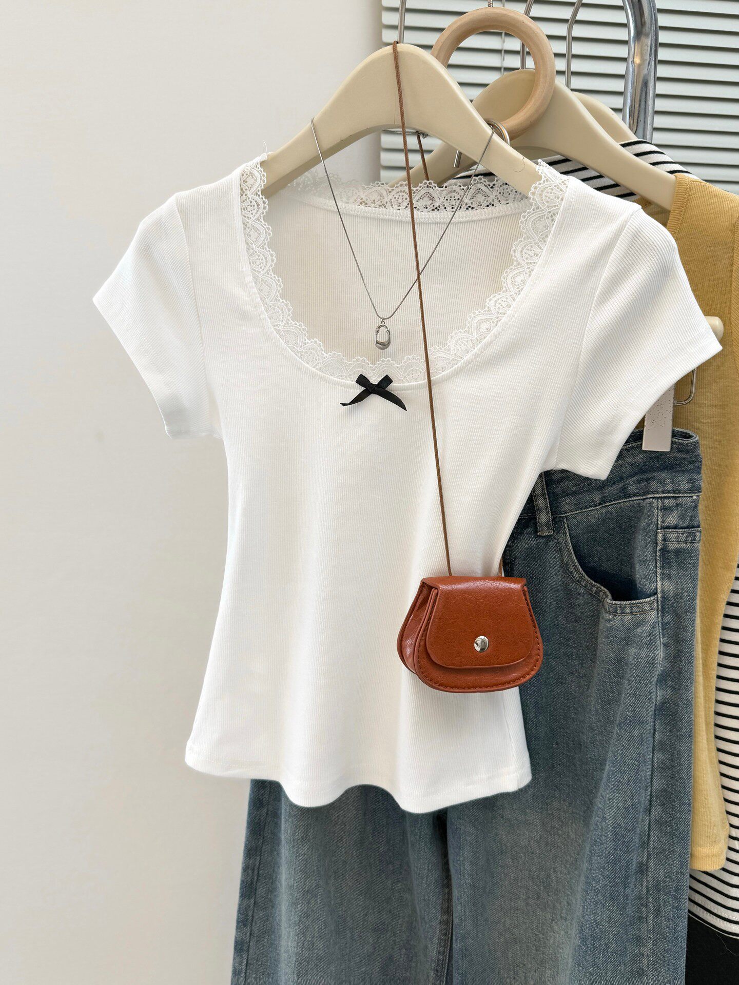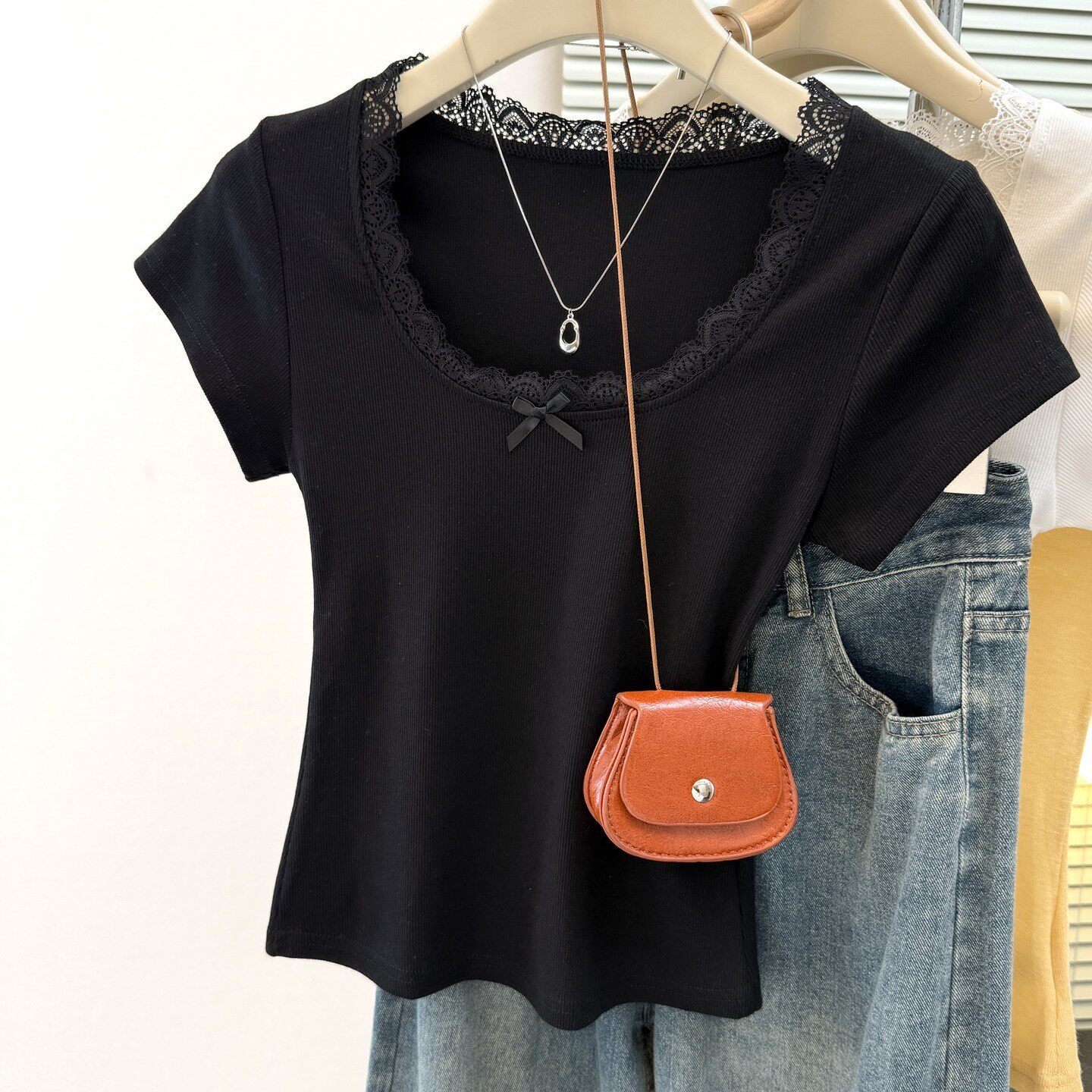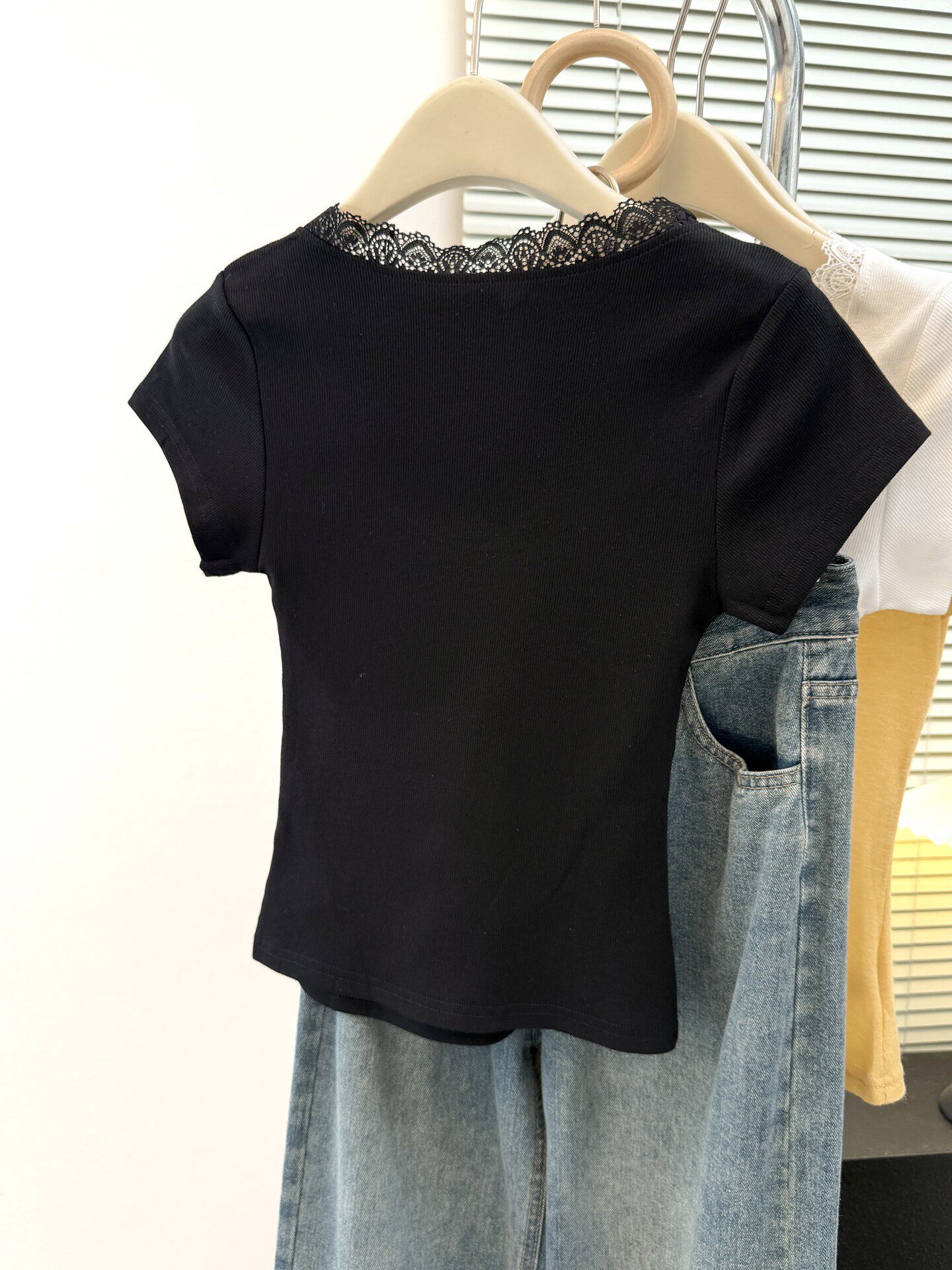 순면 리브 한 부서 달콤한 매운맛 반팔 티셔츠 여름 한국 스타일 몸매 가꾸기 인사이드 가져 가라. 외출용 기본 셔츠 u 칼라 긍정적 인 어깨 의류