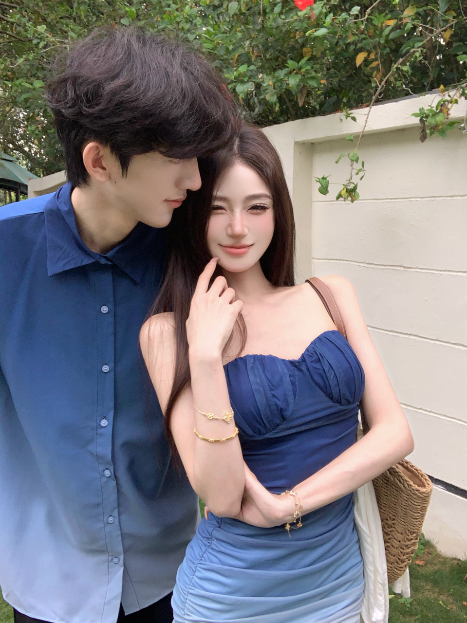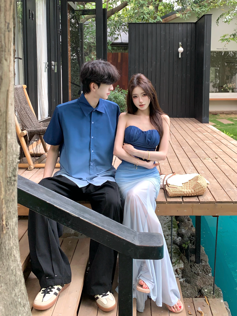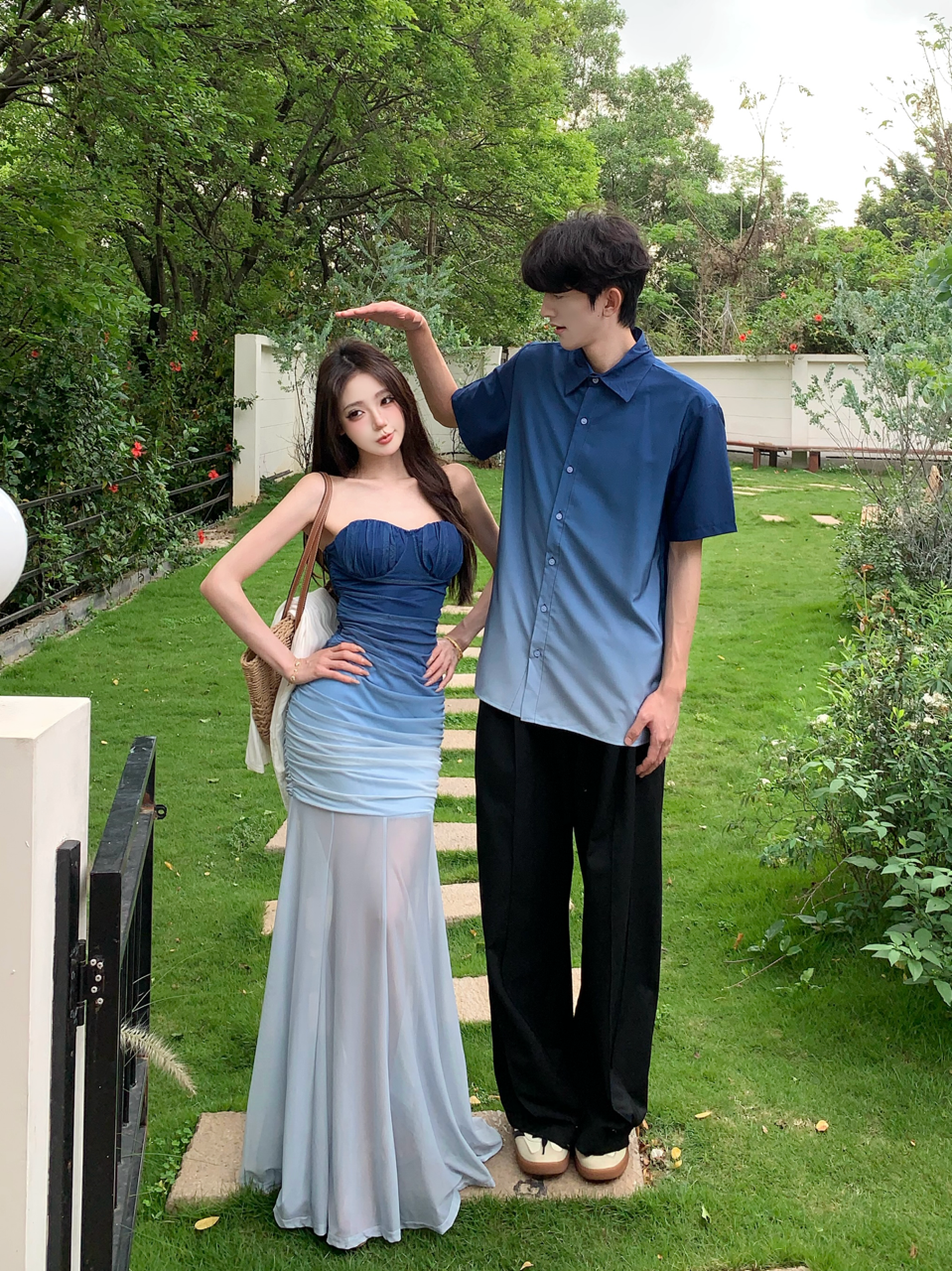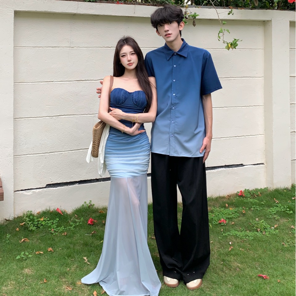 실사 프랑스식 파란색 그라데이션 튜브탑 드레스 롱 코트 타이트 스커트 인어 꼬리 스커트 해변가 휴가 바람 롱 스커트 커플룩