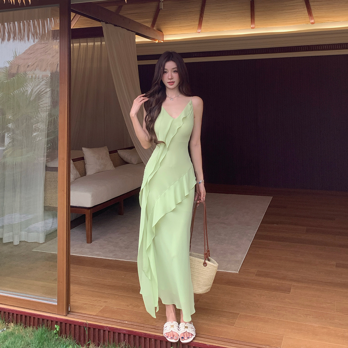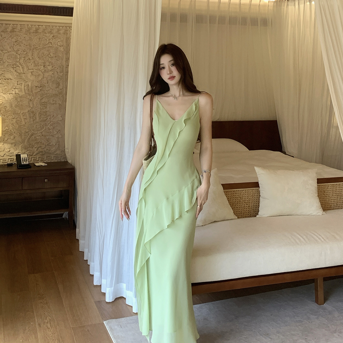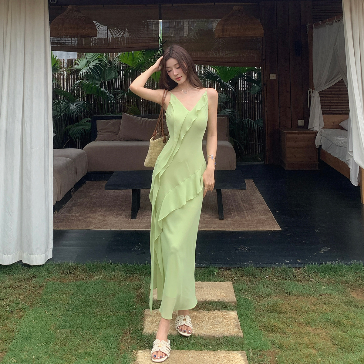 여름 새로운 빅 플레어 스커트 배수 녹색 재 V넥 민소매 슬립 드레스 3 차원 Pleat 허리 수축 롱 스커트
