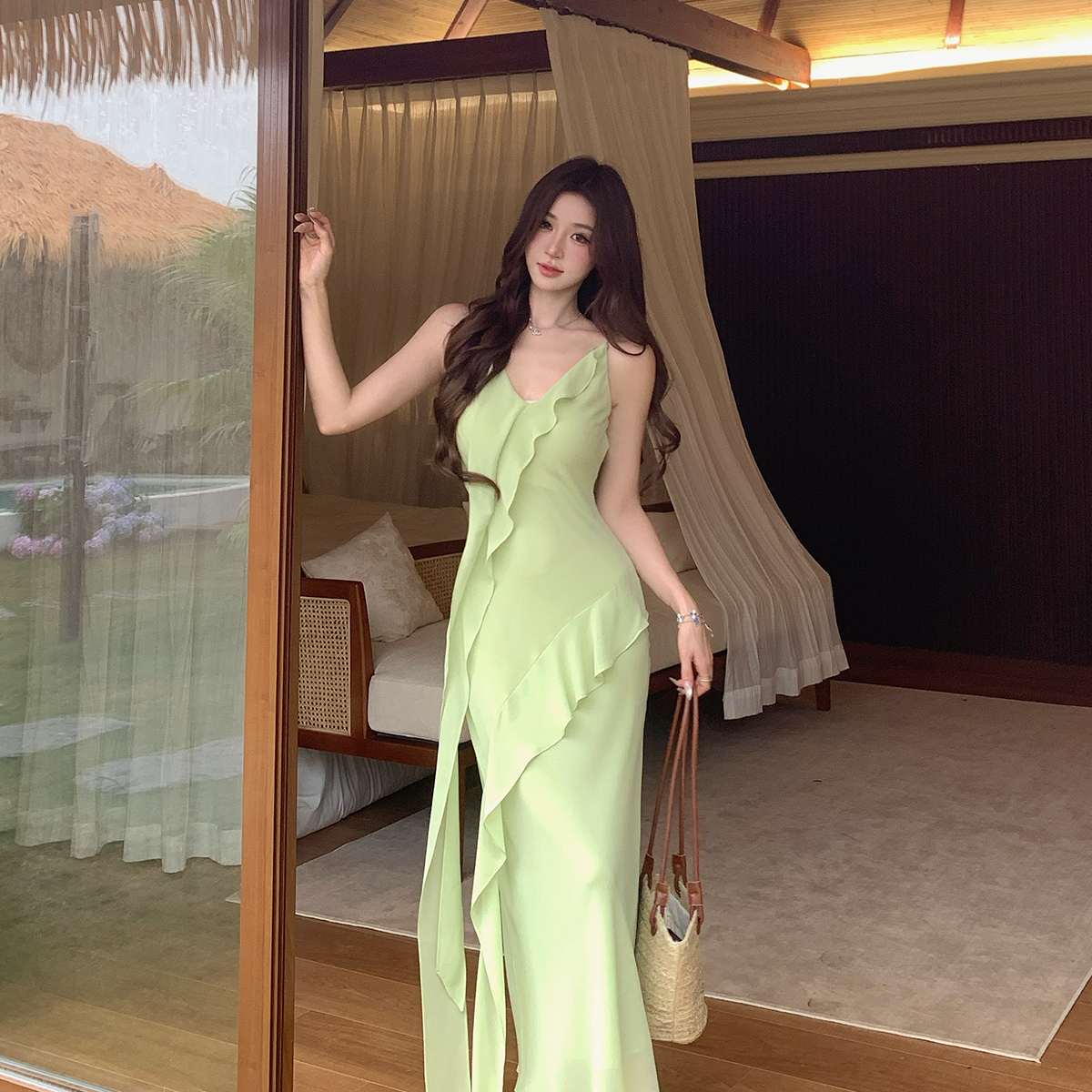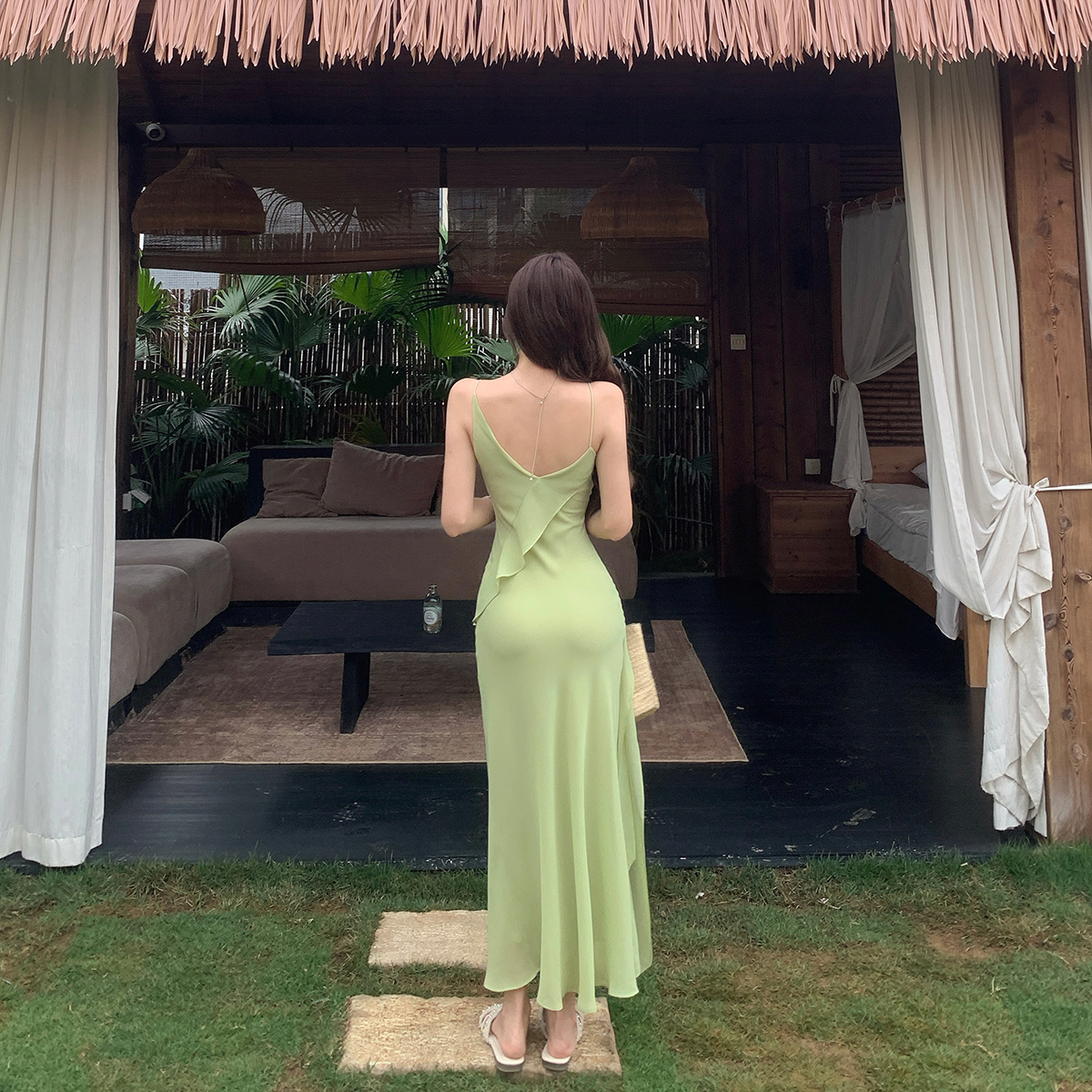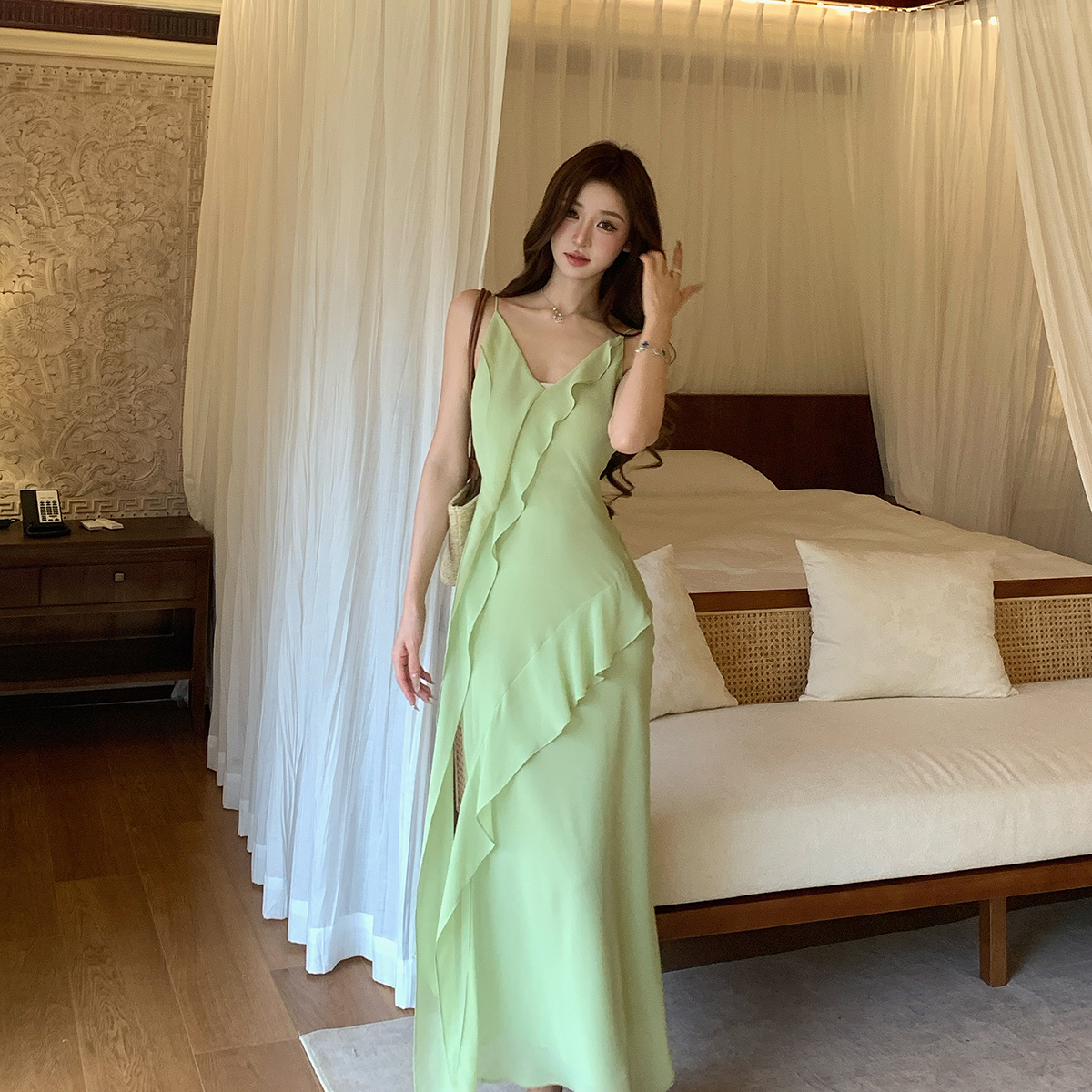 여름 새로운 빅 플레어 스커트 배수 녹색 재 V넥 민소매 슬립 드레스 3 차원 Pleat 허리 수축 롱 스커트