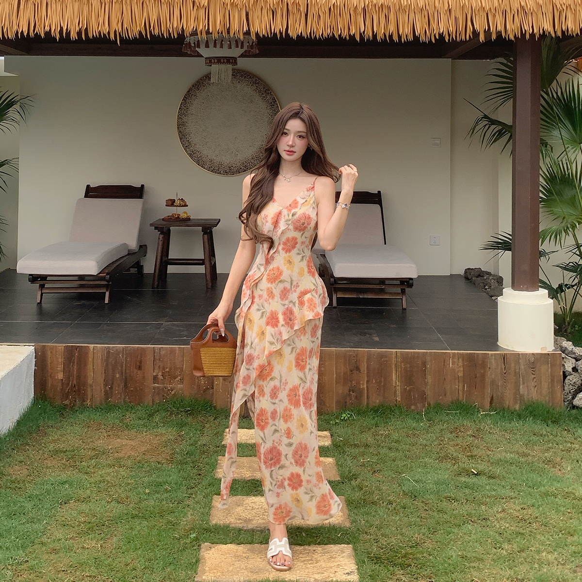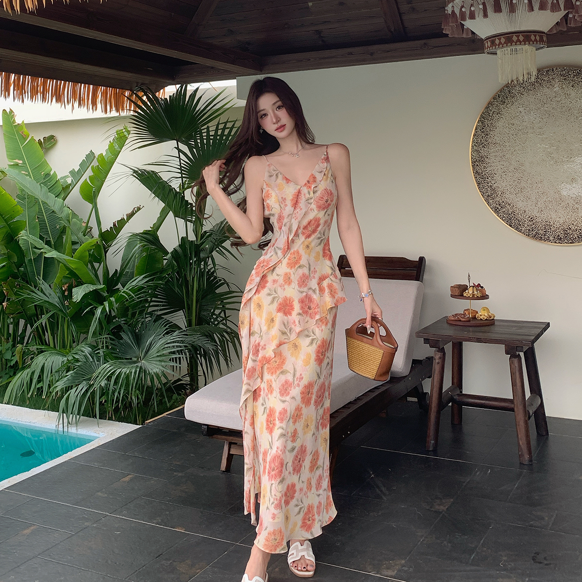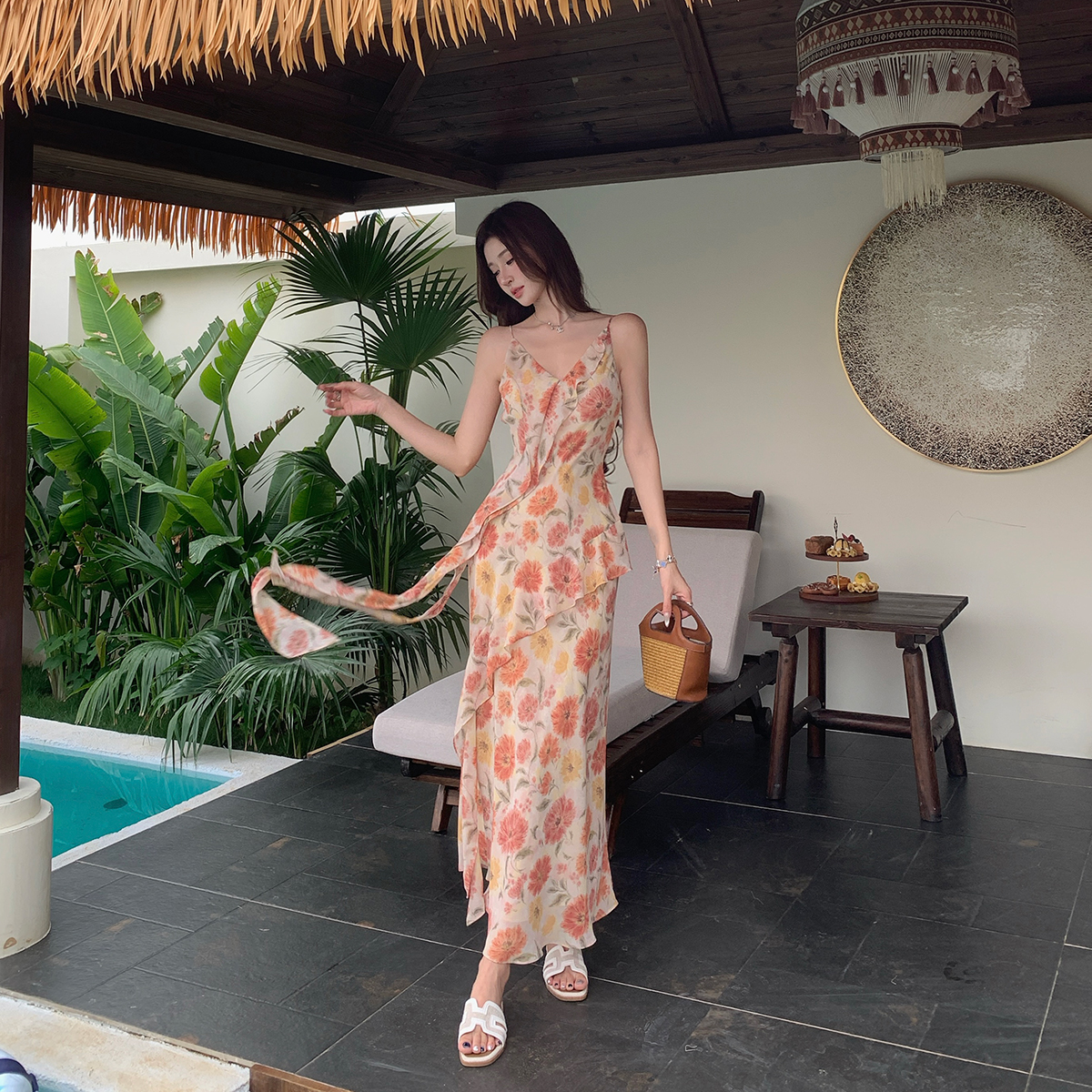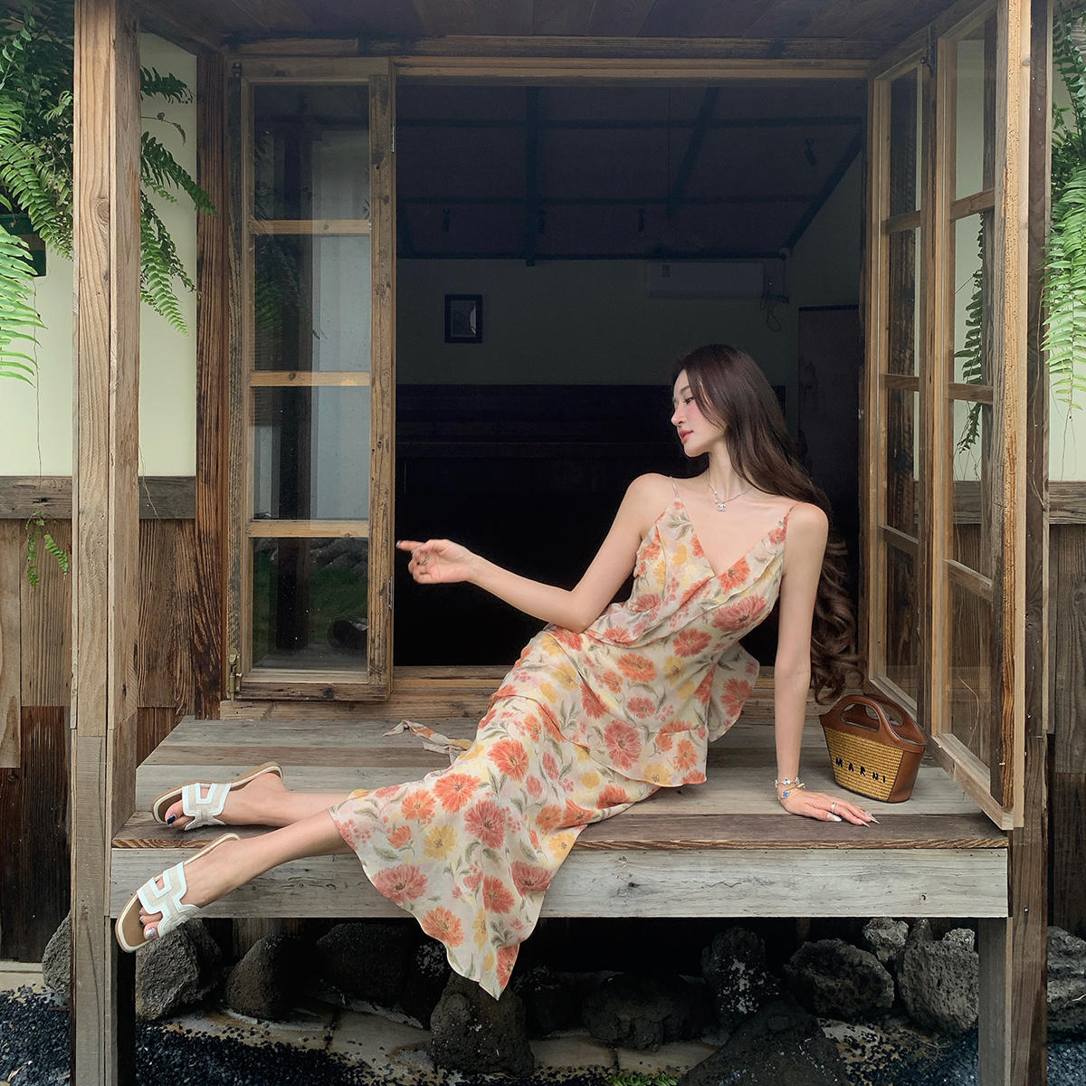 새로운 중식 쉬폰 프린트 드레스 도루 센스 슬립 흔들다 칼라 허리 수축 타이트 스커트 인어 꼬리 롱 스커트 여름