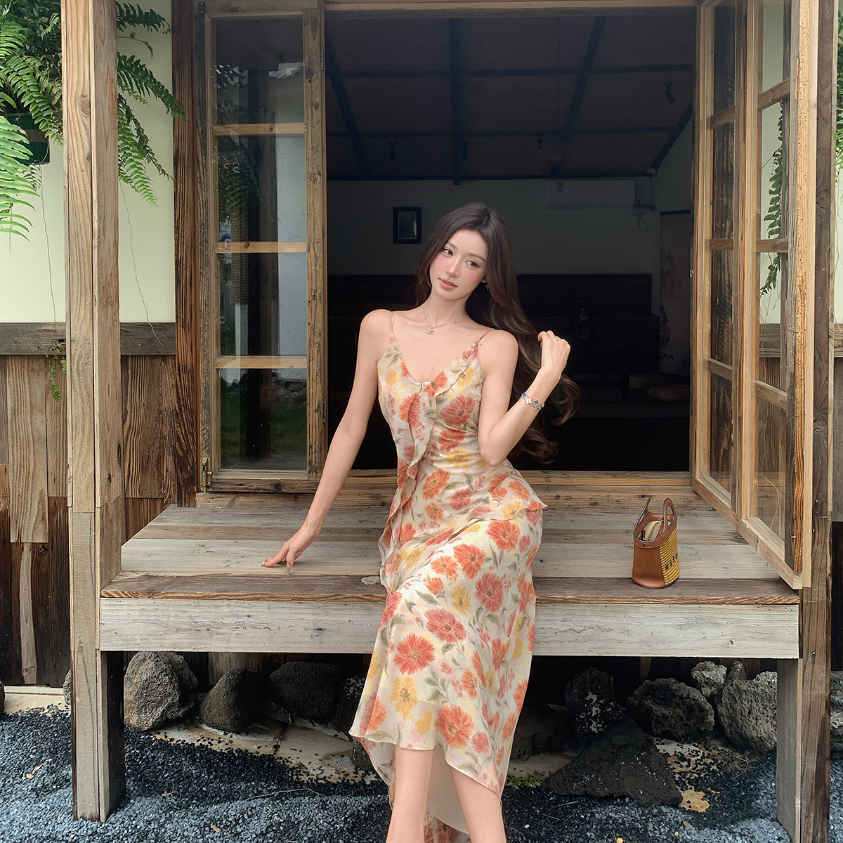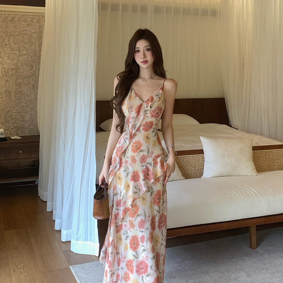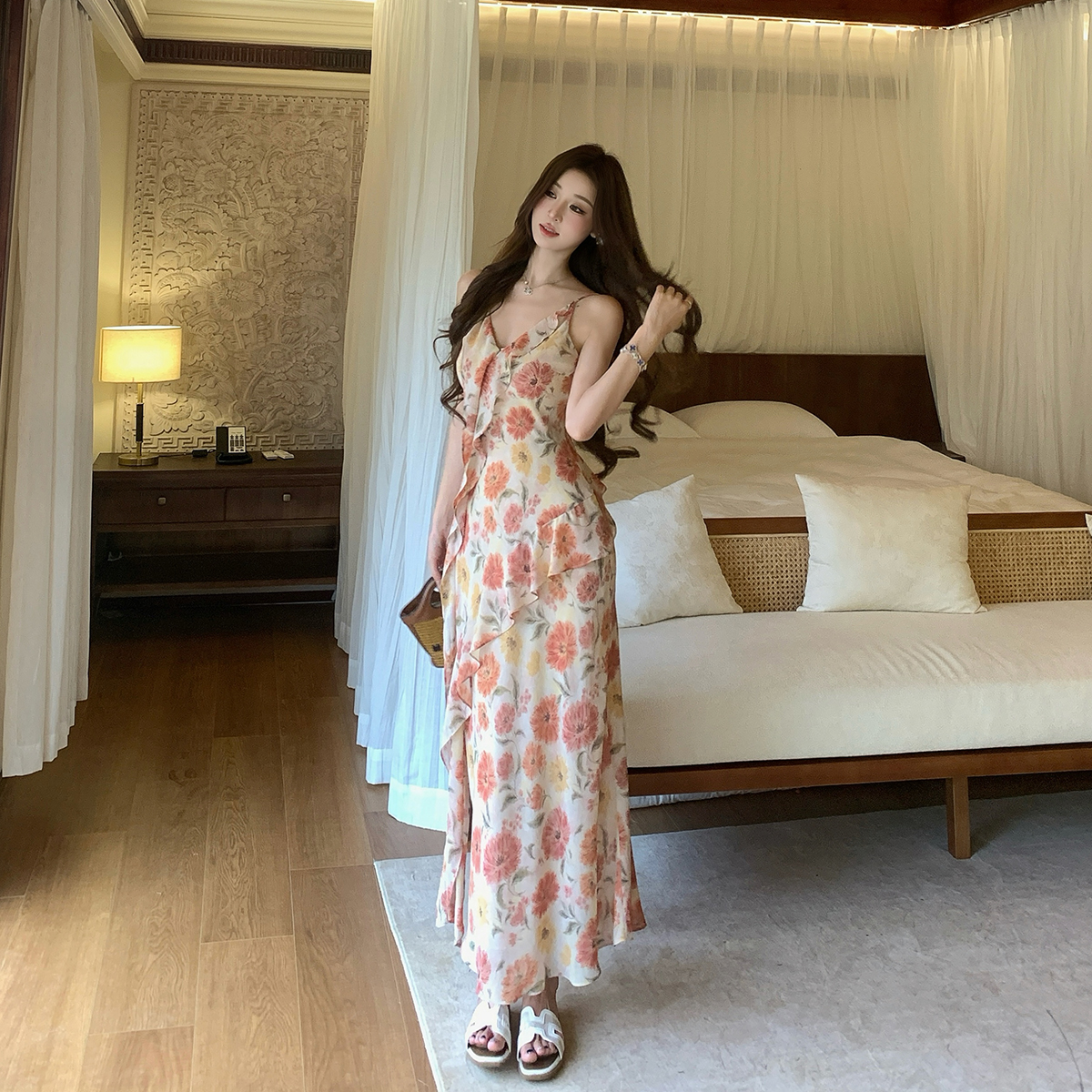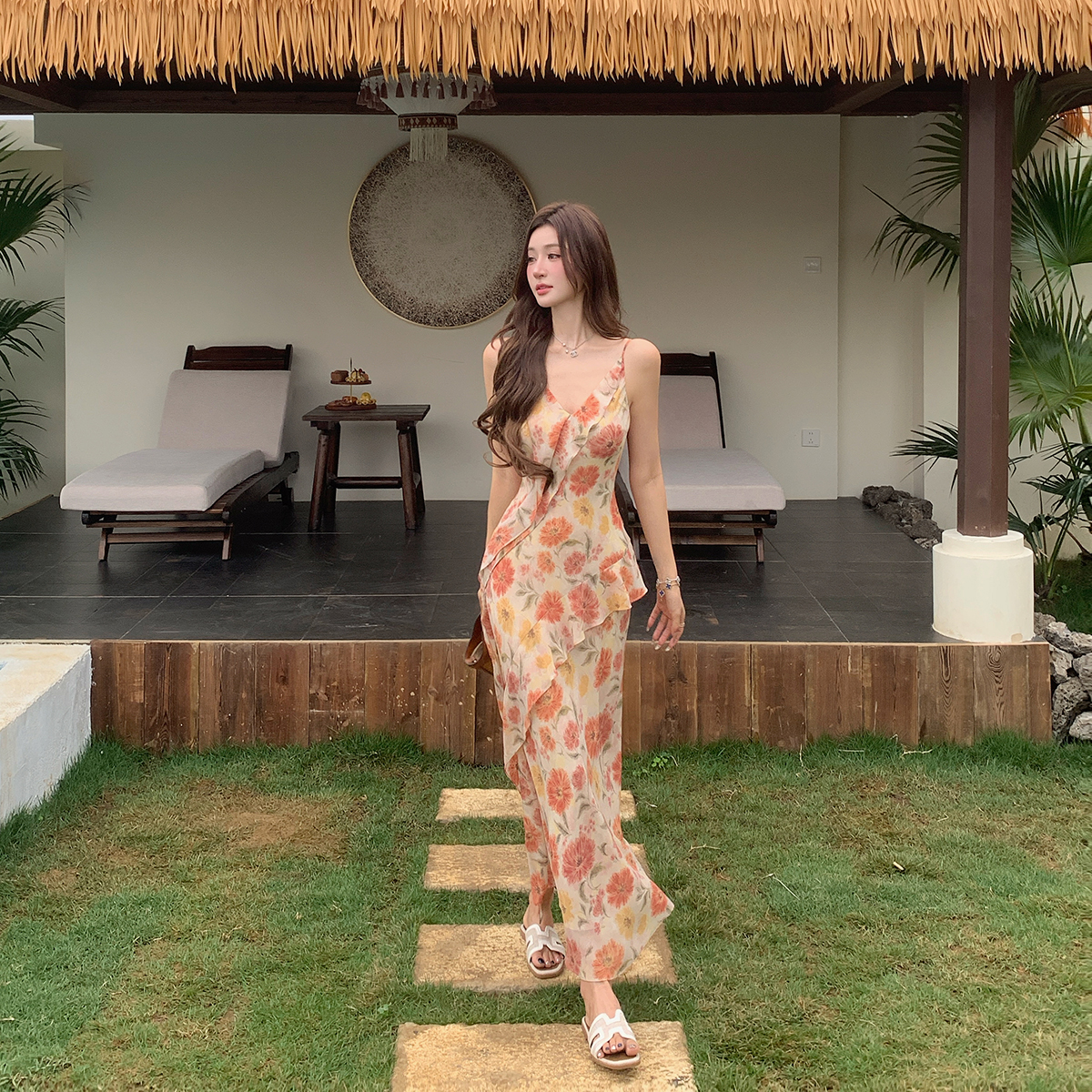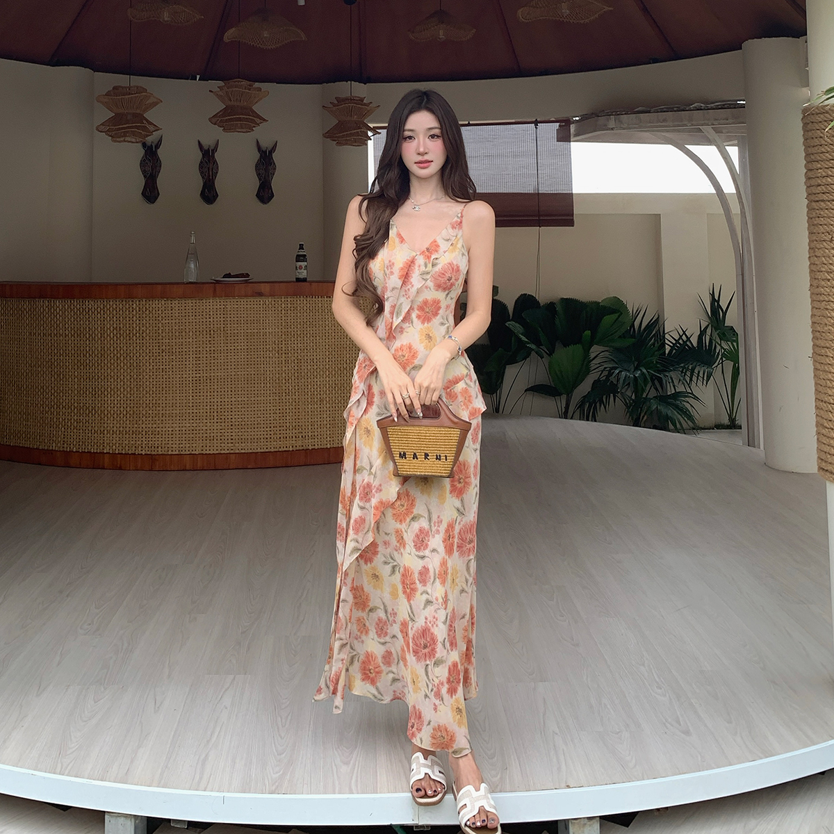 새로운 중식 쉬폰 프린트 드레스 도루 센스 슬립 흔들다 칼라 허리 수축 타이트 스커트 인어 꼬리 롱 스커트 여름