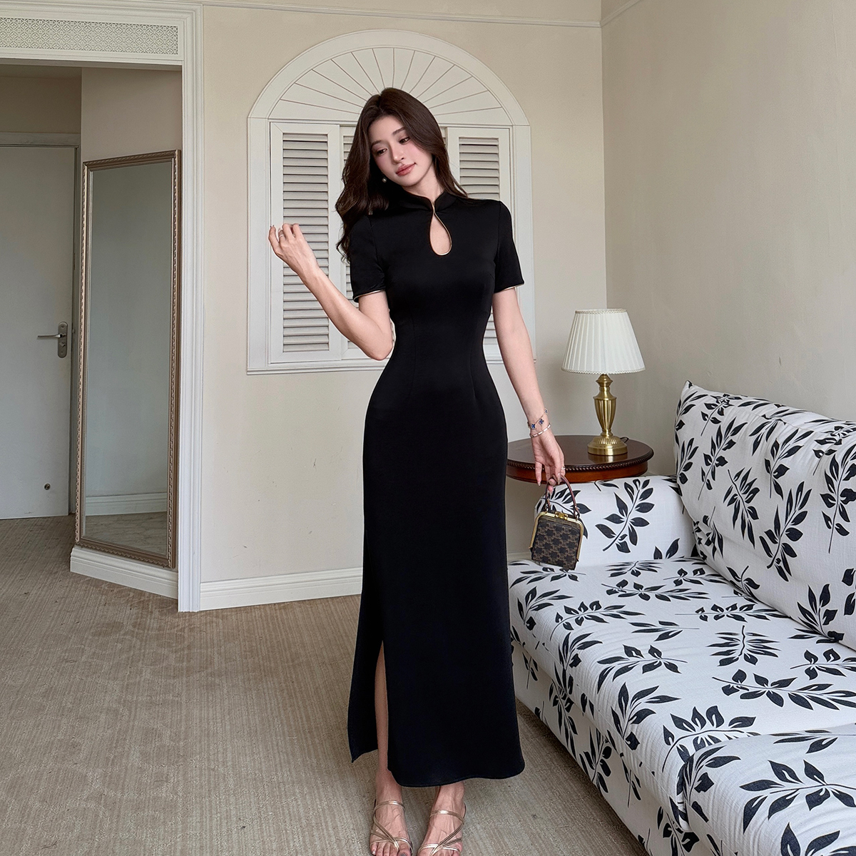 여름 새로운 개선 새로운 중식 타이트 스커트 트임 검정색 치마 주간 실크 신축성 니트 치파오 드레스