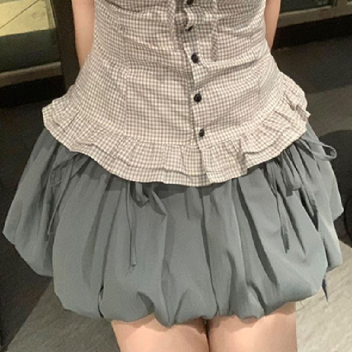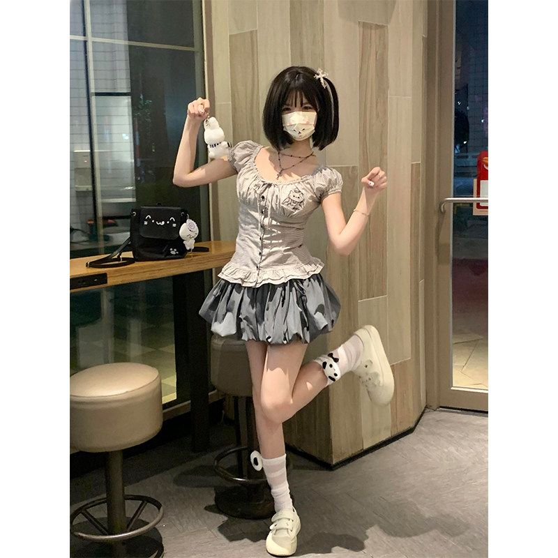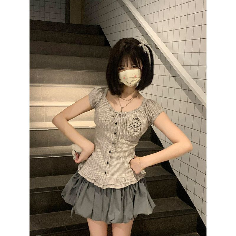 귀여운 이문화 하우스 멩 부서 고대 조기 센스 체크무늬 레이스 반팔 맨위 여성 여름 캐주얼 다용도 꽃밭 치마 세트