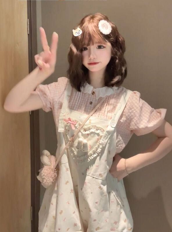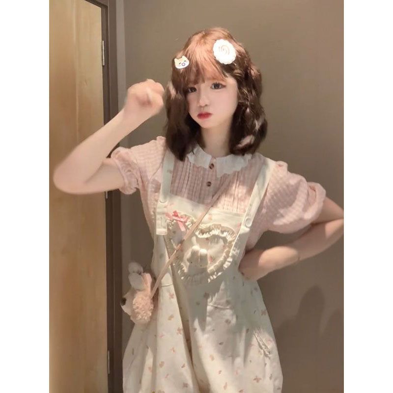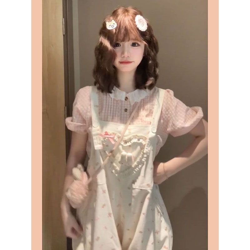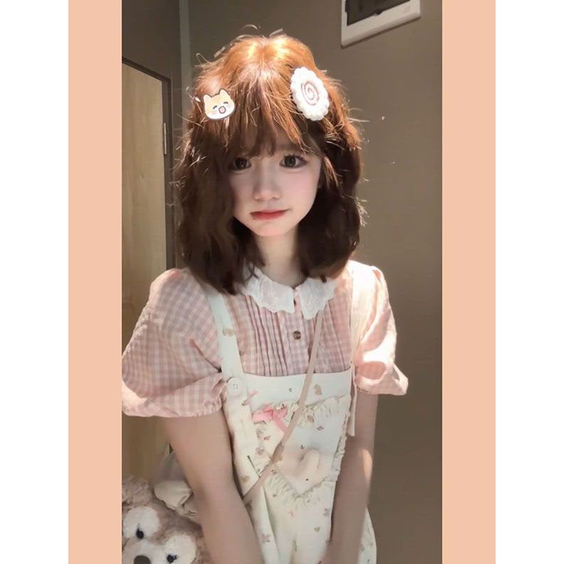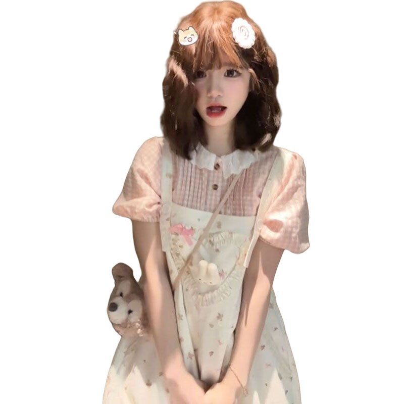 귀여운 이문화 하우스 멩 부서 고대 조기 센스 체크무늬 레이스 반팔 맨위 여성 여름 캐주얼 다용도 꽃밭 치마 세트