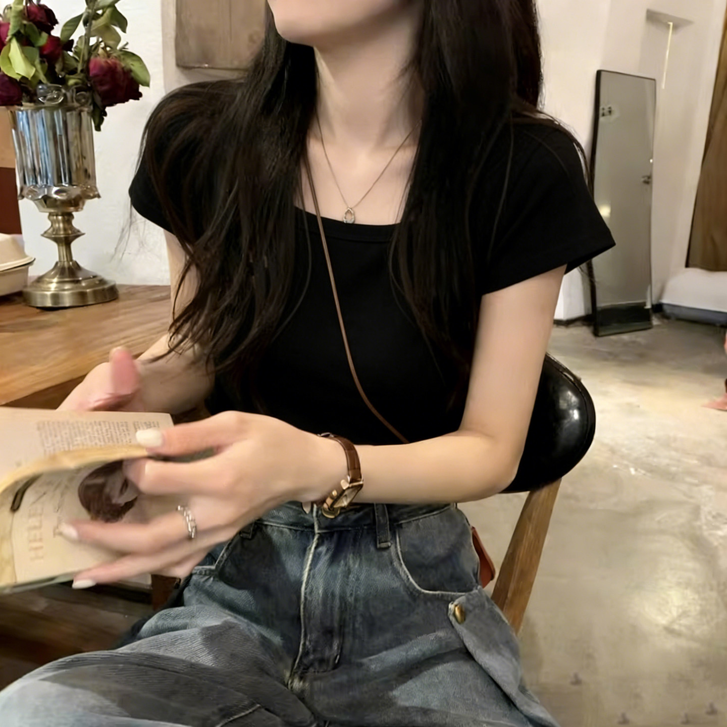 순면 리브 작은 키 쇼트 스타일 반팔 티셔츠 여성 여름 몸매 가꾸기 한국 스타일 레이스 나비 매듭 u 칼라 맨위 트렌디