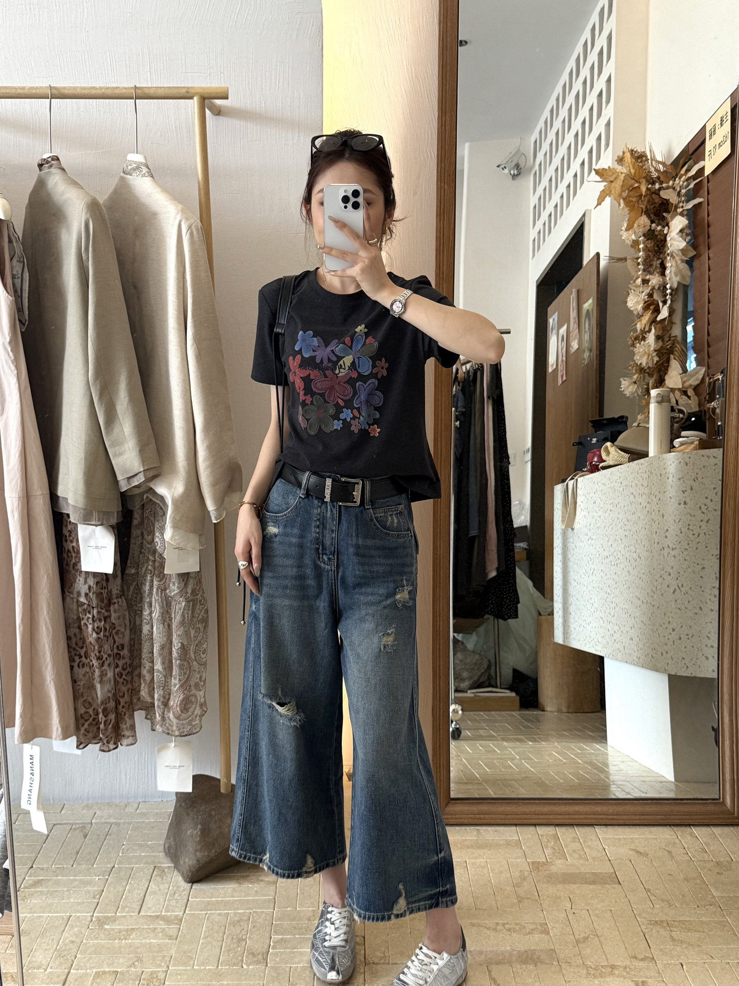 2026 여름 얇은 스타일 찢어진 부분 루즈핏 넓은 다리 청바지 여성 배 종류 몸 슬림해 보이는 작은 키 8 점 스트레이트 팬츠