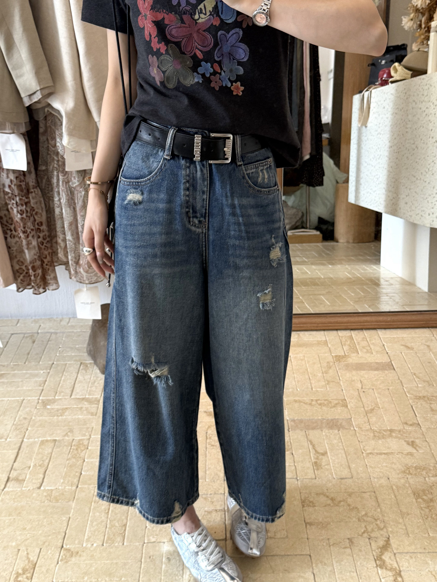 素心 블루 youmo 2026 여름 드레스 레트로 마 오래된 착용 찢어진 부분 캐주얼 8 점 와이드 레그 팬츠 청바지 여성