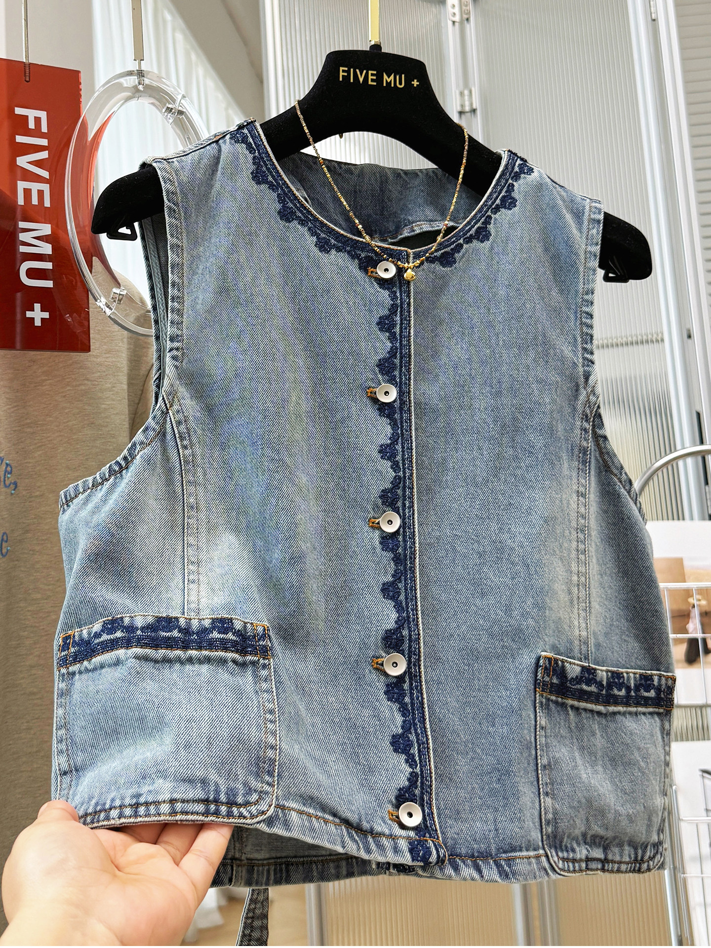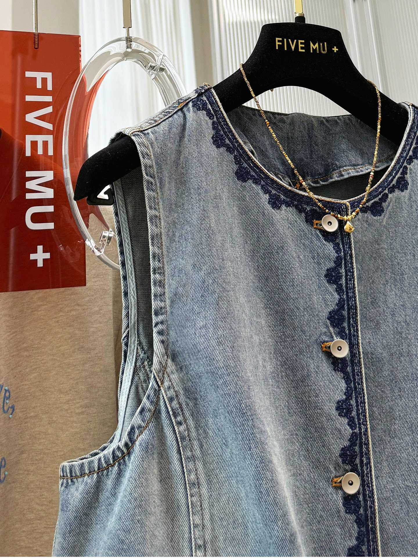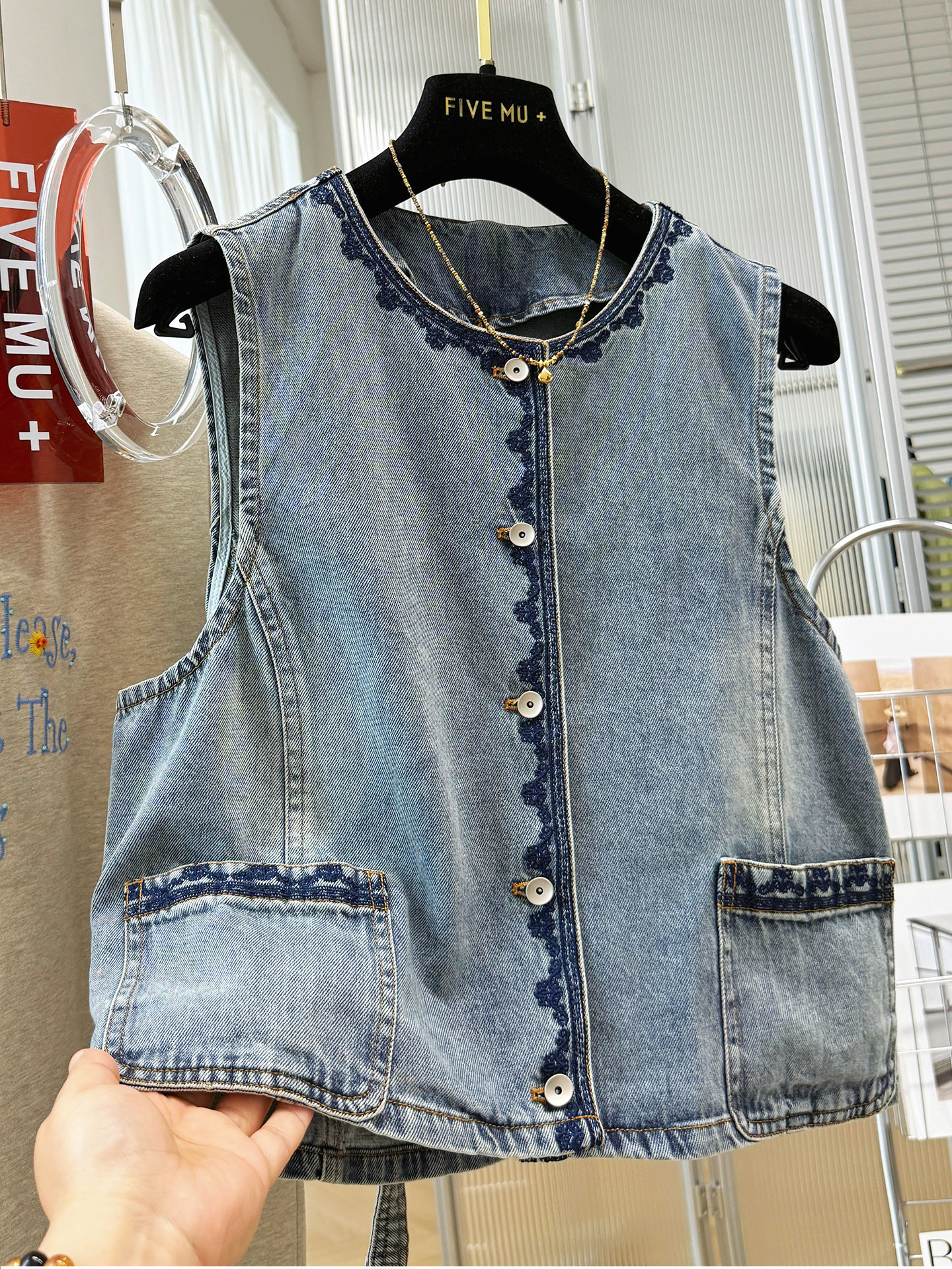 무거운 작업 자수 데님 조끼 여자 봄 드레스 새로운 자이언트 잘 생긴 라운드 넥 민소매 쇼트 스타일 어깨 조끼 스택 착용 조끼