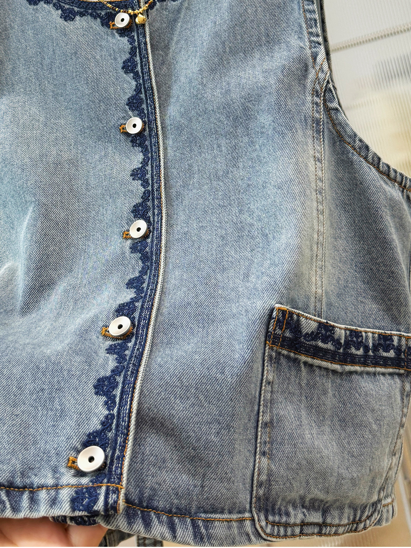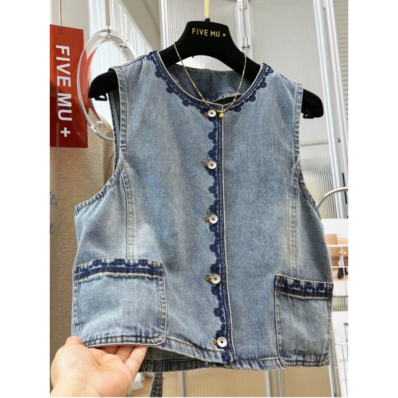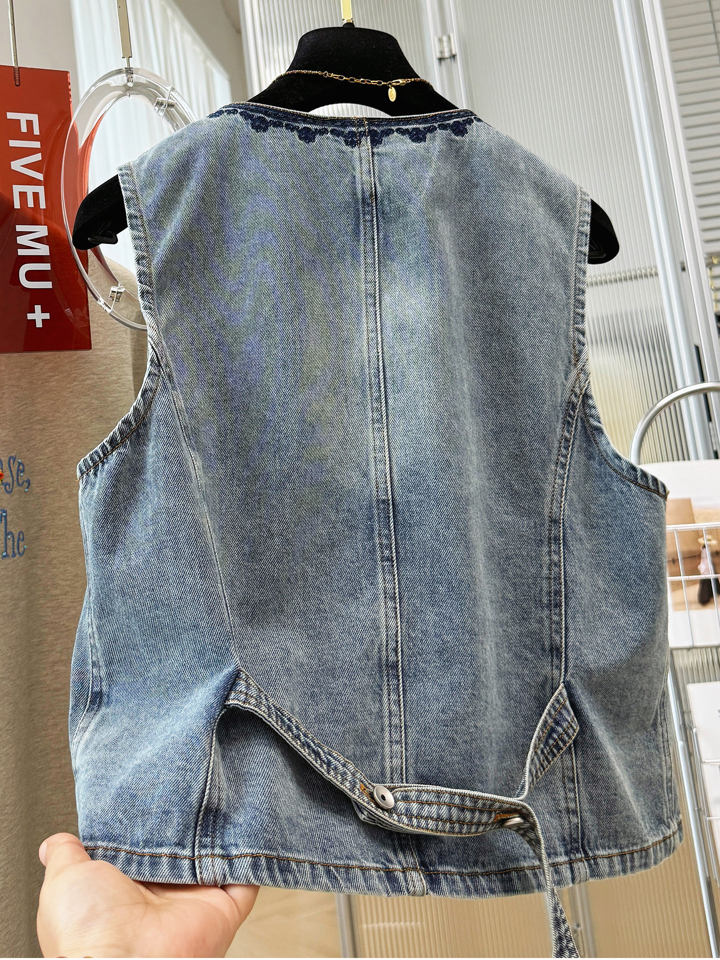 무거운 작업 자수 데님 조끼 여자 봄 드레스 새로운 자이언트 잘 생긴 라운드 넥 민소매 쇼트 스타일 어깨 조끼 스택 착용 조끼