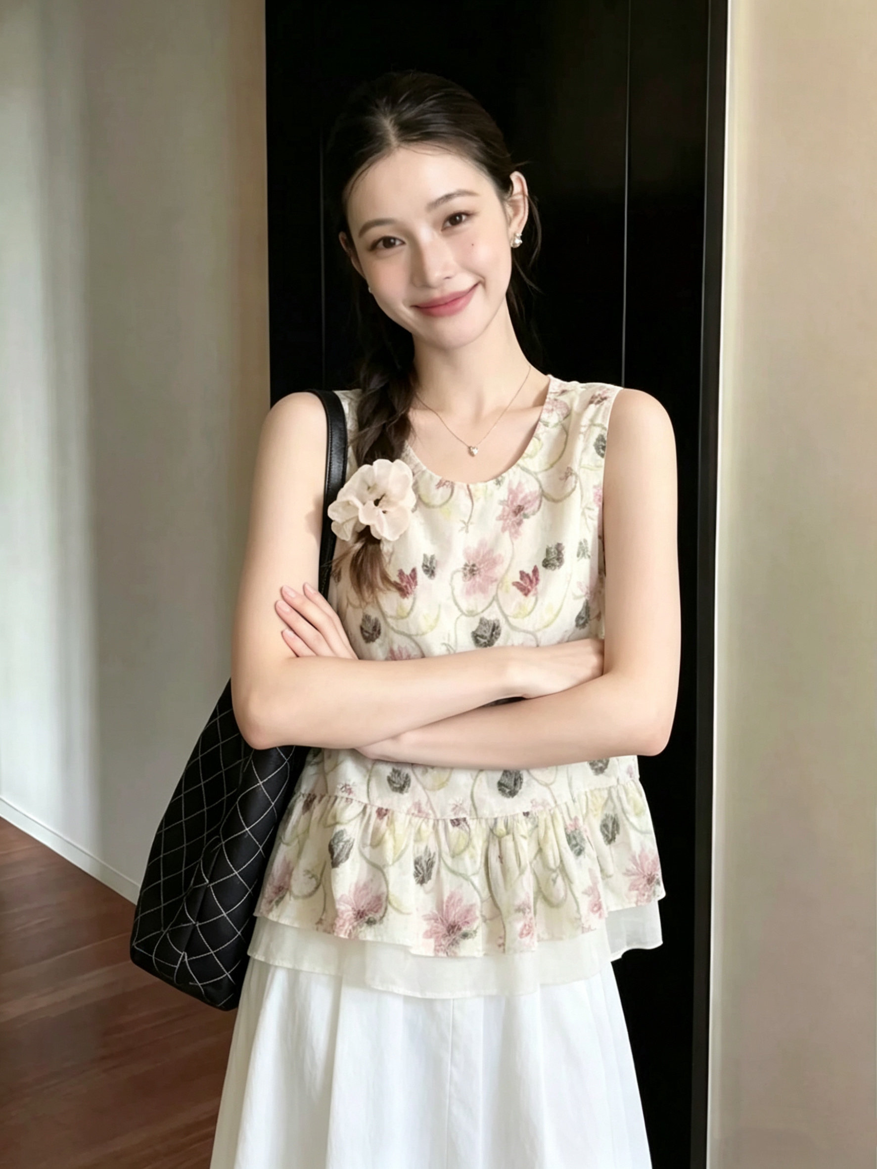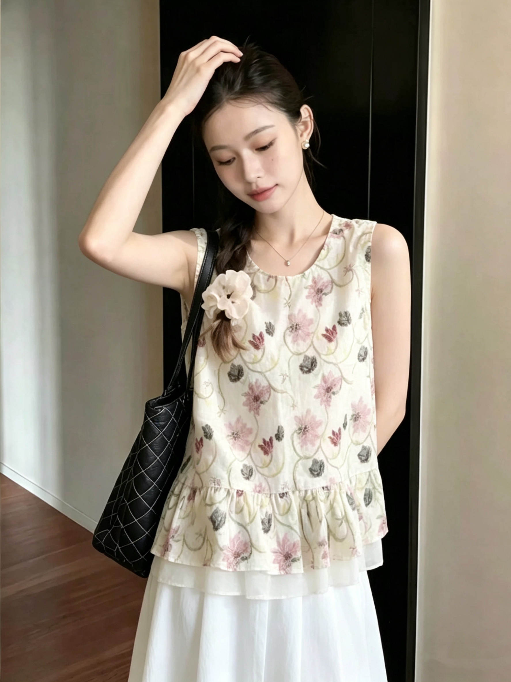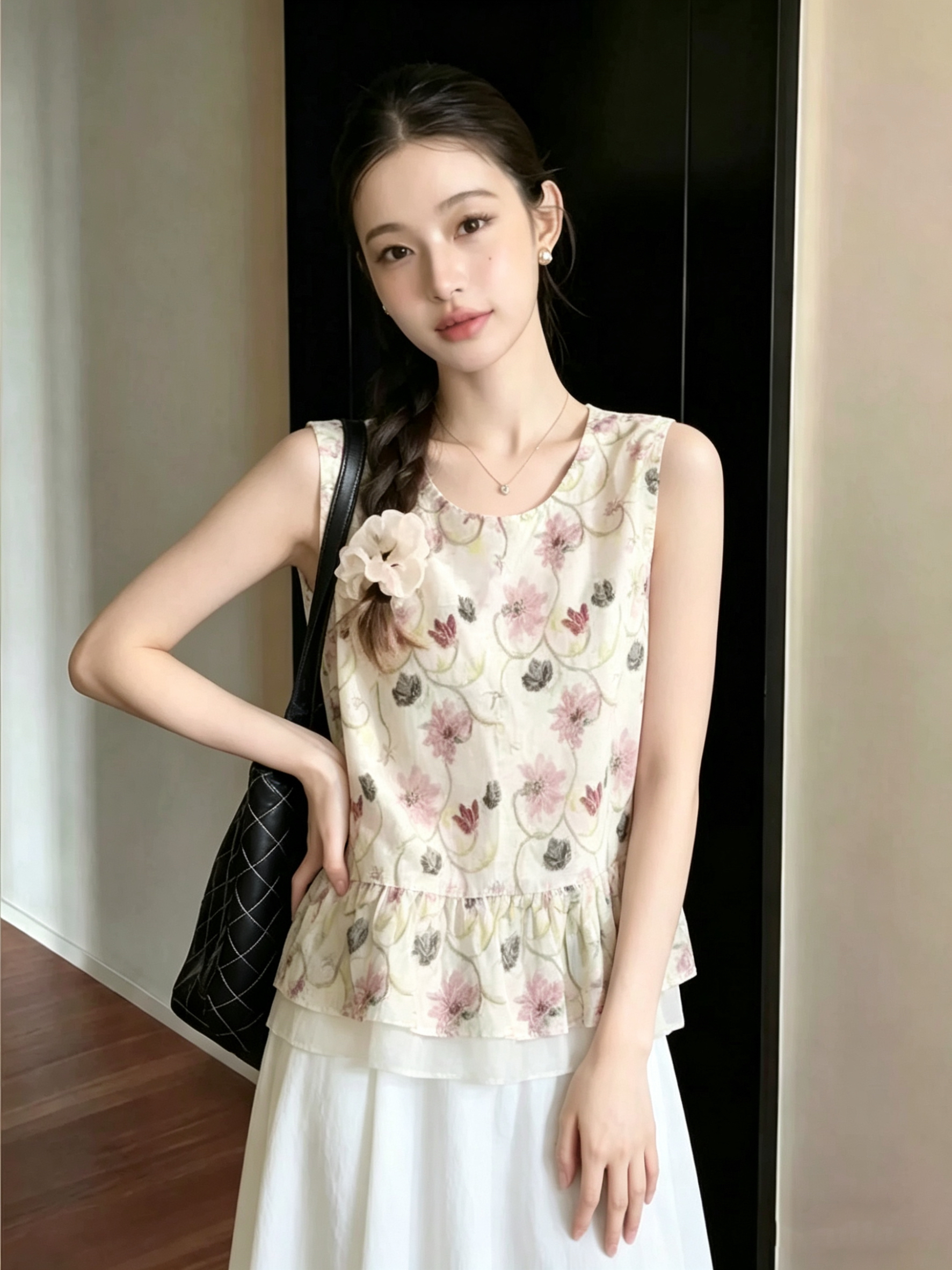 재고 있음 2026 여름 새로운 프린트 프릴 V넥 작은 셔츠 민소매 맨위