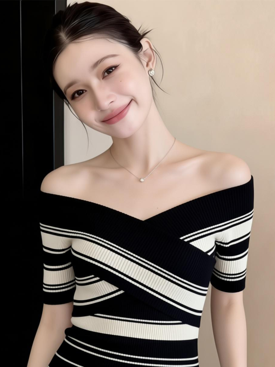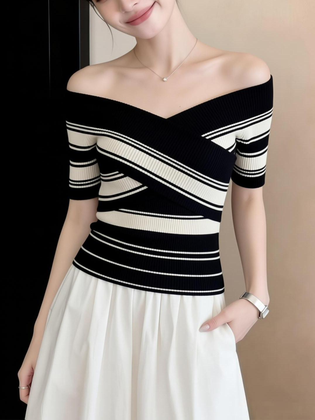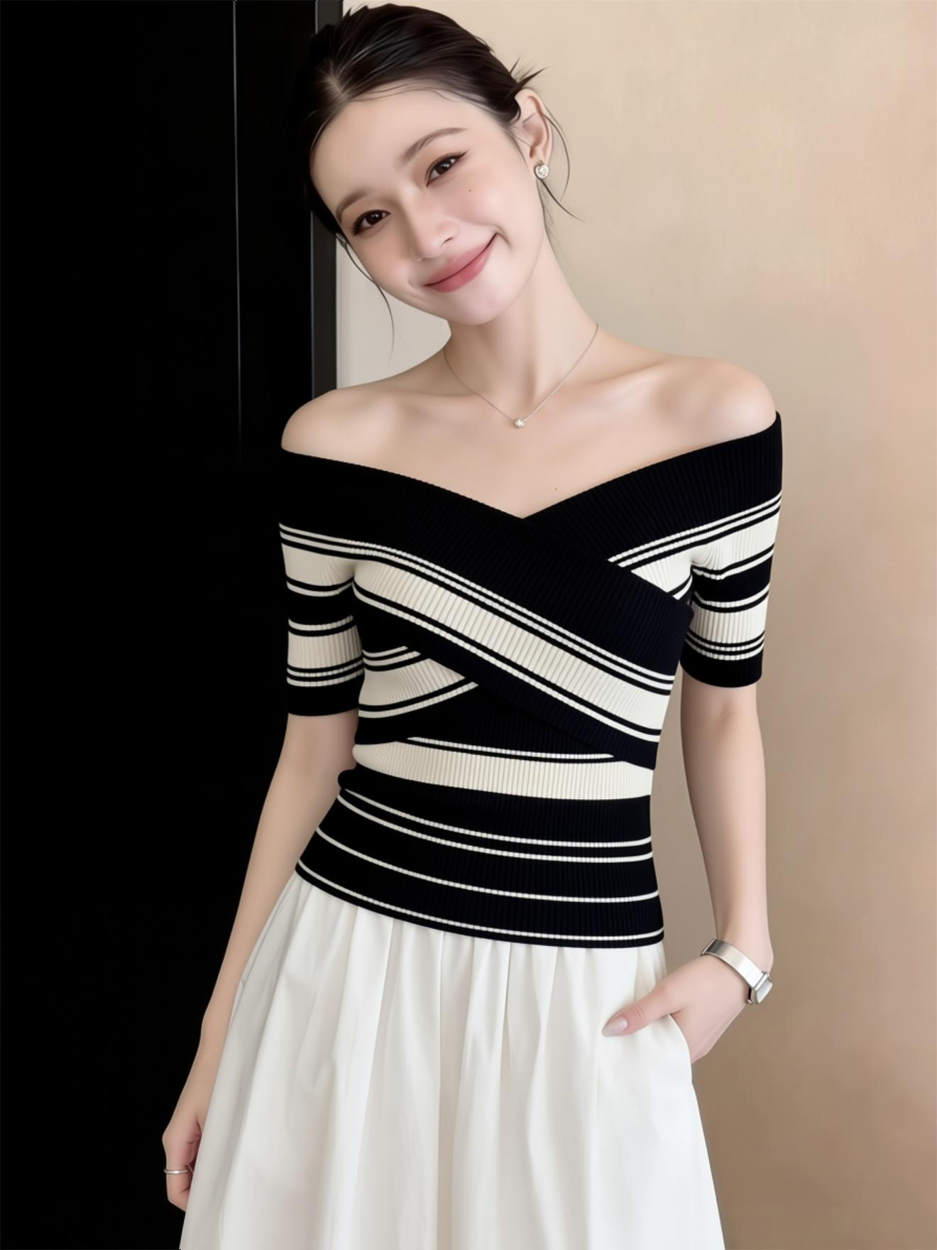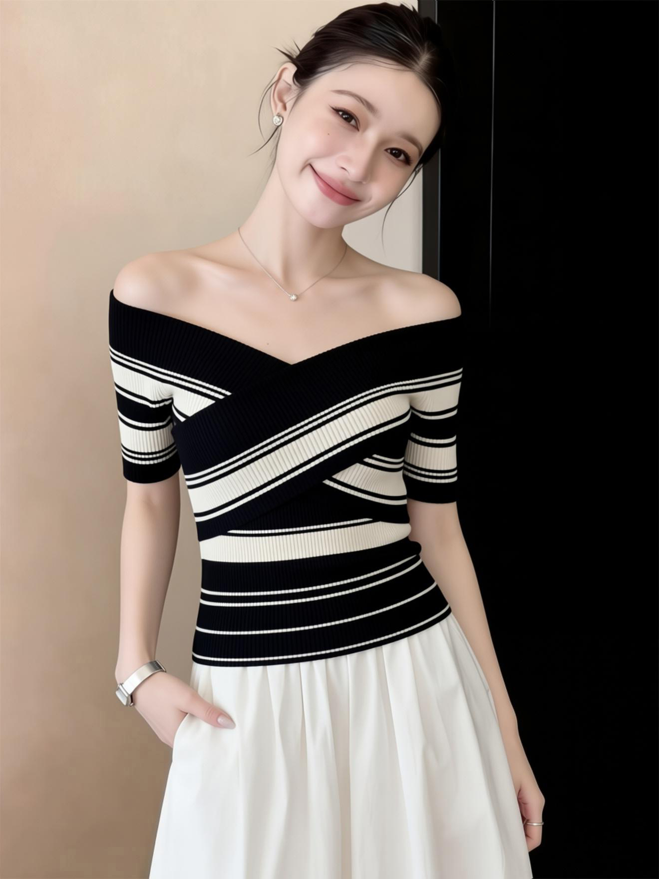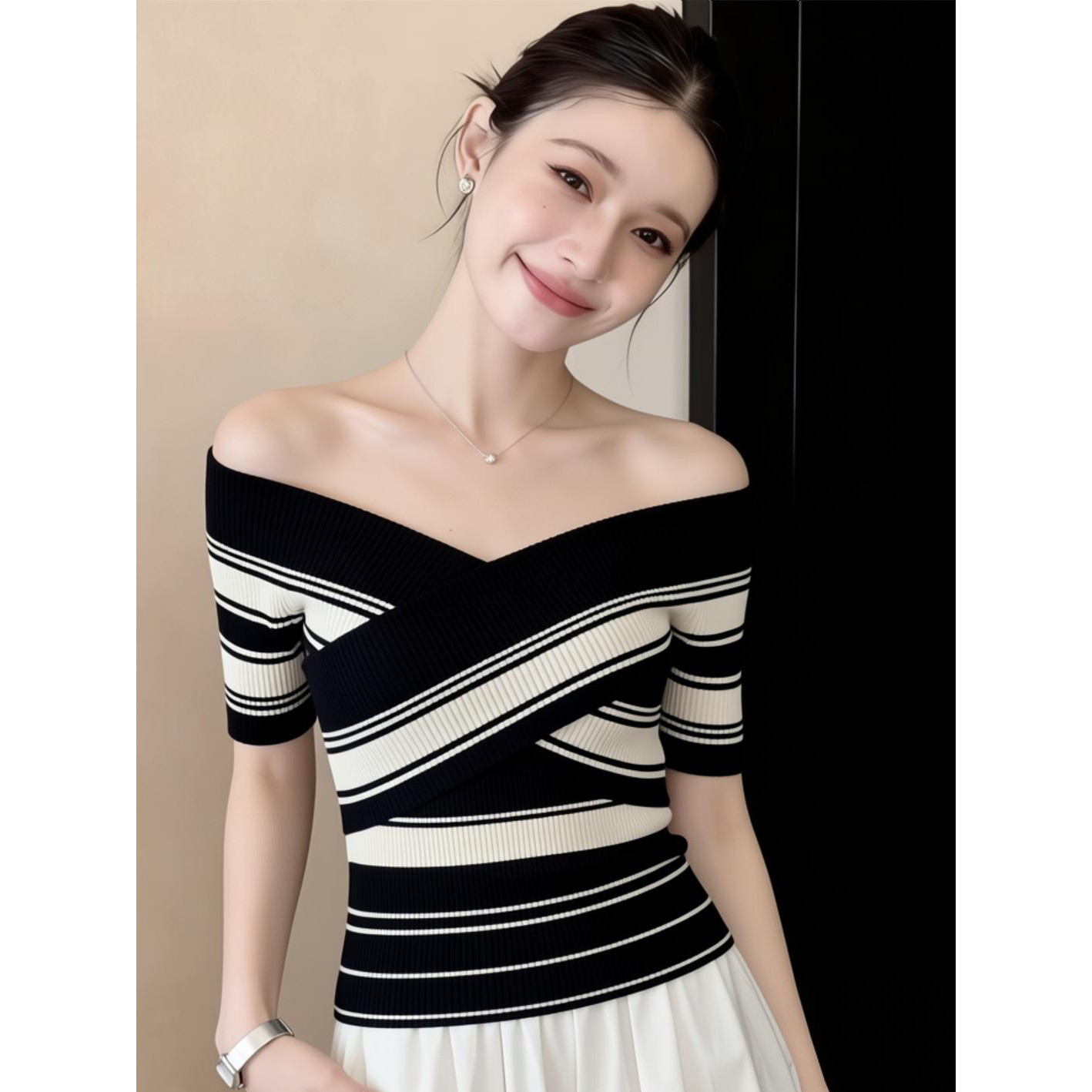 빛 럭셔리 반팔 박쥐 니트 스웨터 여성 26 여름 새로운 단색 느긋한 루즈핏 슬림해 보이는 비스듬한 어깨 오프숄더 맨위
