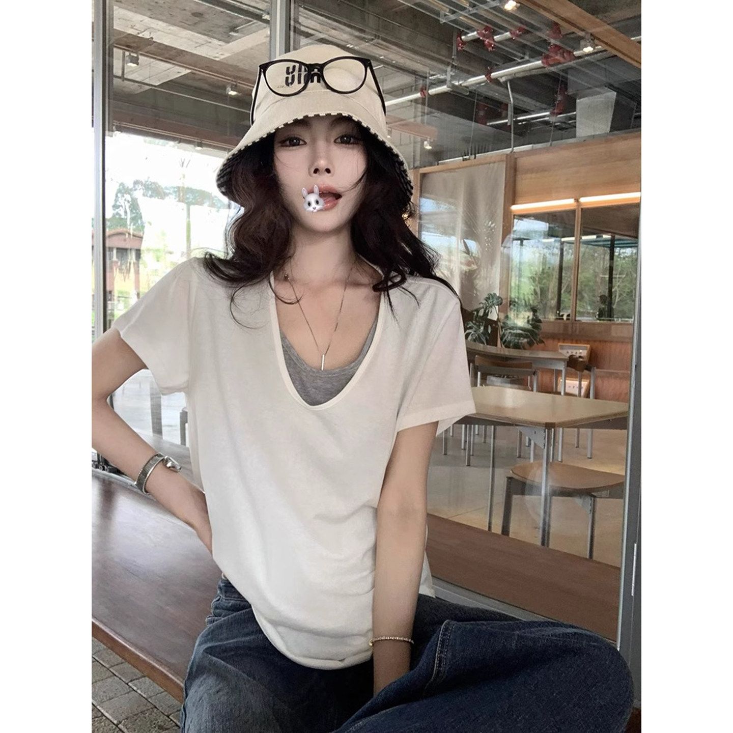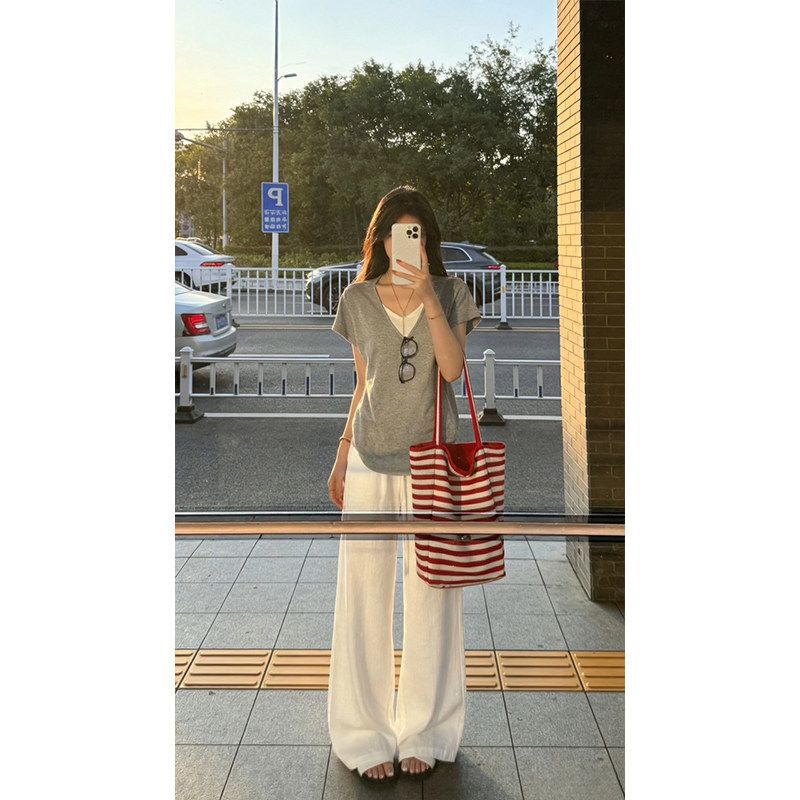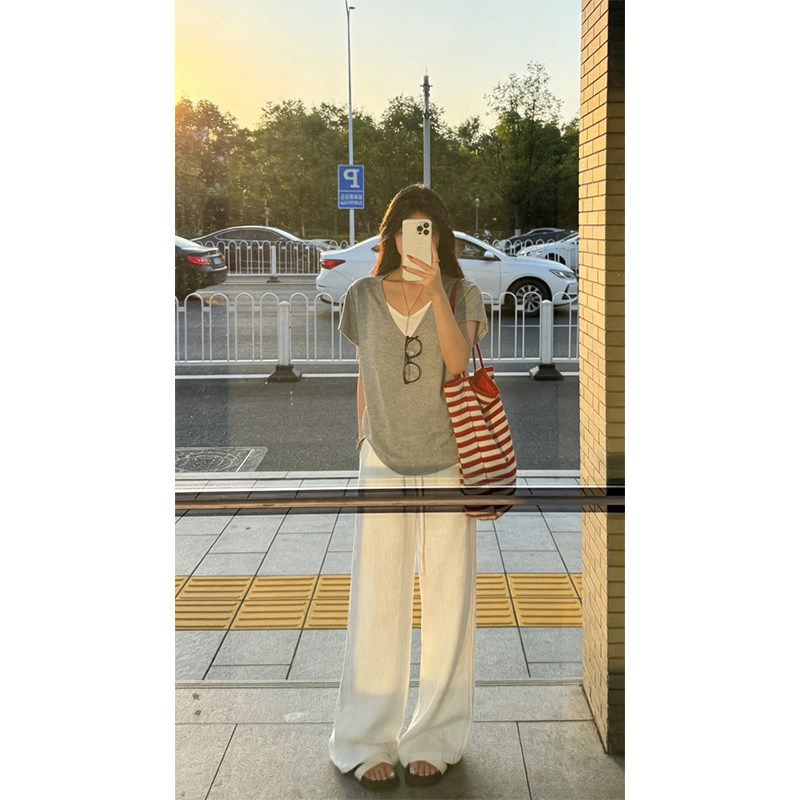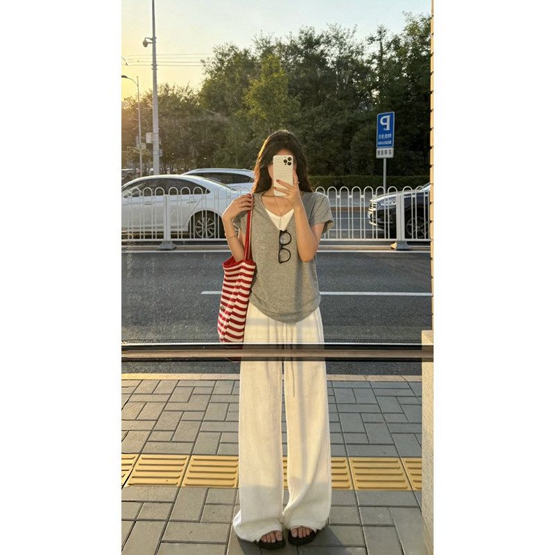 240 그램 순면 리브 92 면 8 암모니아 Lun 대 u 칼라 긍정적 인 어깨 반팔 티셔츠 여성 여름 계절풍 몸매 가꾸기 슬림해 보이는 맨위