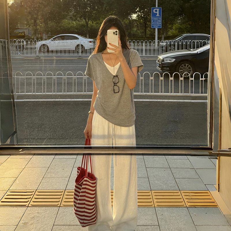 패치워크 페이크 레이어드 흔들다 칼라 민소매 티셔츠 여름 몸매 가꾸기 허리 수축 핫걸 몸매 가꾸기 맨위