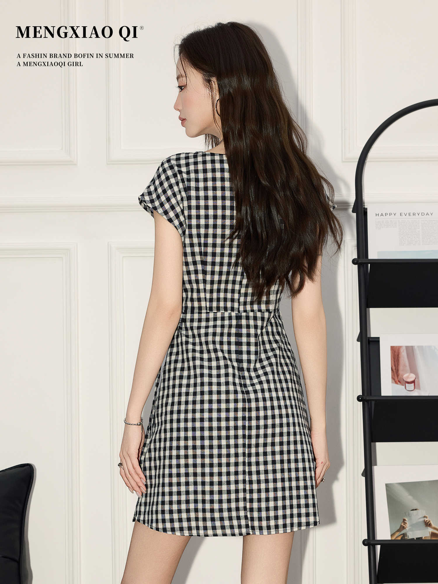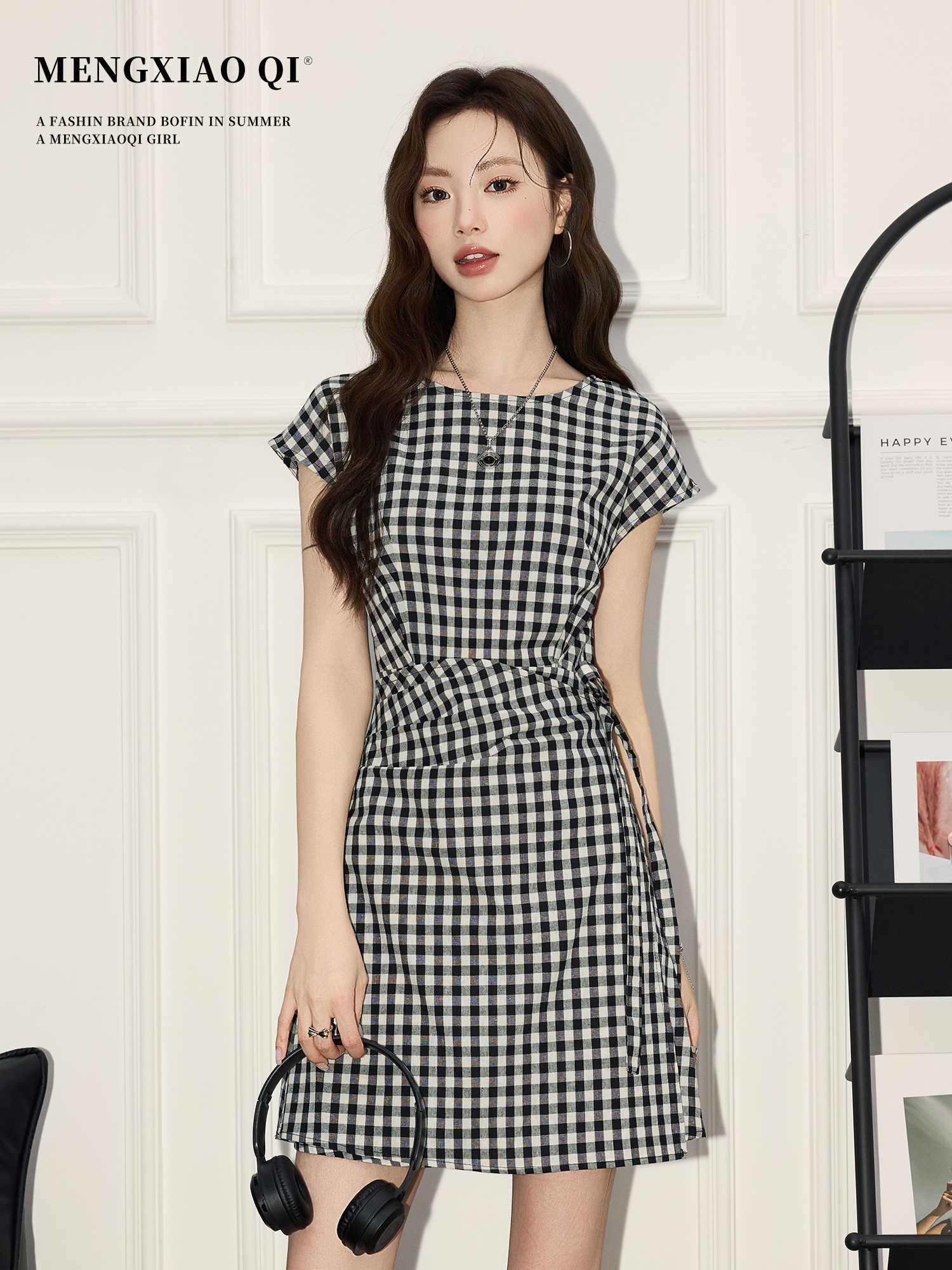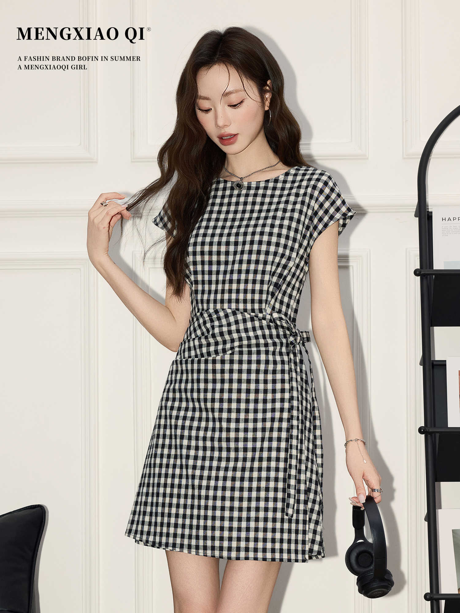 몽골 작은 SEVEN 프랑스식 품격 흑인과 백인 체크무늬 허리 수축 여성 드레스 여름 디자인 센스 캐주얼 차 휴식 슬림해 보이는 치마