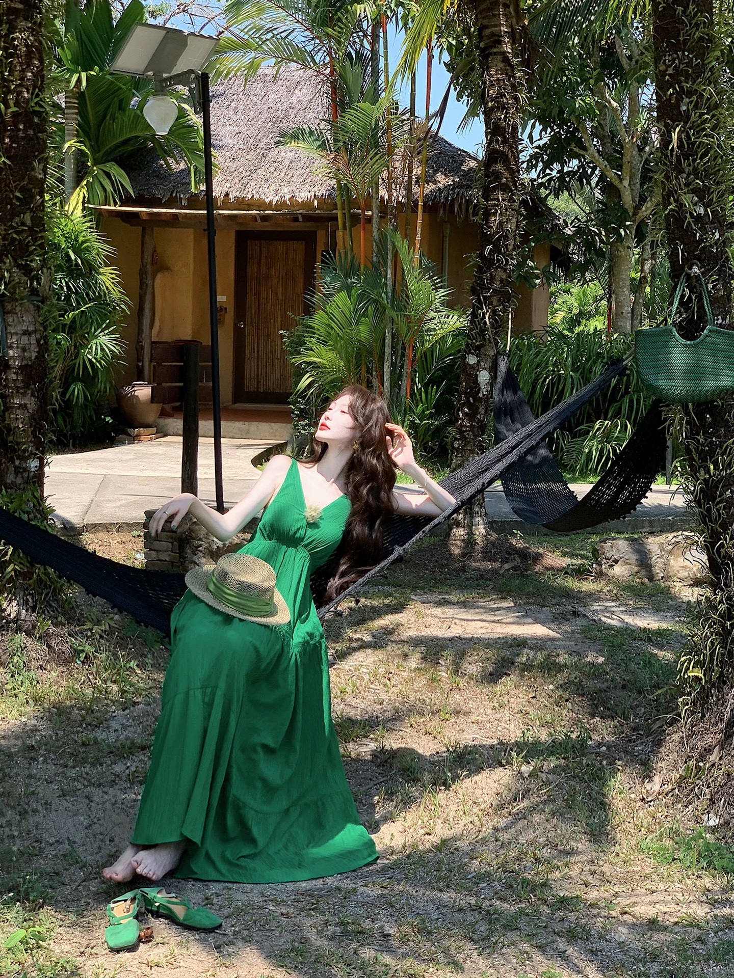 먹는다. 녹색 접시 오즈의 마법사 녹색 주름 질감 휴가 바람 슬립 드레스 V넥 롱 코트 여성 드레스