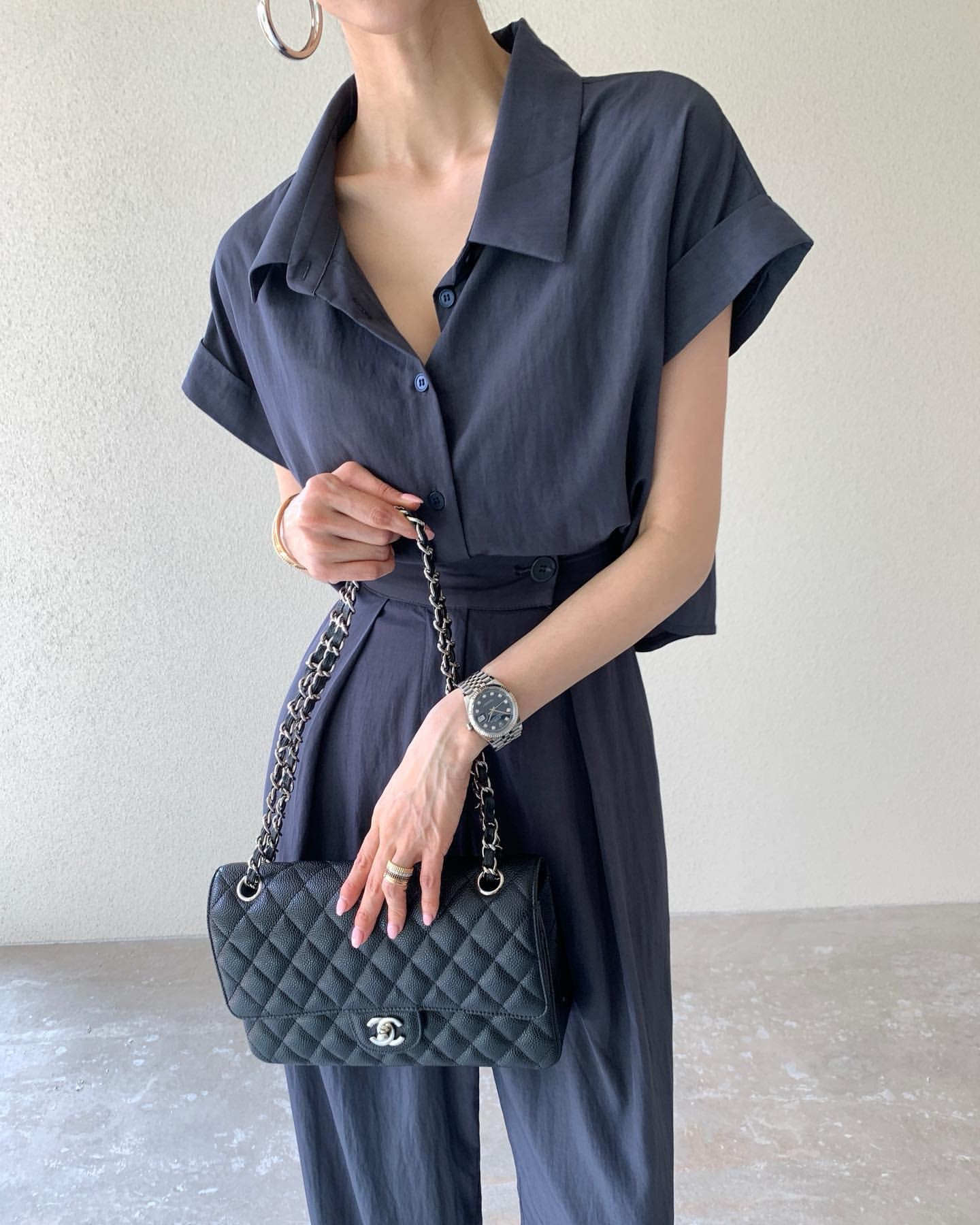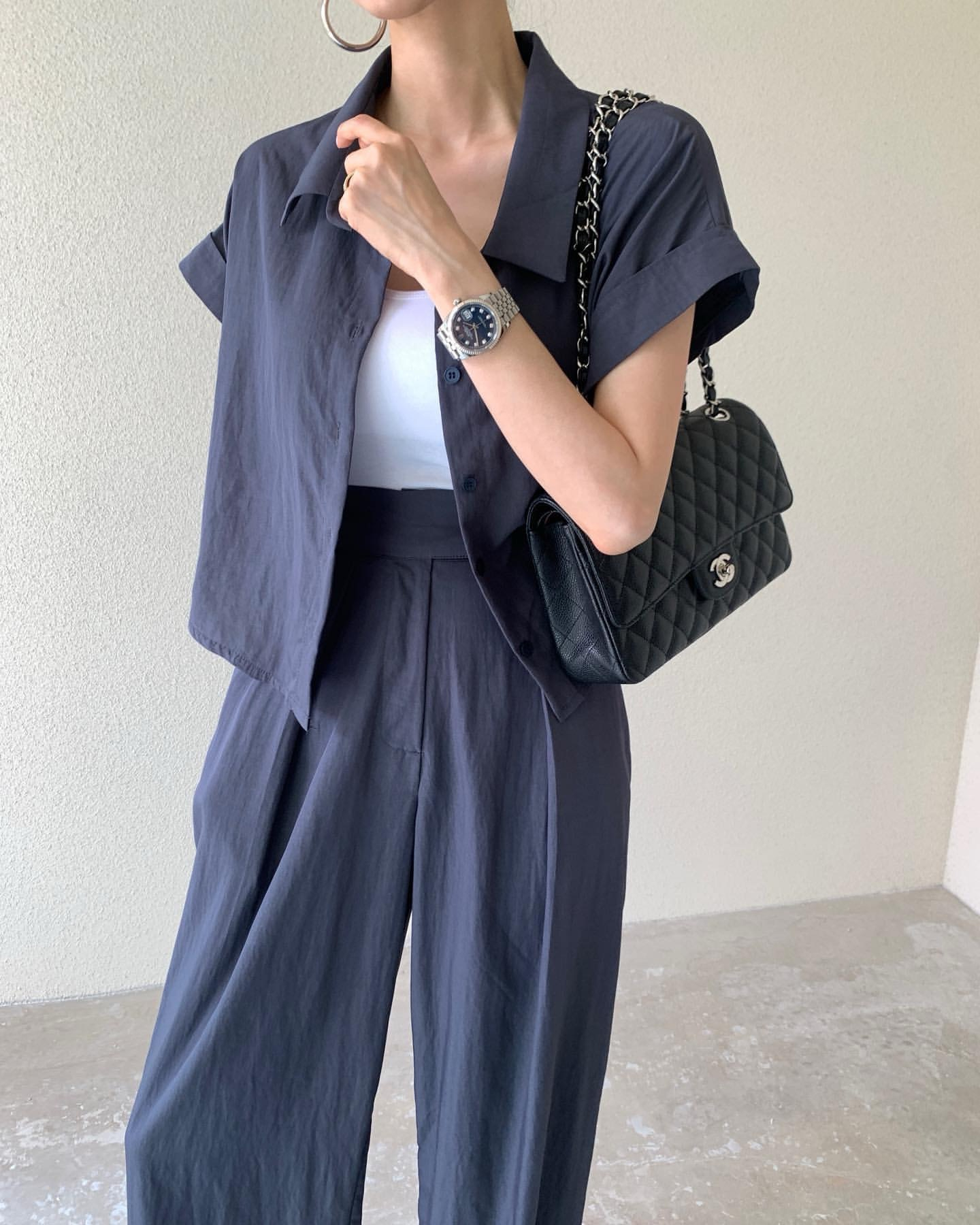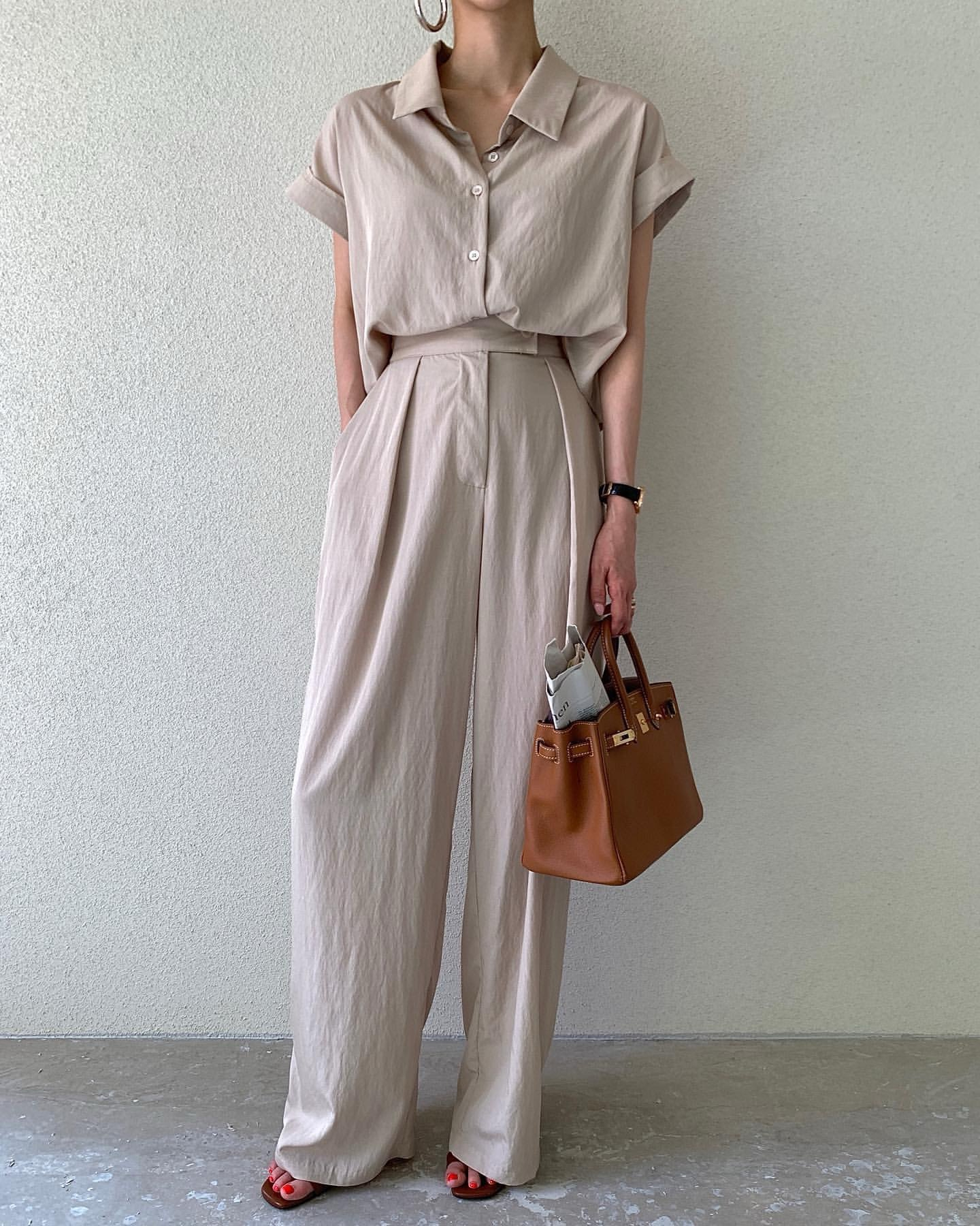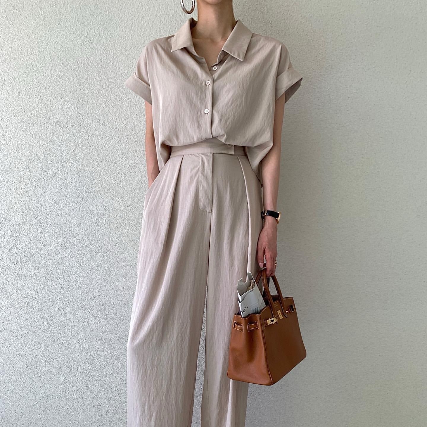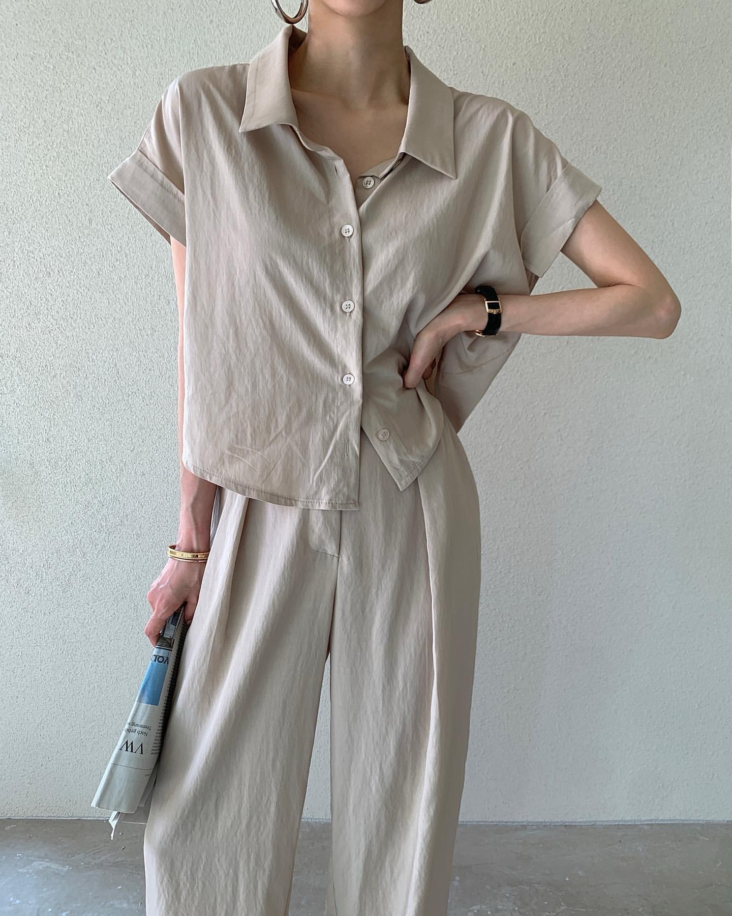 한국 chic 여름 이후 트임 스트랩 반팔 티셔츠 맨위 펌프 로프 넓은 다리가 짧다. 바지 투피스 세트