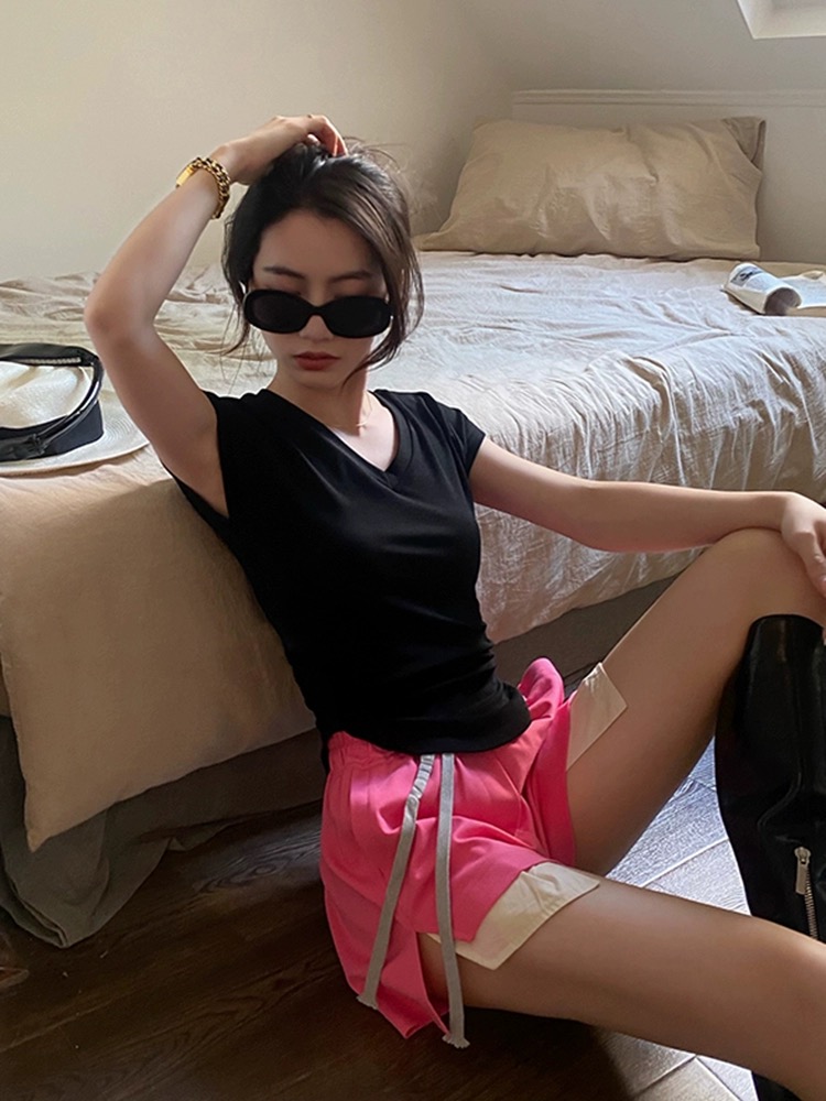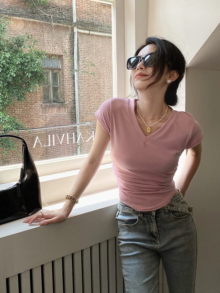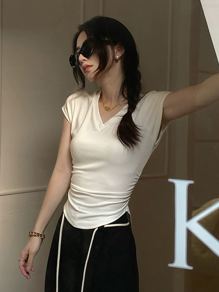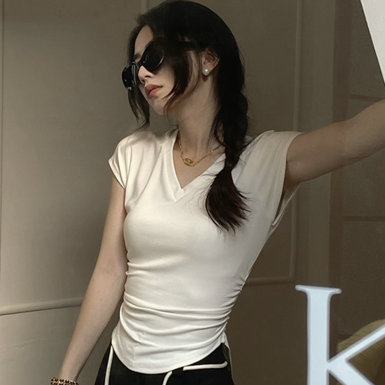 순수한 욕망 V넥 핫픽스 반팔 티셔츠 여성 여름 2026 새로운 핫걸 몸매 가꾸기 슬림해 보이는 주름 허리 수축 쇼트 스타일 맨위