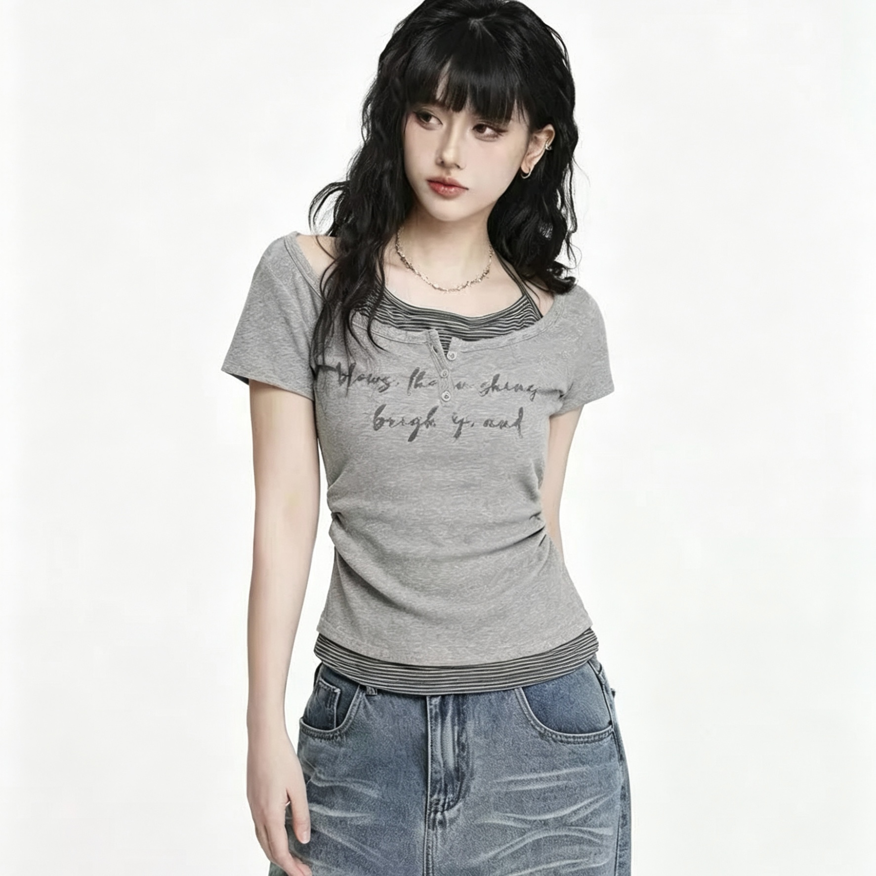 아메리칸 차가운 매운맛 반팔 티셔츠 여성 여름 2026 새로운 디자인 센스 불규칙 몸매 가꾸기 슬림해 보이는 비스듬한 어깨 의류