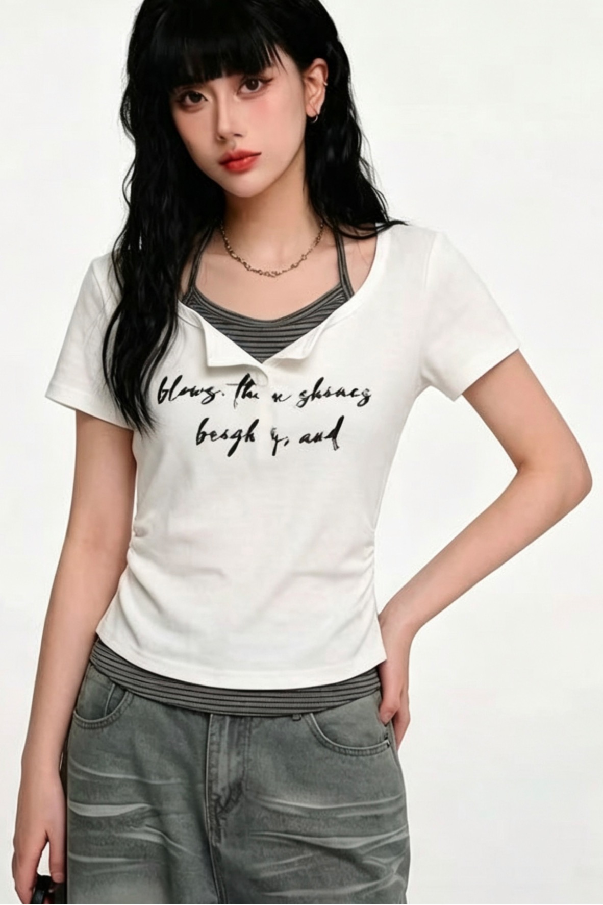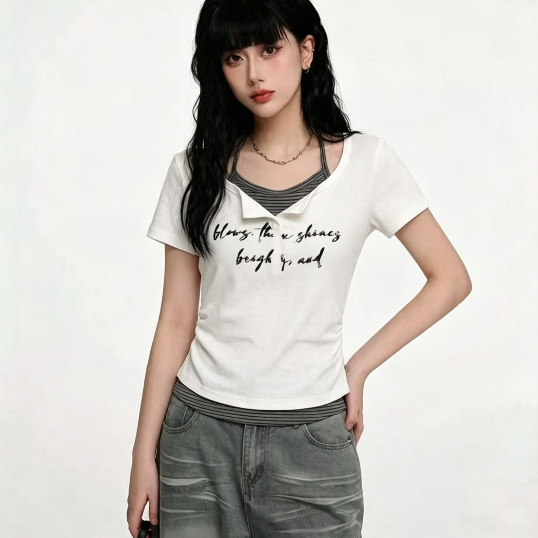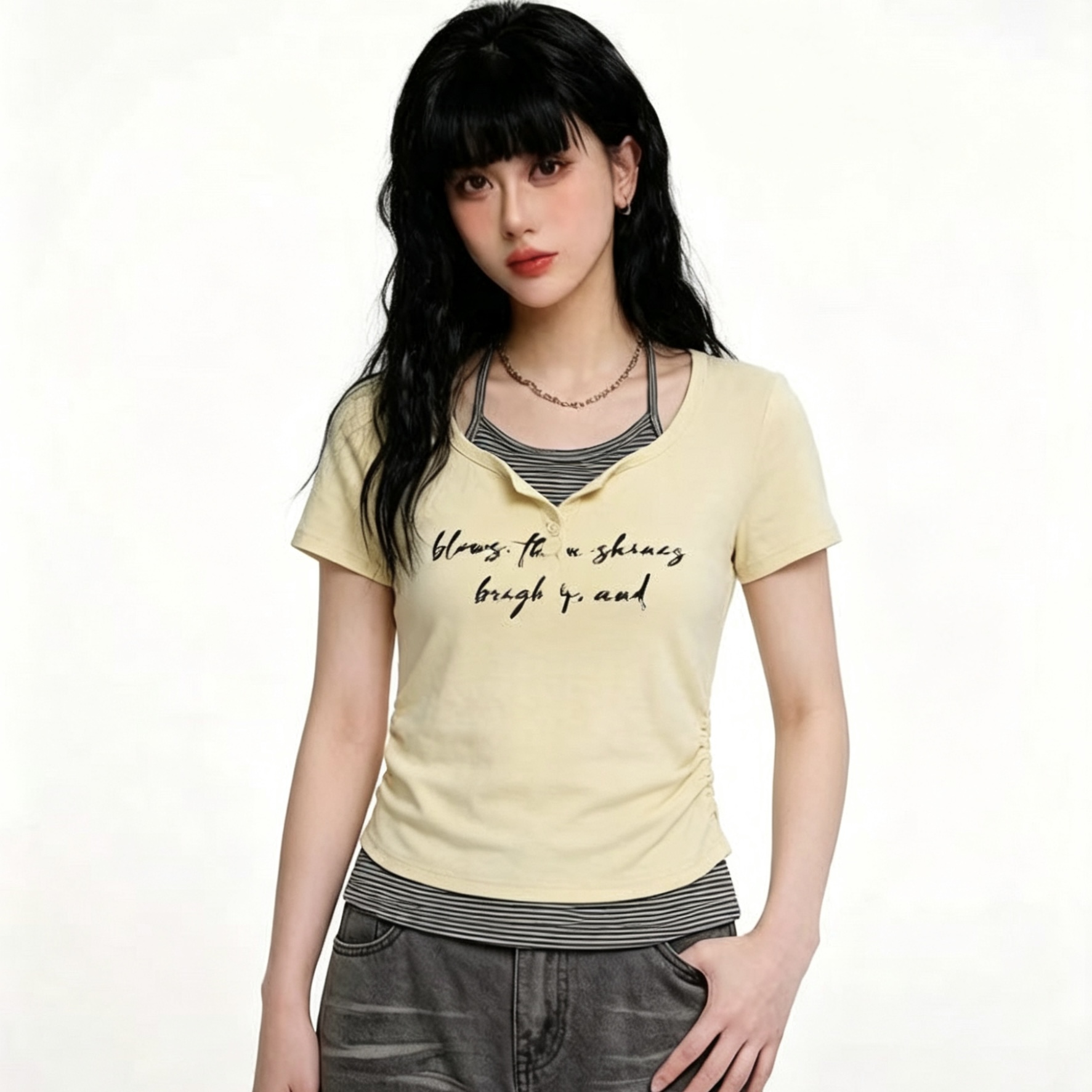순수한 욕망 V넥 핫픽스 반팔 티셔츠 여성 여름 2026 새로운 핫걸 몸매 가꾸기 슬림해 보이는 주름 허리 수축 쇼트 스타일 맨위