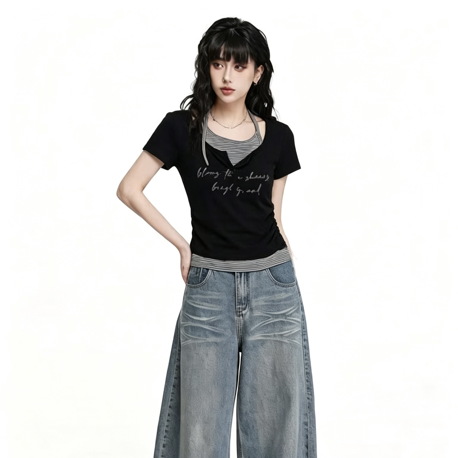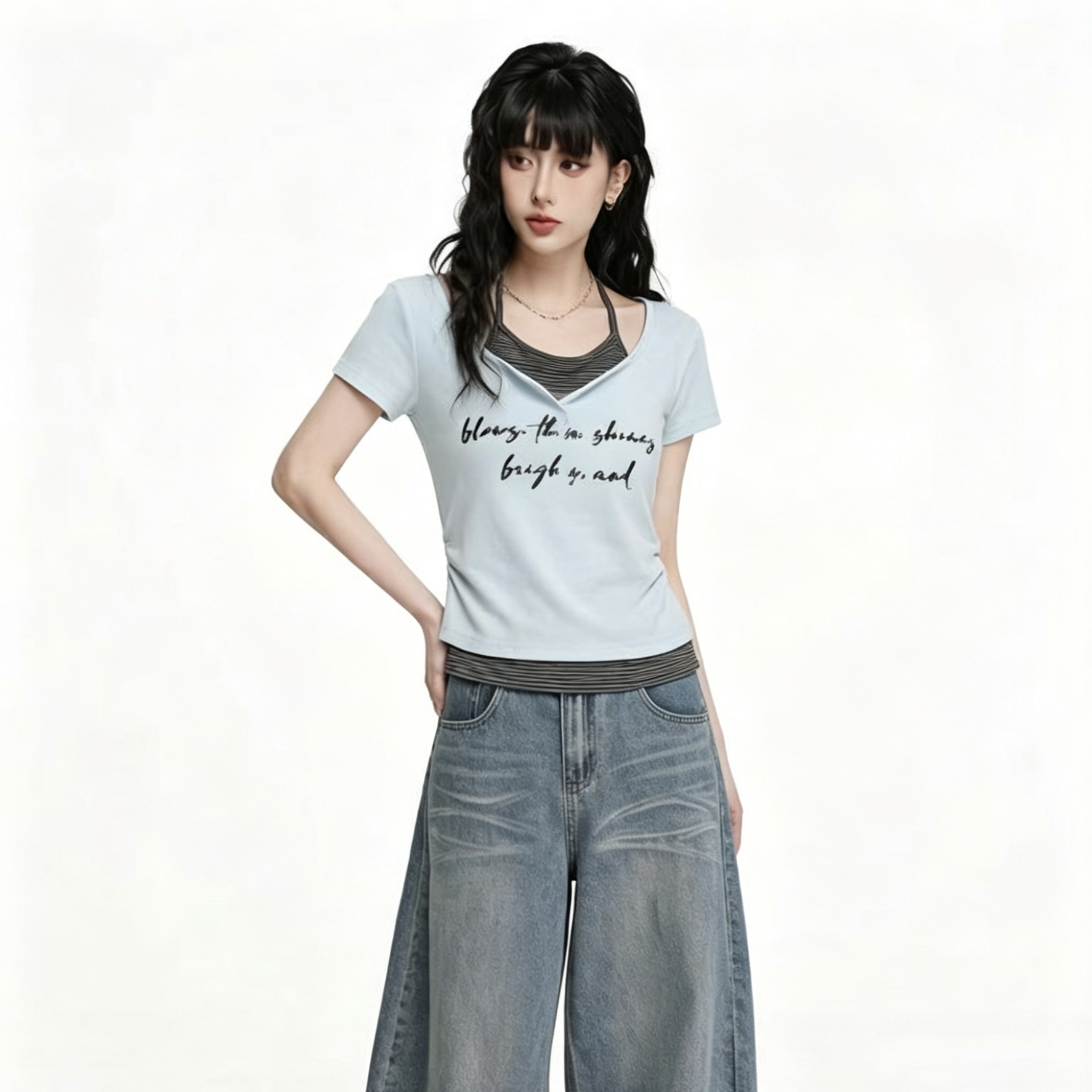 V넥 긍정적 인 어깨 티셔츠 반팔 여성 여름 순면 곡선 밑단 디자인 센스 몸매 가꾸기 불규칙 허리 수축 쇼트 스타일 맨위