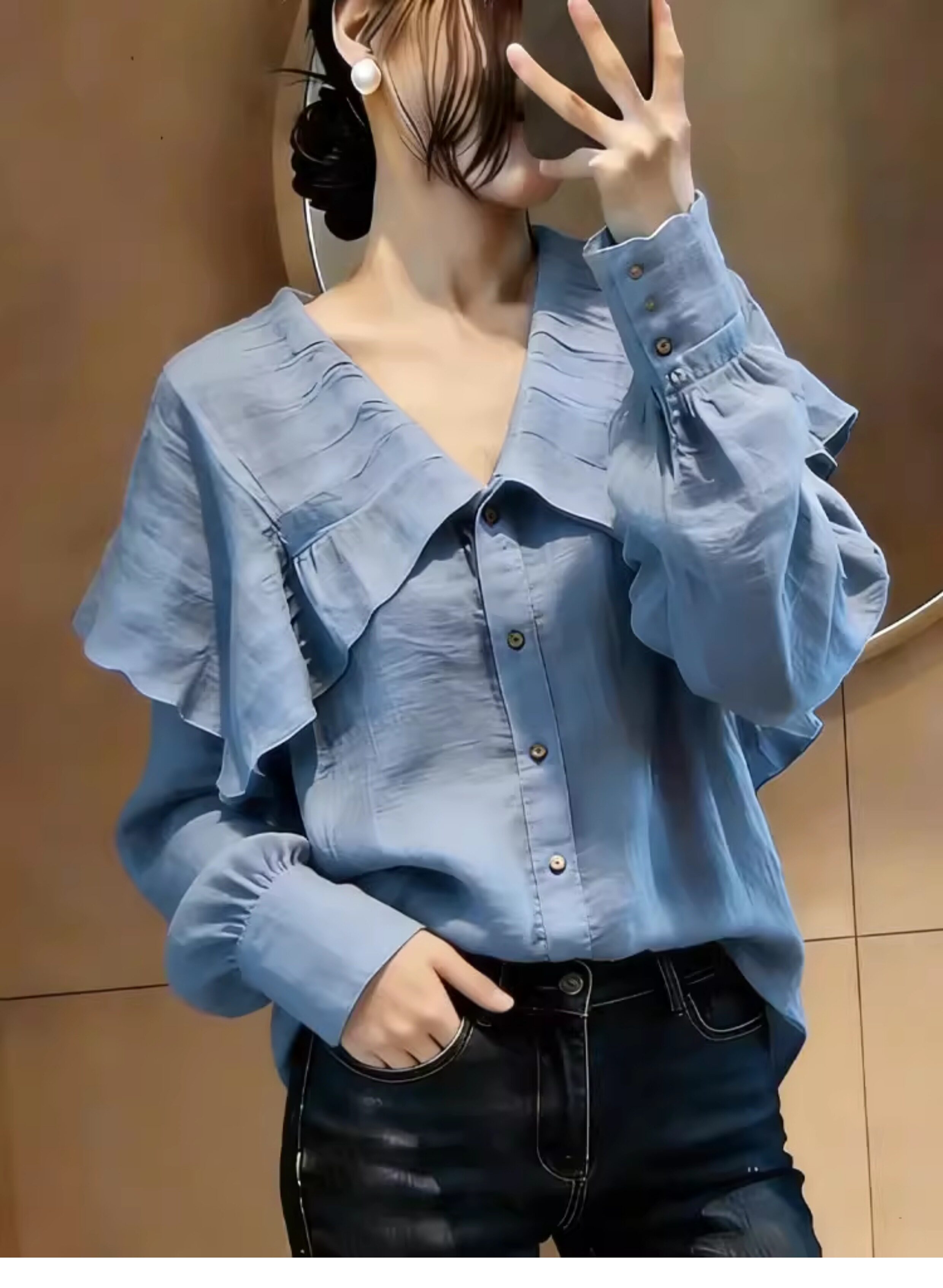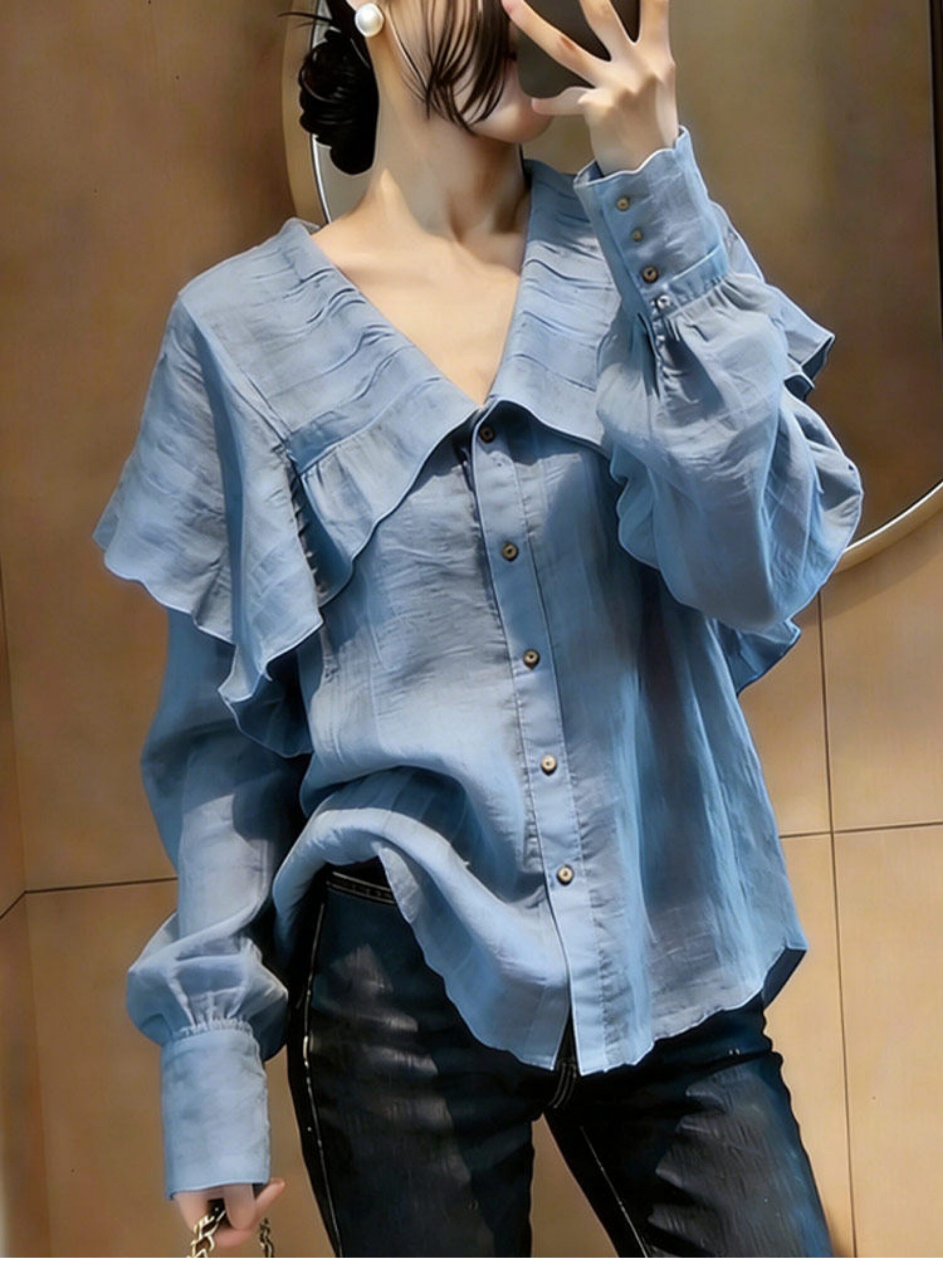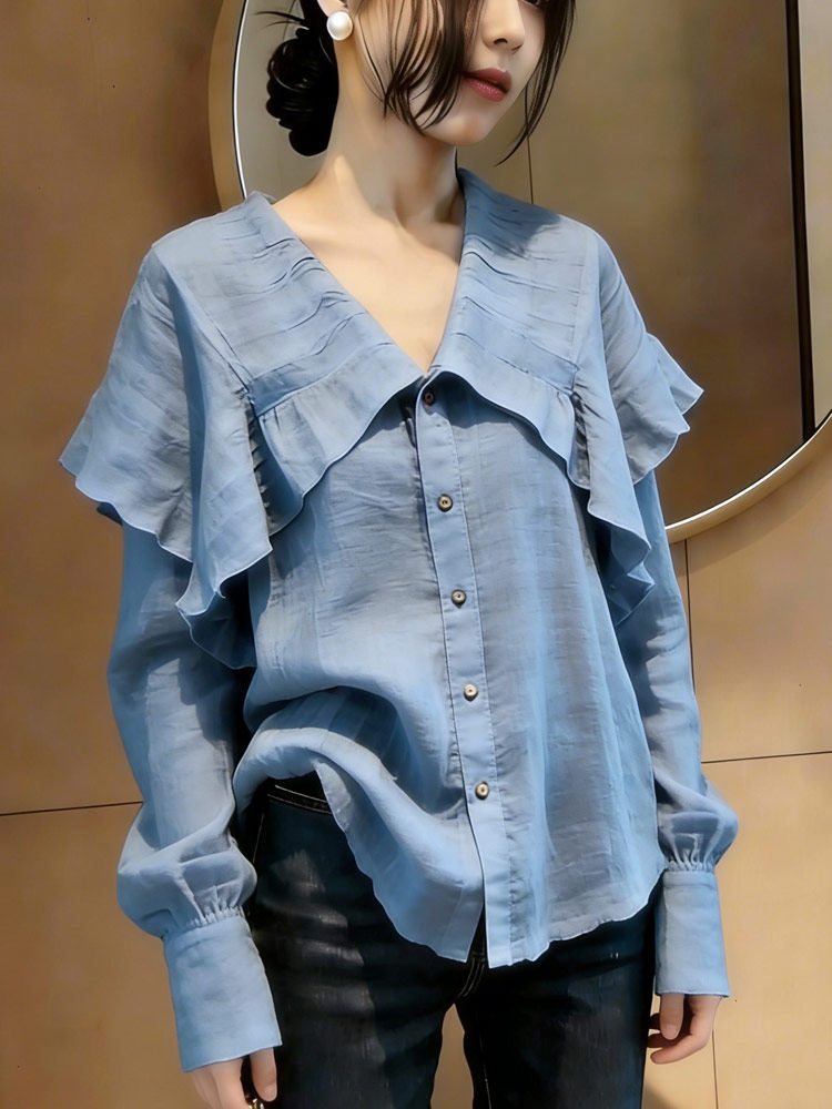 프랑스식 파란색 프릴 긴팔 셔츠 여성 2026 봄 여름 새로운 품격 고급 센스 다용도 외국 가스 맨위