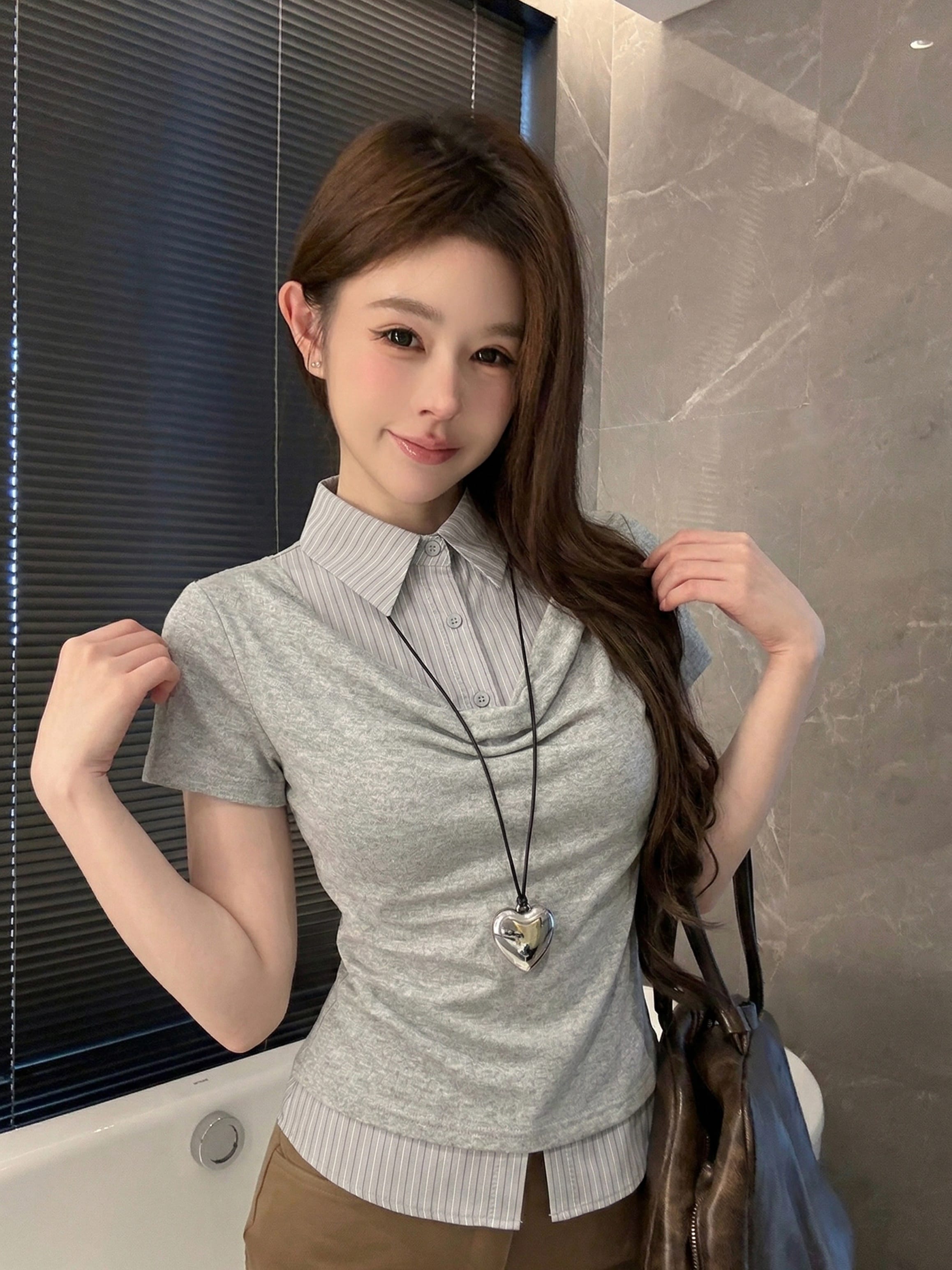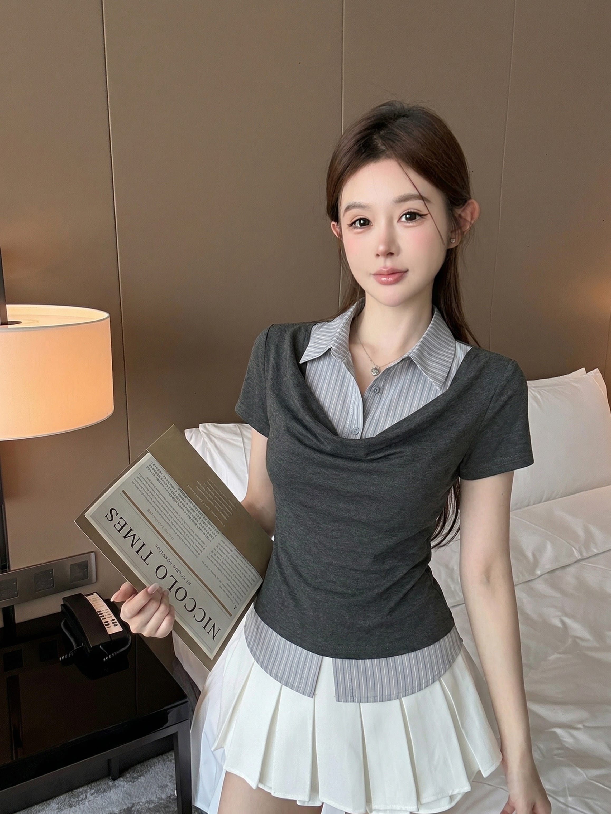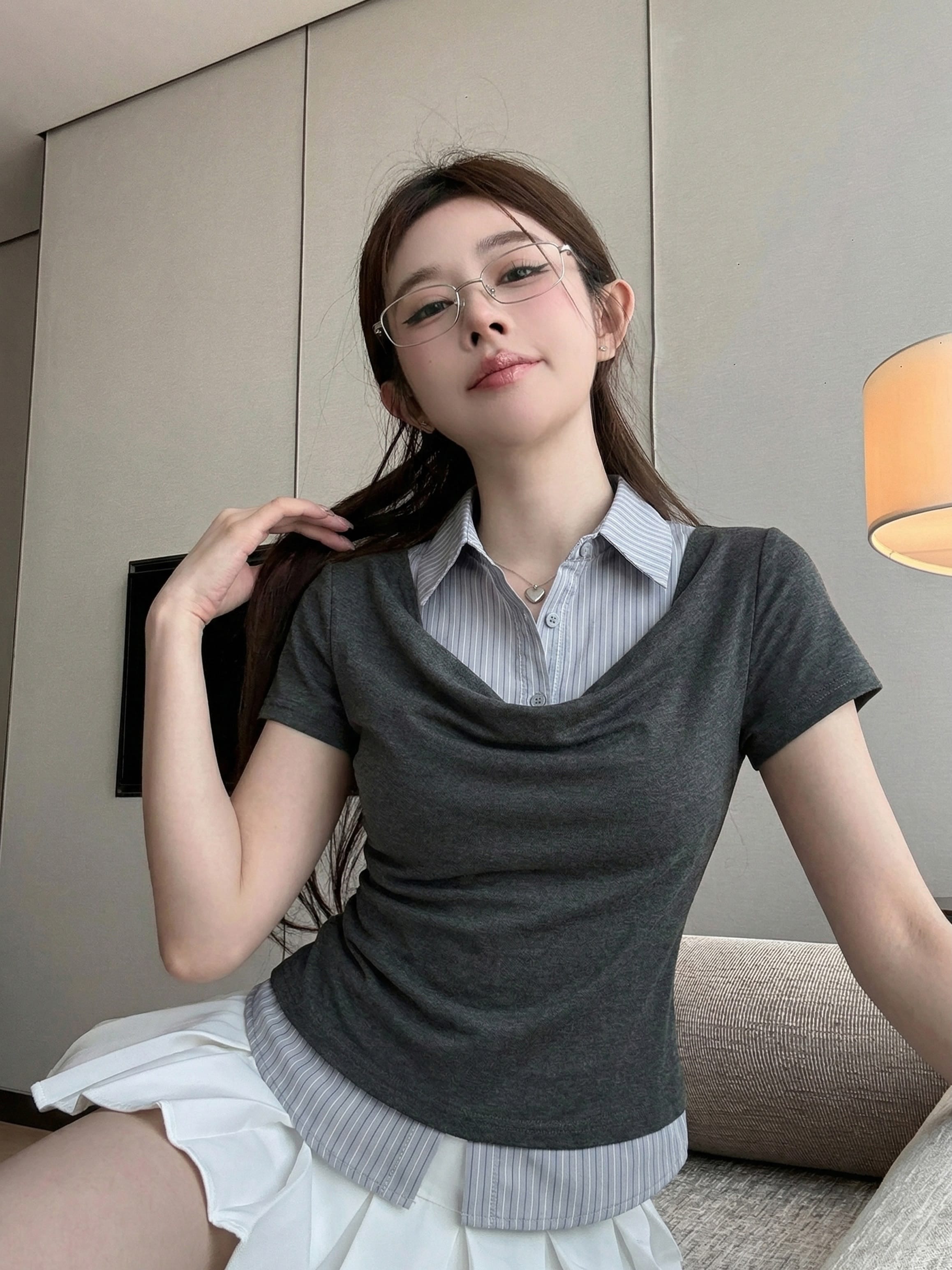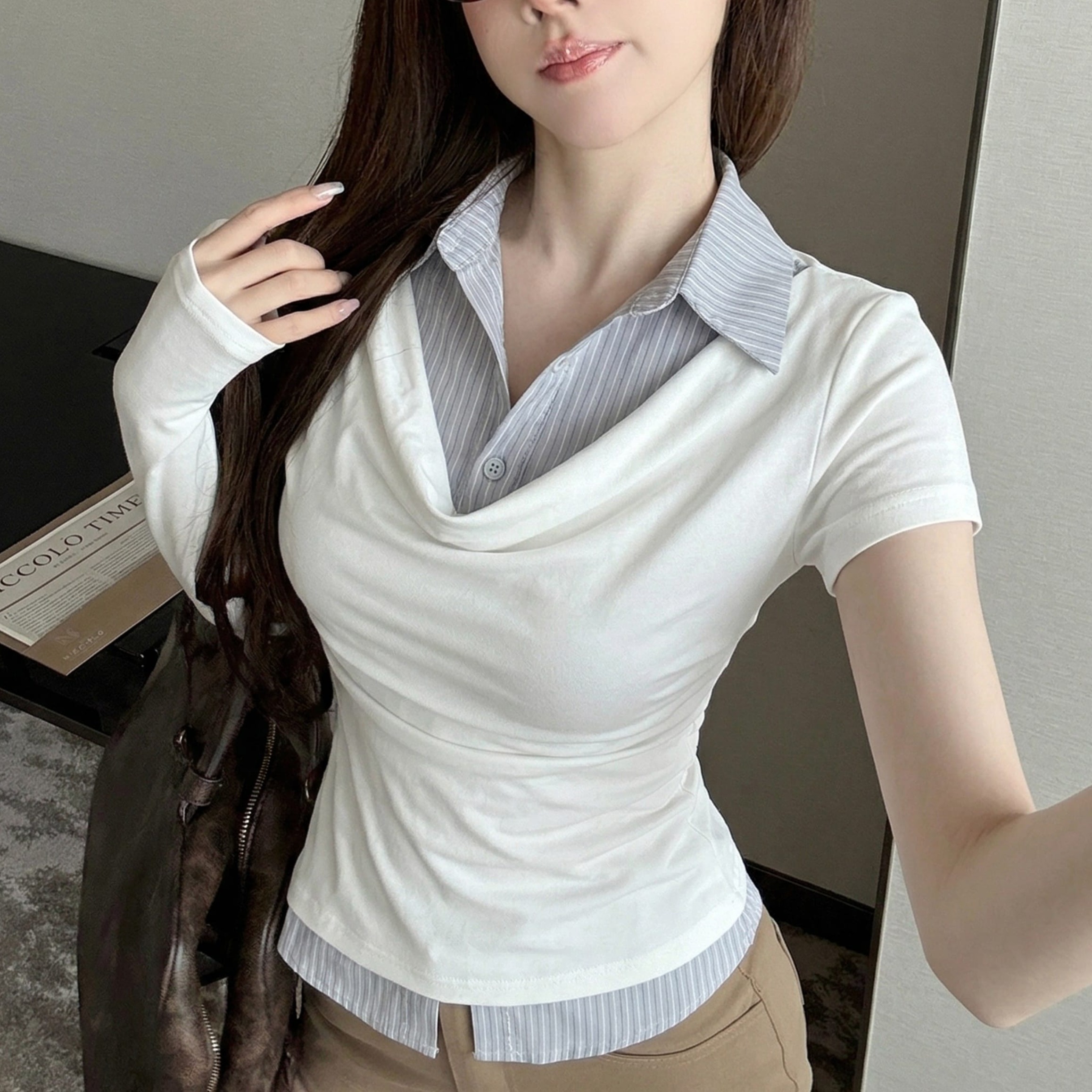 실사 정가 디자인 센스 찢어진 부분 어깨끈 페이크 레이어드 디자인 별 몸매 가꾸기 슬림해 보이는 쇼트 스타일 맨위