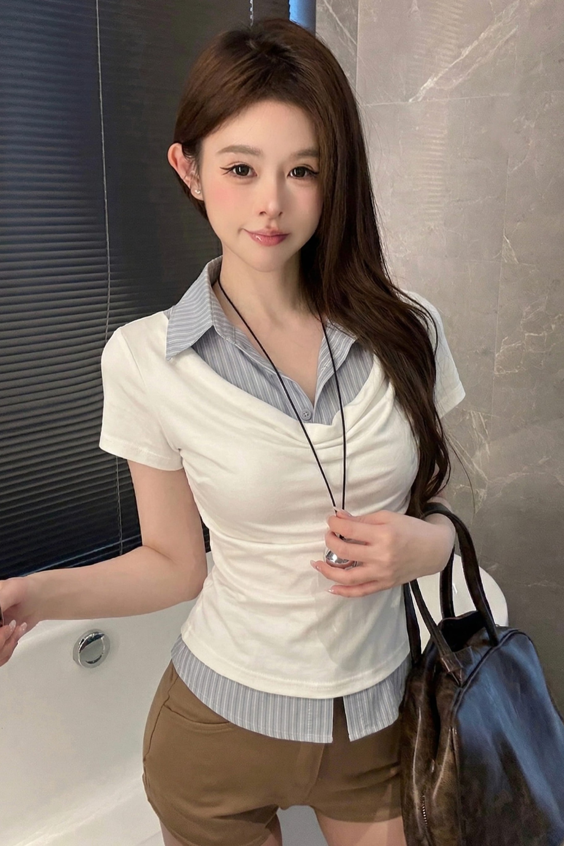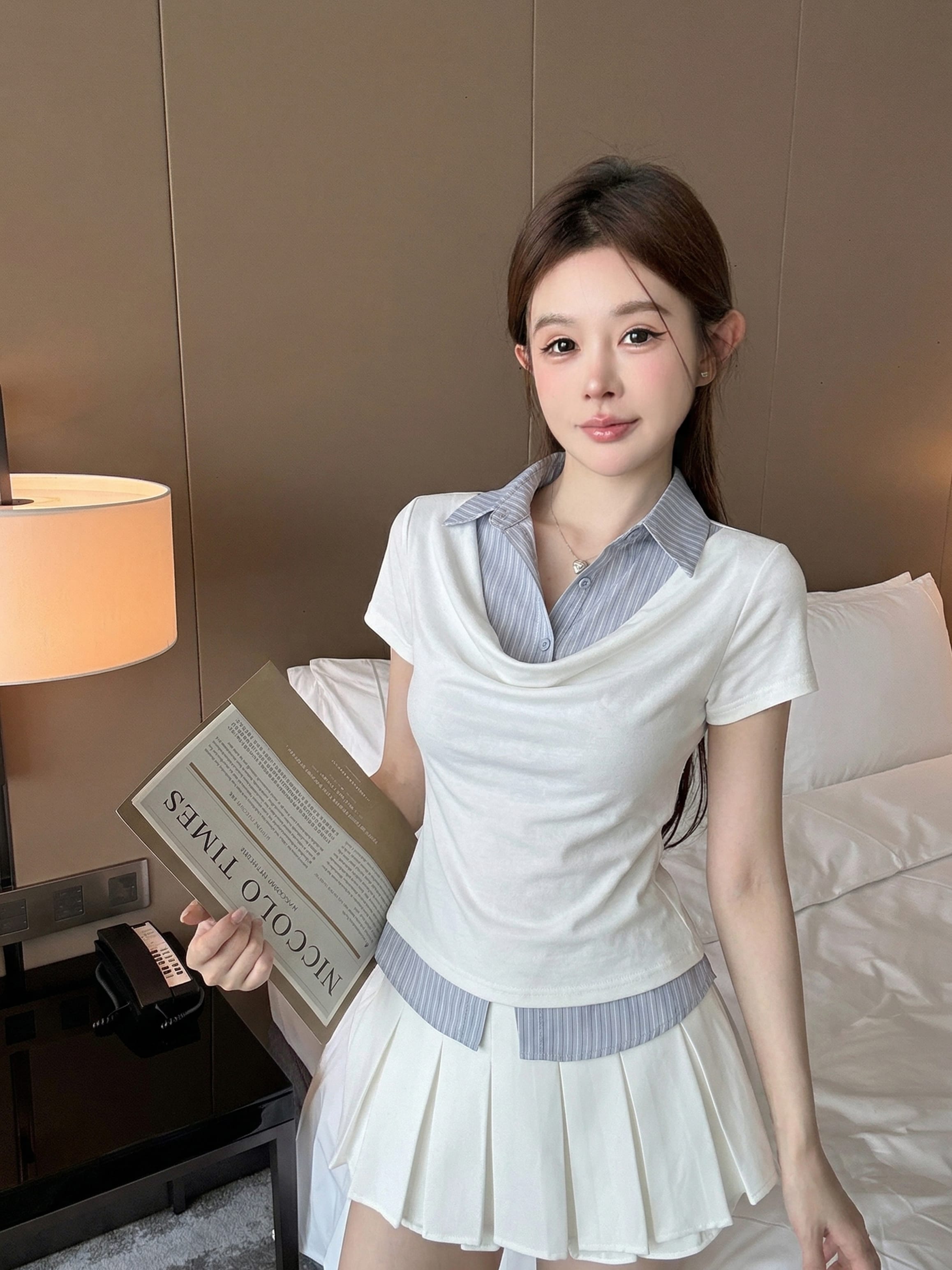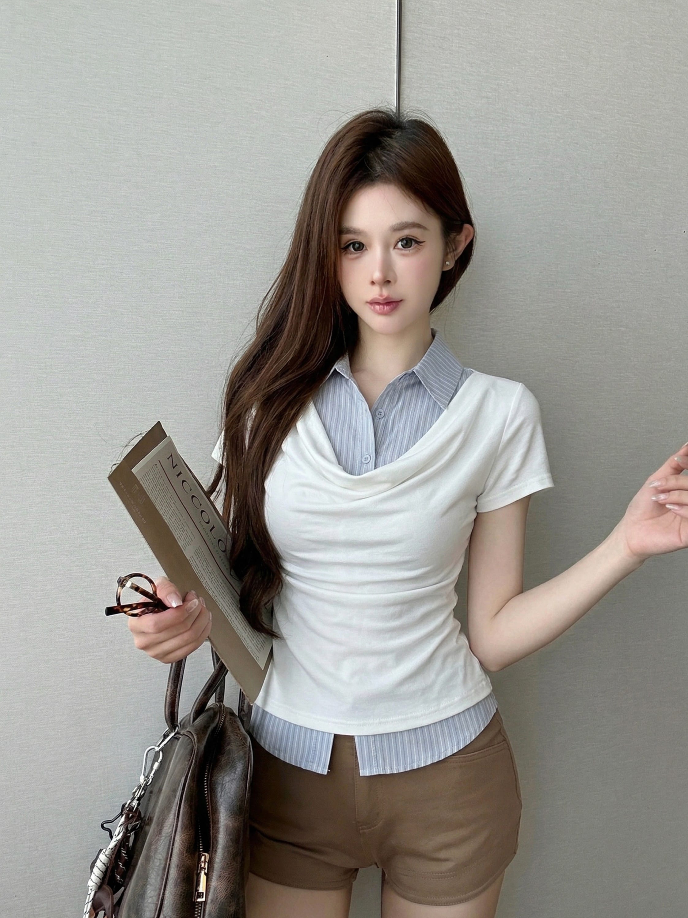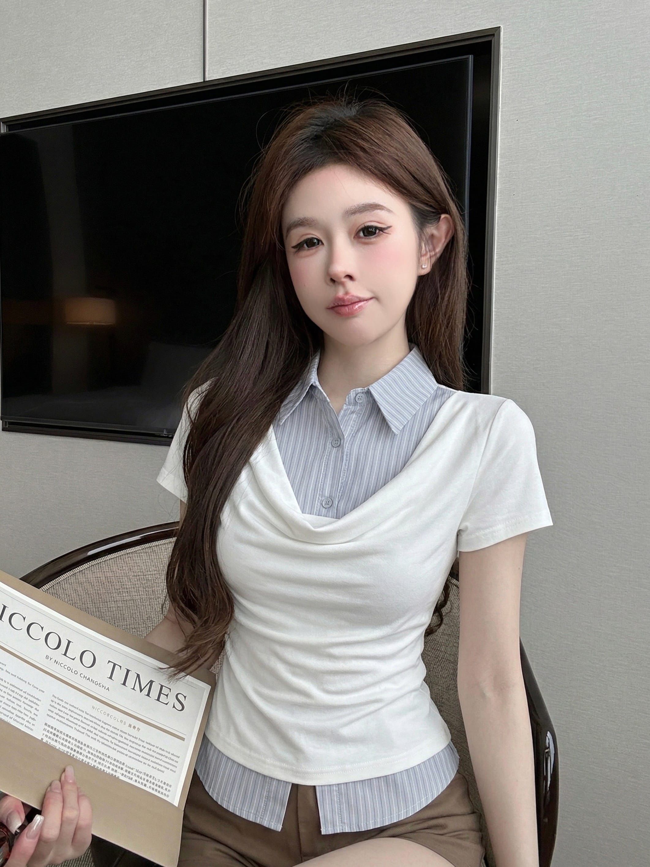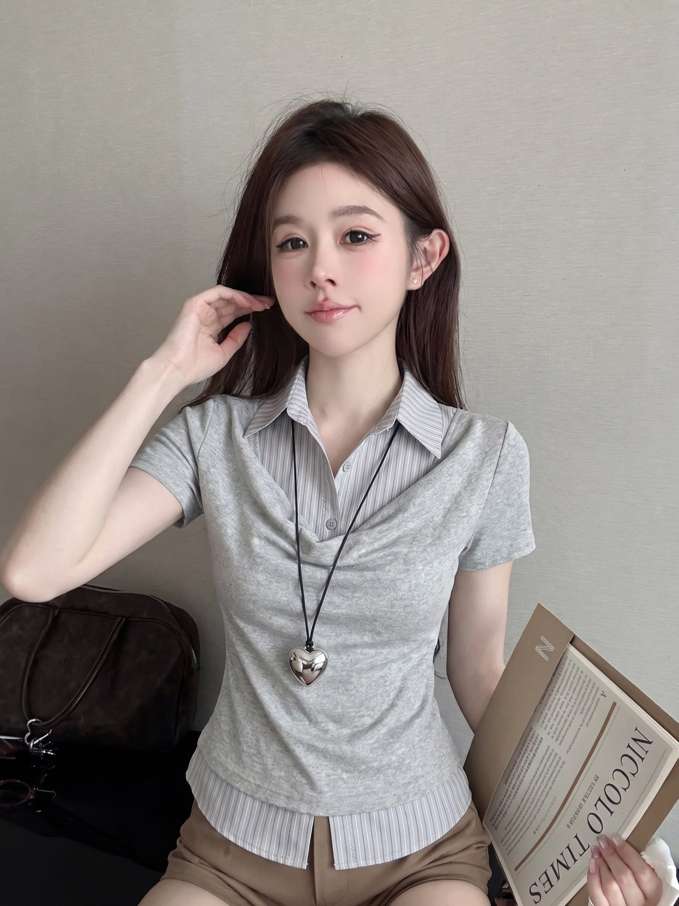 실사 정가 디자인 센스 찢어진 부분 어깨끈 페이크 레이어드 디자인 별 몸매 가꾸기 슬림해 보이는 쇼트 스타일 맨위