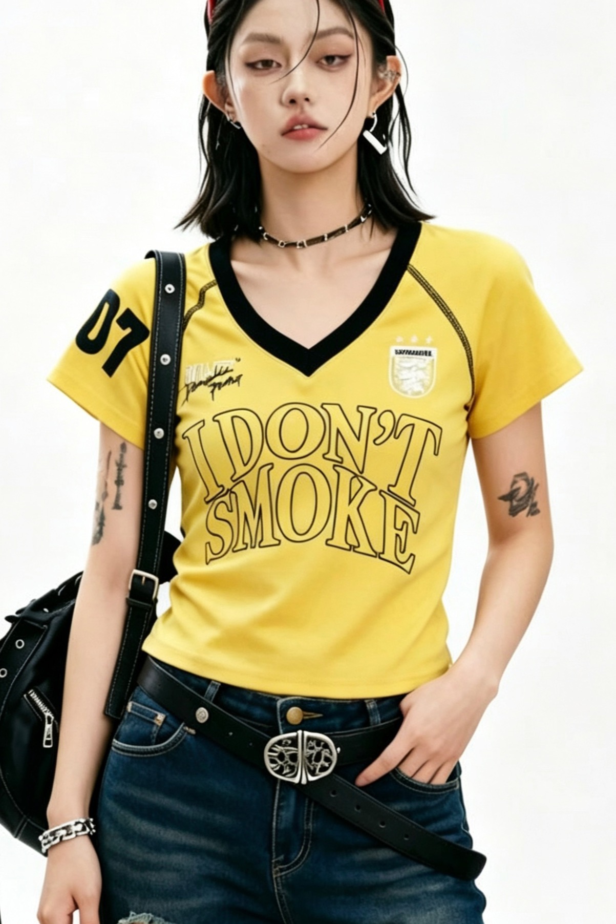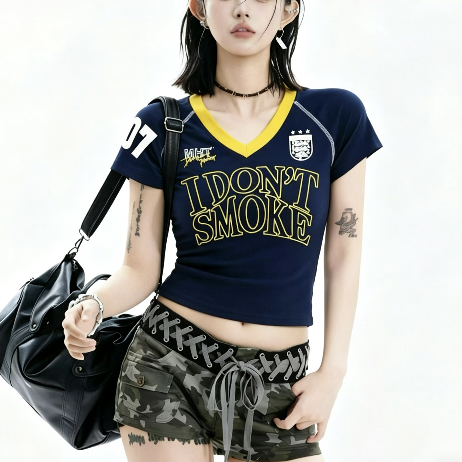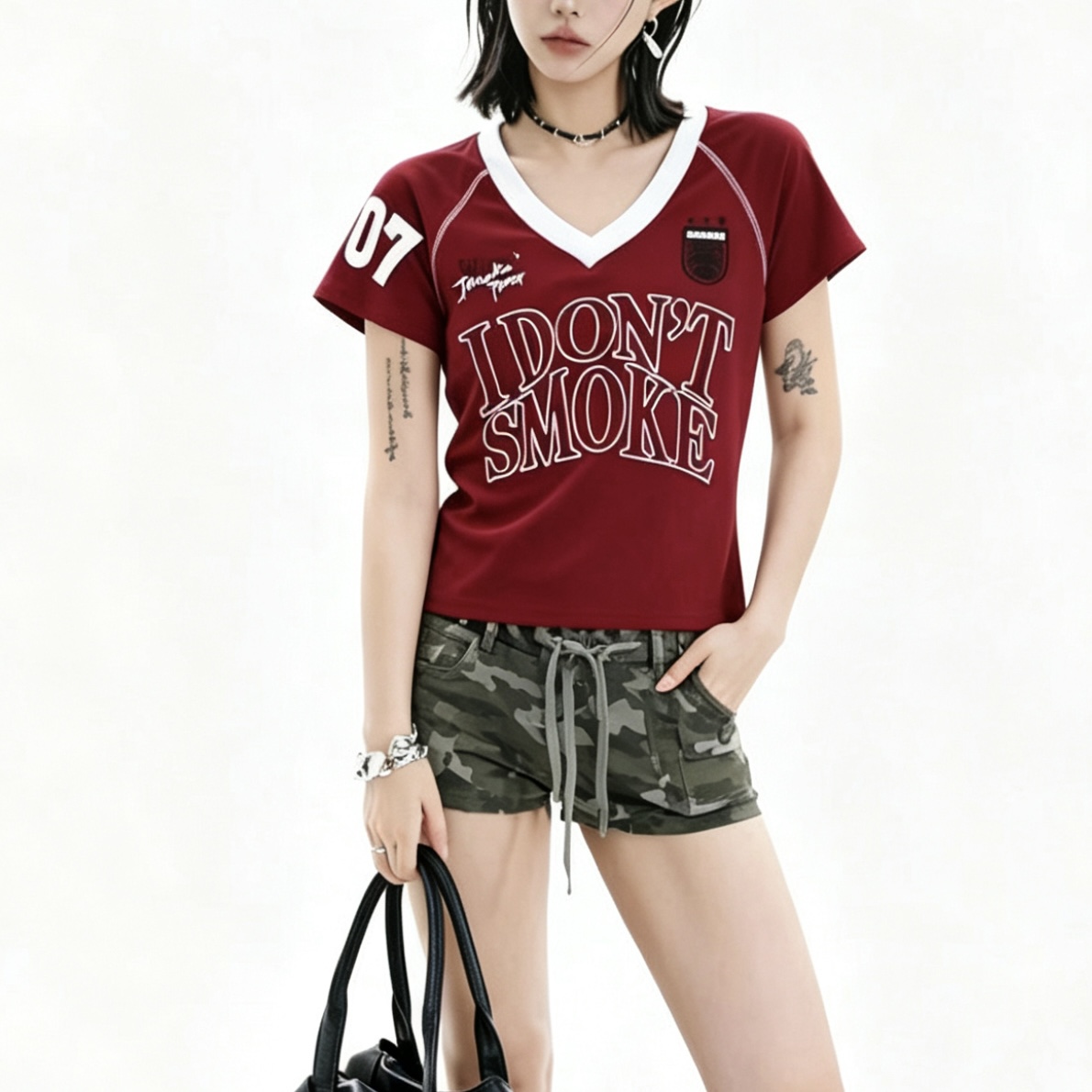 아메리칸 레트로 숫자 프린트 V넥 반팔 티셔츠 여성 여름 몸매 가꾸기 슬림해 보이는 긍정적 인 어깨 짧은 맨위