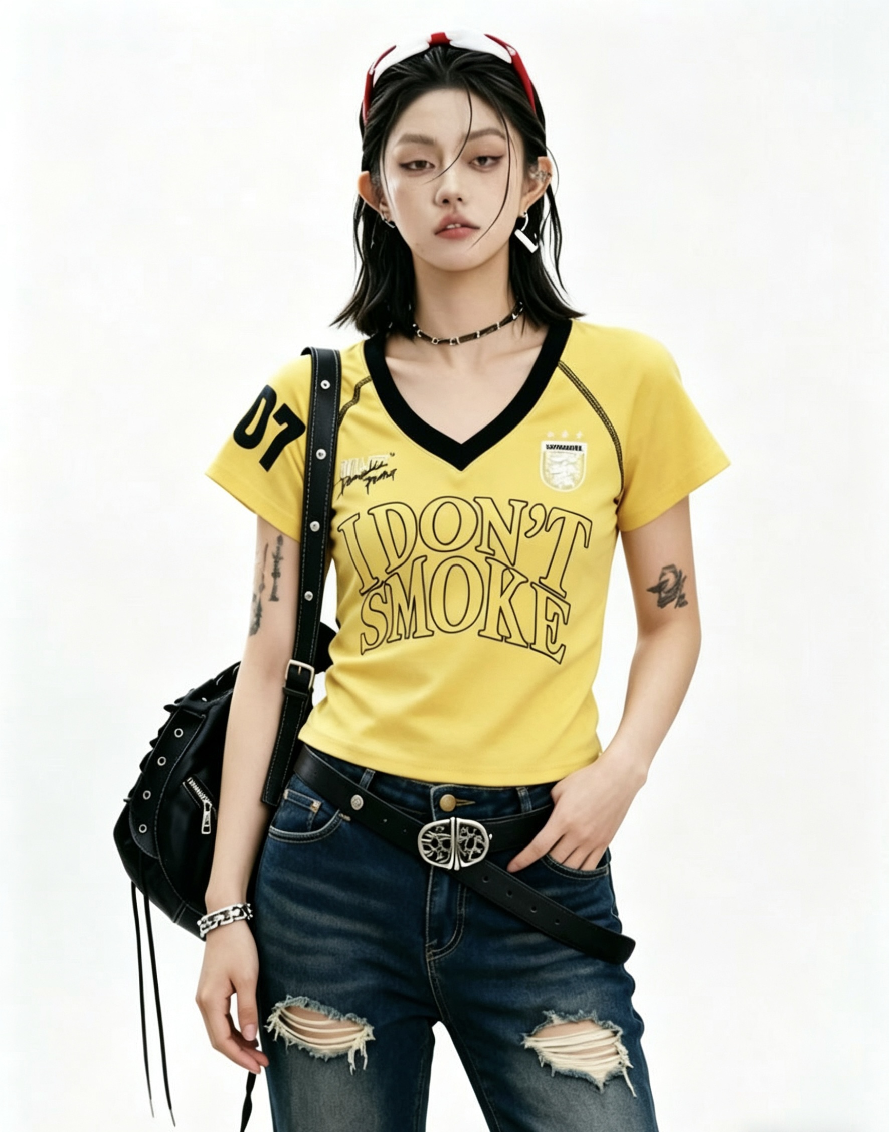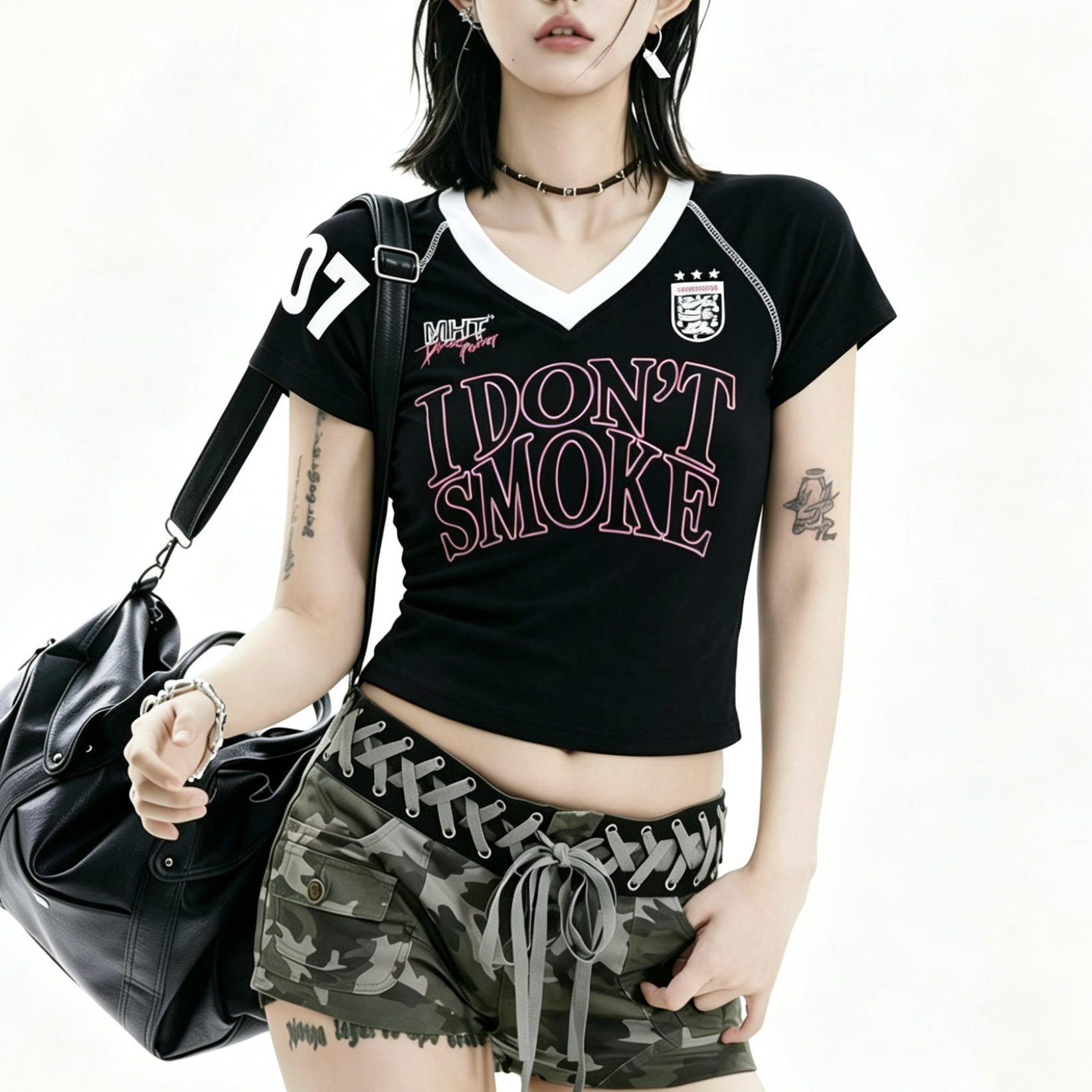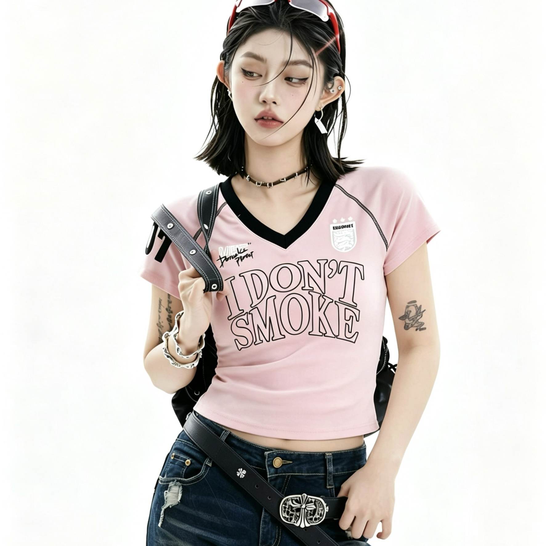 아메리칸 레트로 숫자 프린트 V넥 반팔 티셔츠 여성 여름 몸매 가꾸기 슬림해 보이는 긍정적 인 어깨 짧은 맨위