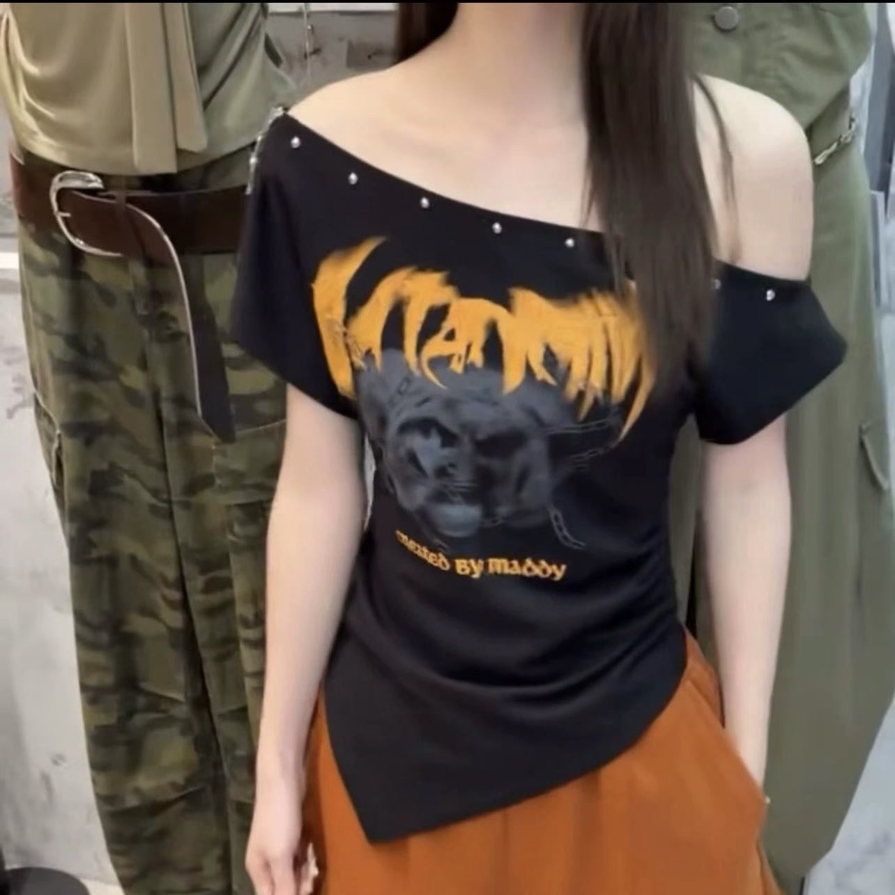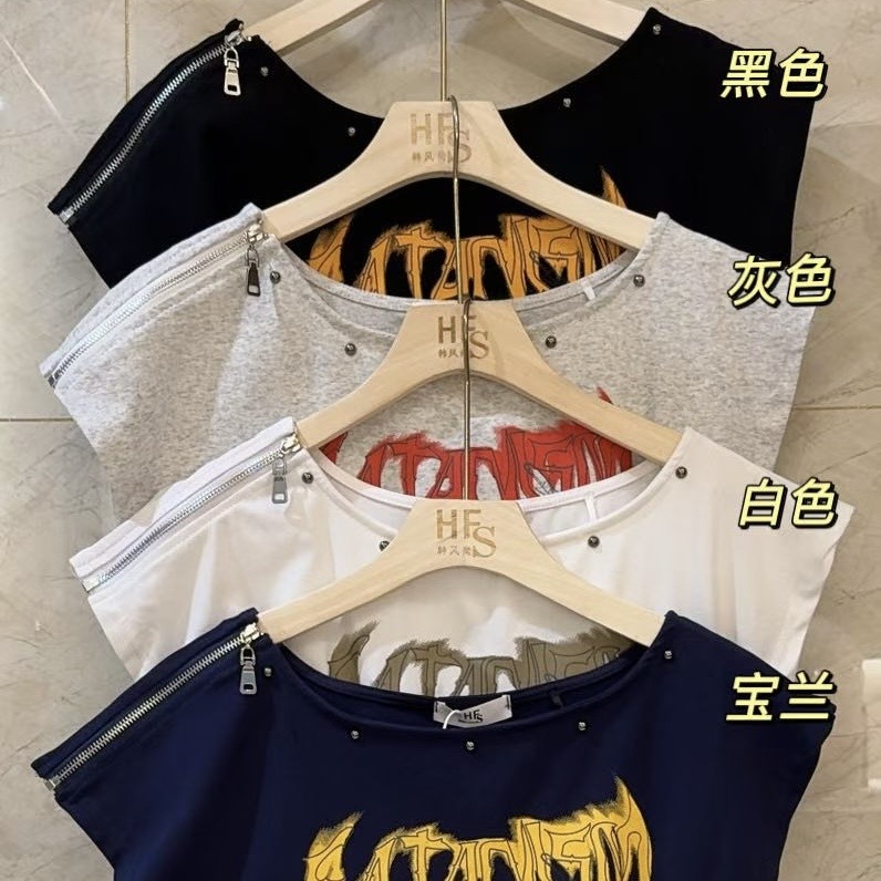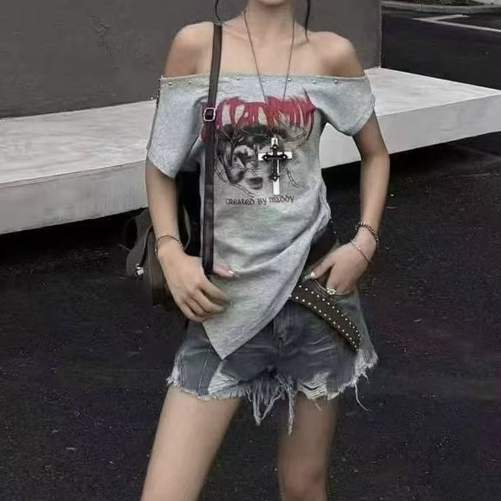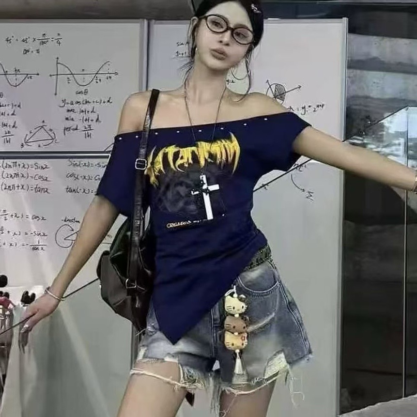 장 room 여름 핫걸 알파벳 프린트 비스듬한 어깨 반팔 티셔츠 여성 슬림해 보이는 보트넥 몸매 가꾸기 쇼트 스타일 맨위