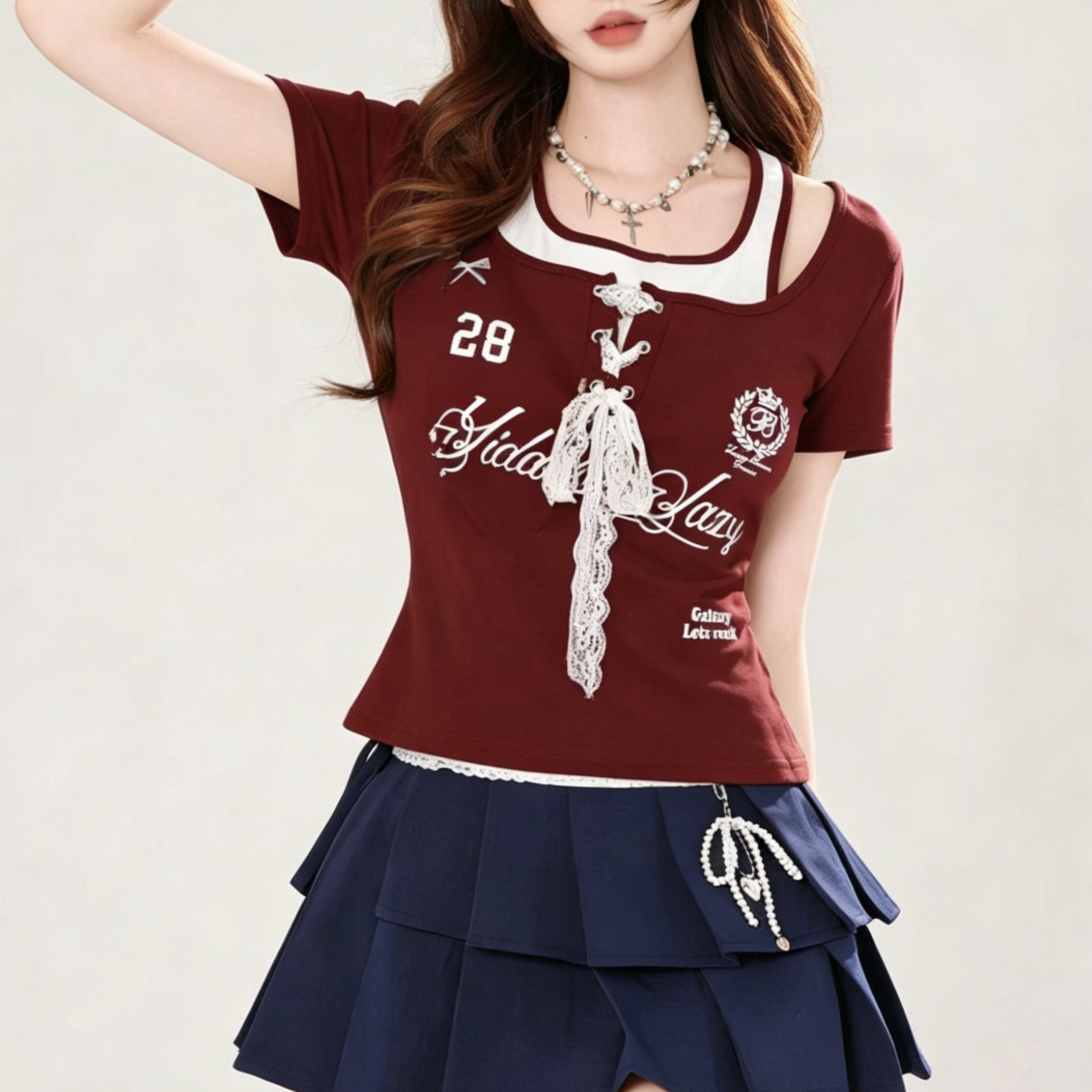 슈퍼 잘 생긴 반팔 티셔츠 여성 몸매 가꾸기 행침 목 페이크 레이어드 맨위 패션 외국 가스 일본식 바람 착용 가져 가라.