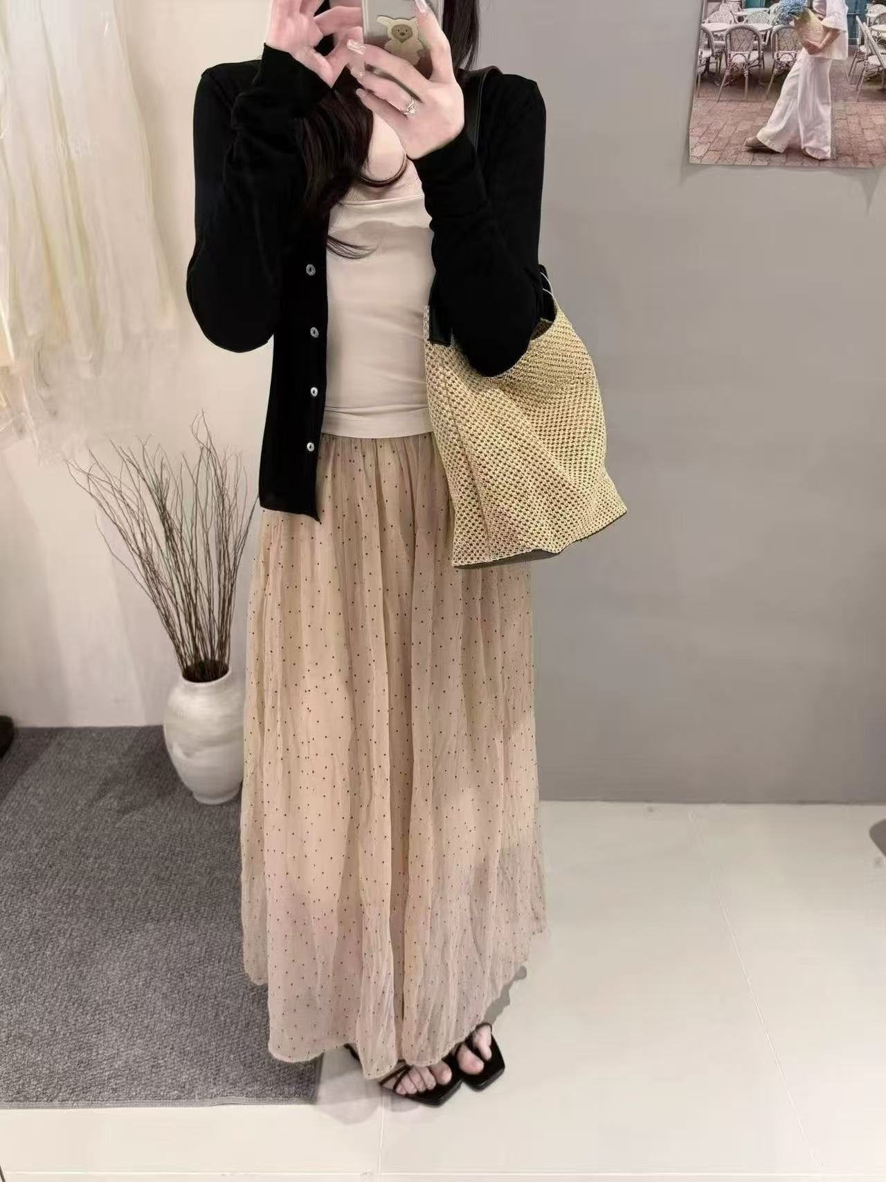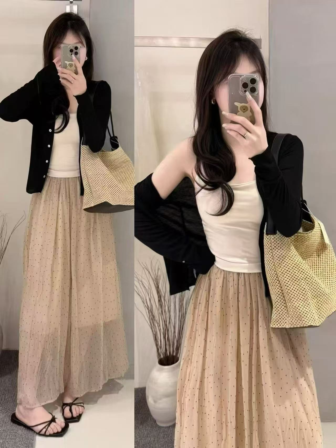 새로운 패션 젠 감기 센스 자외선 차단 오픈 가디건 슬립 허리밴드 반신 스커트 3종 세트