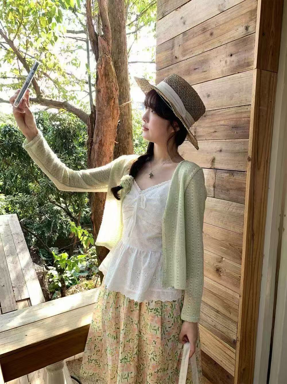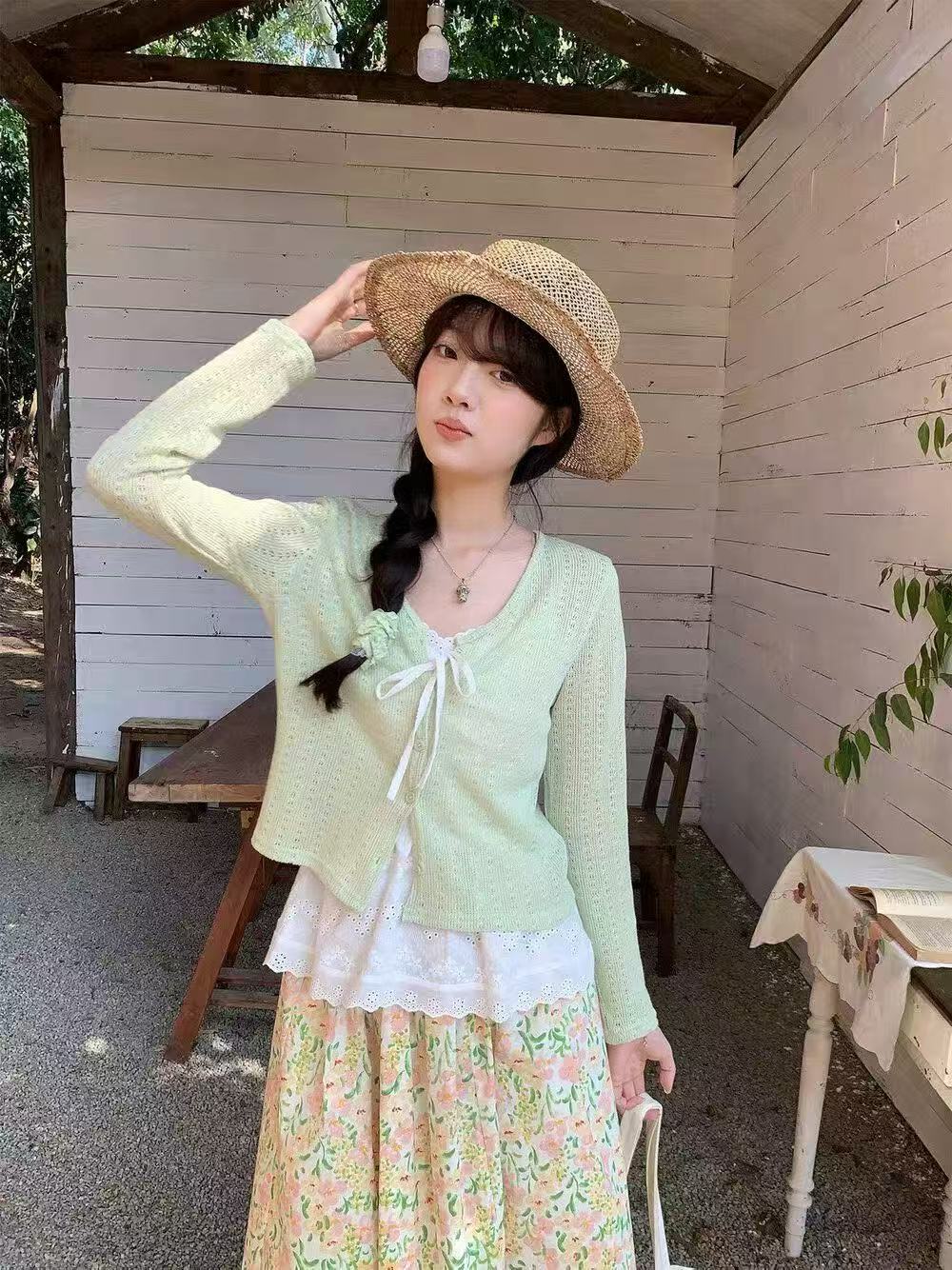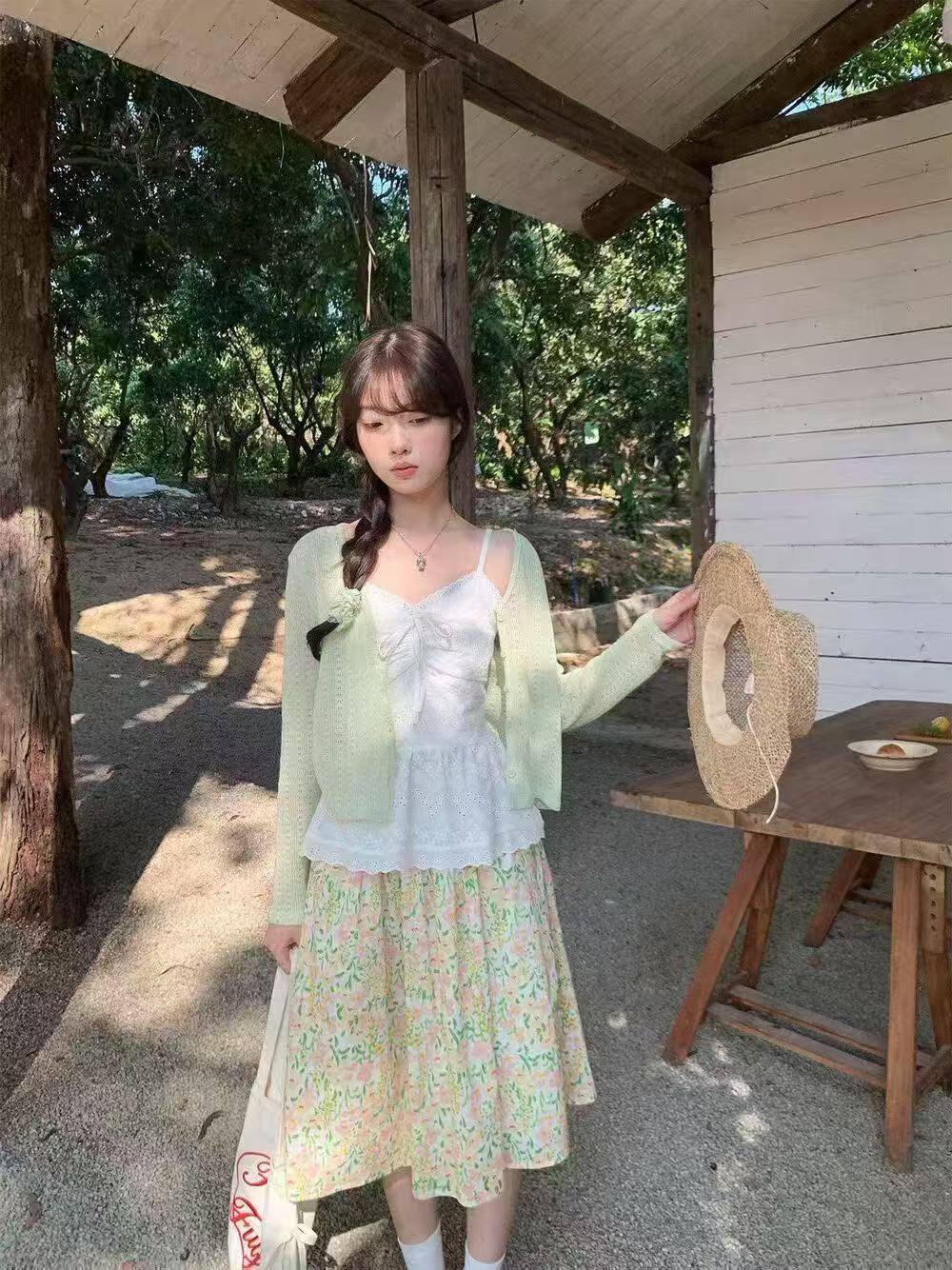새로운 패션 젠 감기 센스 자외선 차단 오픈 가디건 슬립 허리밴드 꽃무늬 반신 스커트 3종 세트