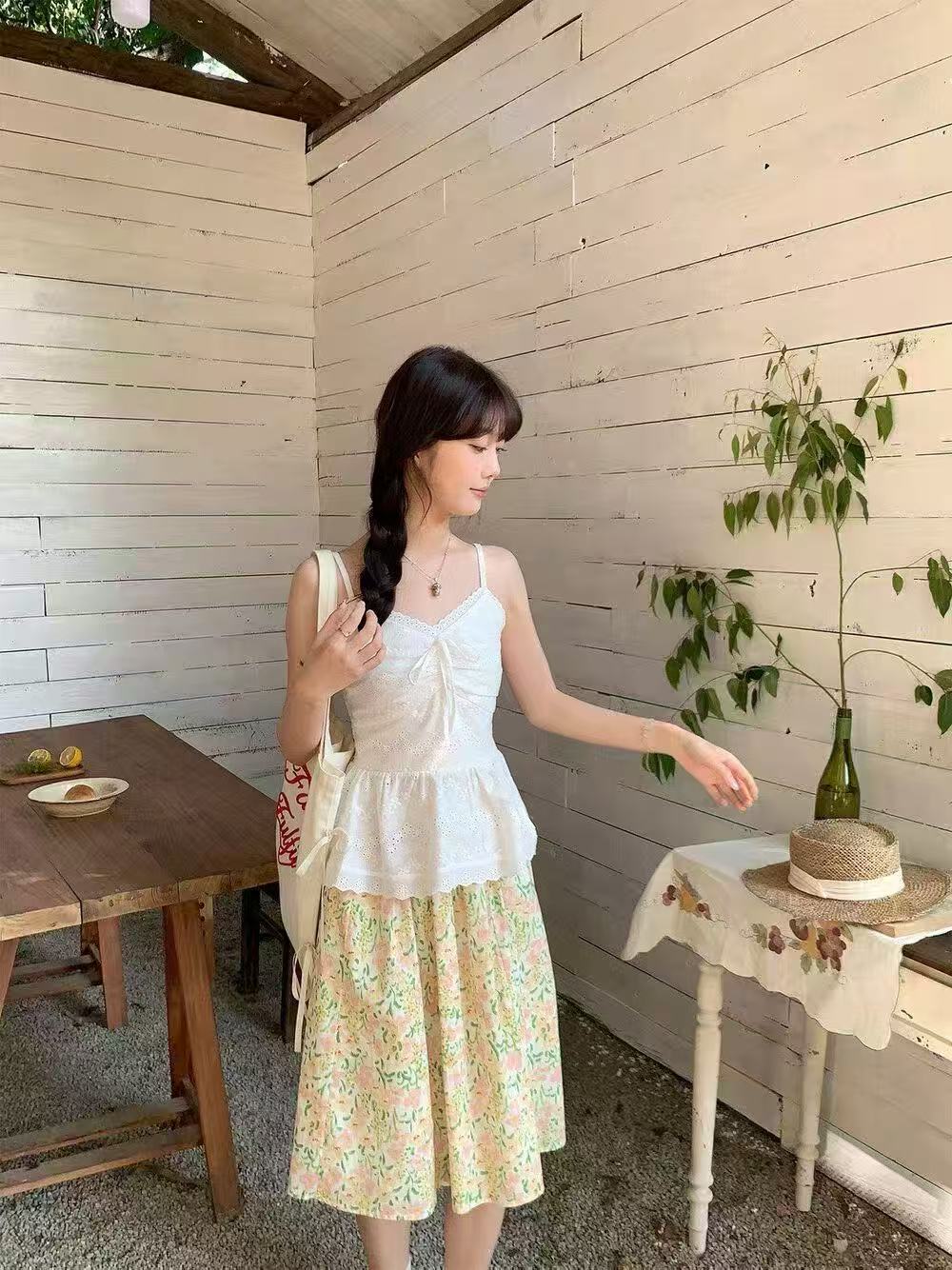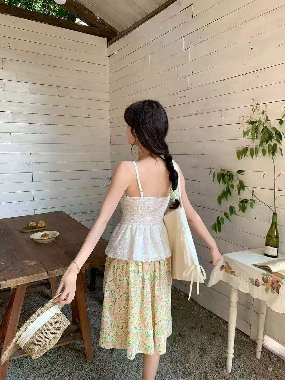 새로운 한국 스타일 패션 다용도 품격 자외선 차단 의류 달콤함 꽃무늬 불규칙 슬립 점프 슈트 치마 세트