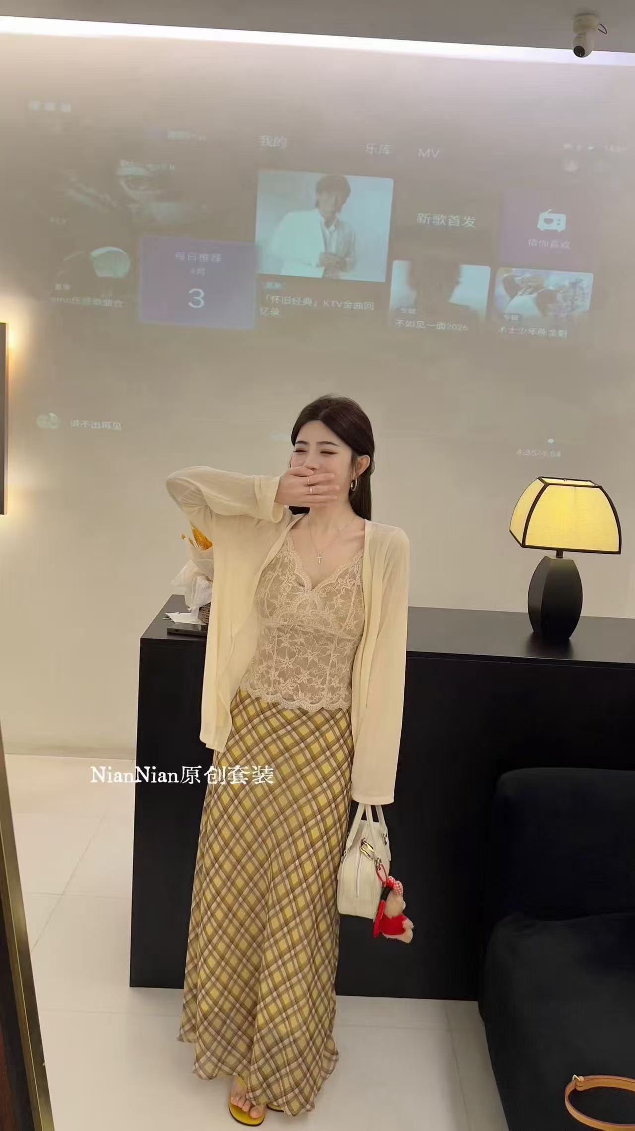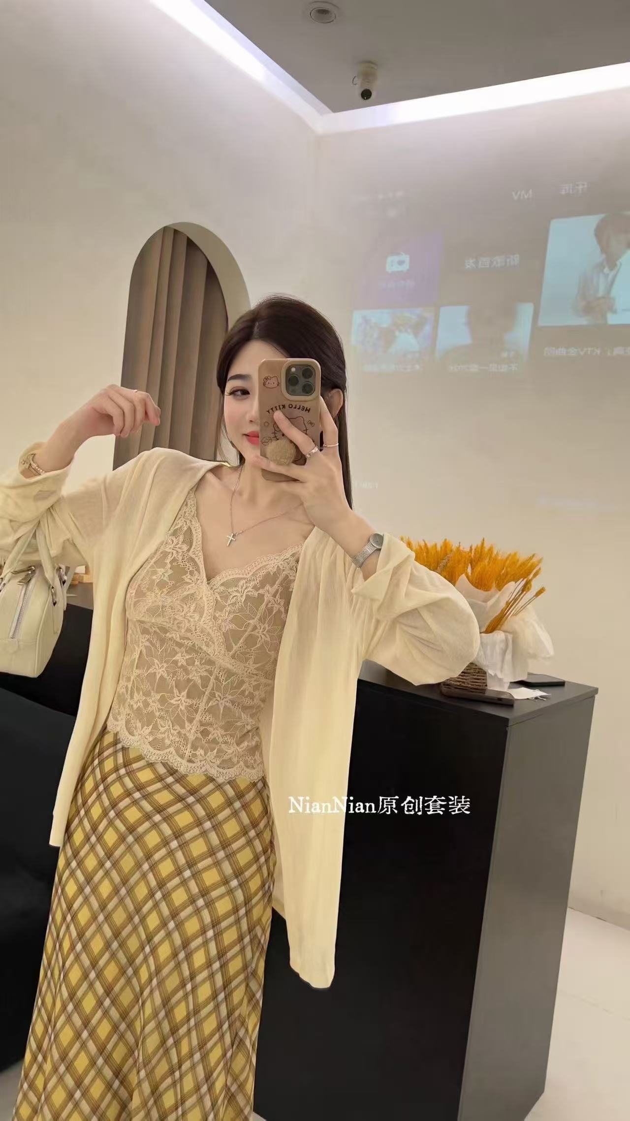 새로운 한 부서 패션 부드러운 바람 오픈 가디건 체크무늬 휴가 바람 V넥 행침 목 슬립 점프 슈트 치마 세트